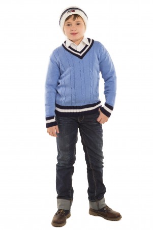 Превосходный джемпер для мальчиков. Горловина, края рукава и низ изделия оригинально оформлены в полоску контрастного цвета. Изделие отлично подойдет как для повседневных случаев, так и для нарядных. Состав: 30% шерсть, 70% акрил.