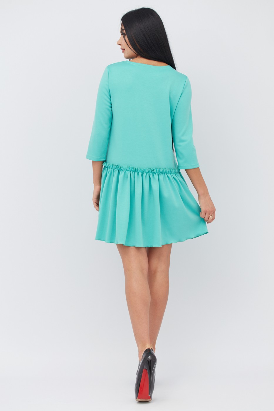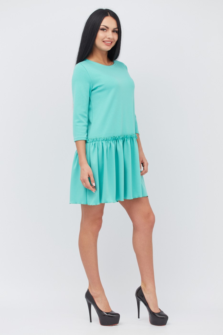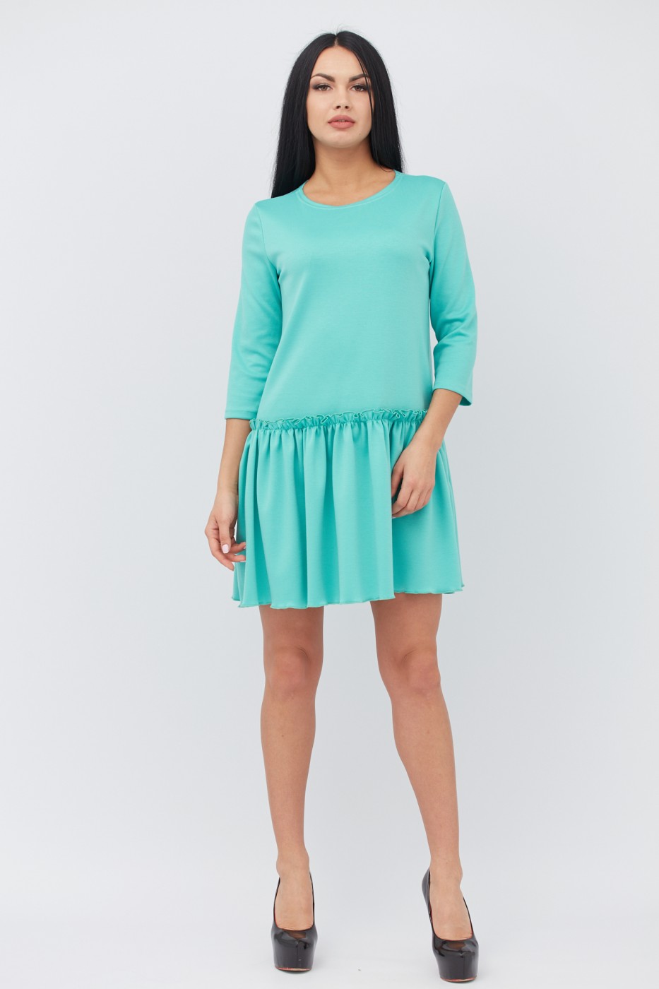 Платье из французского трикотажа оригинального свободного покроя. Юбка в складки. Рукав 3/4. Длина изделия от 85 до 95 см. в зависимости от размера.