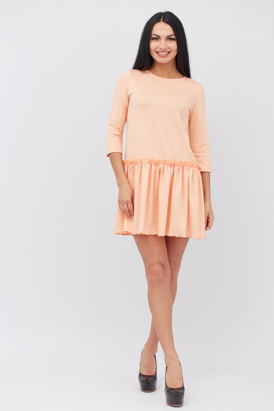 Платье из французского трикотажа оригинального свободного покроя. Юбка в складки. Рукав 3/4. Длина изделия от 85 до 95 см. в зависимости от размера.