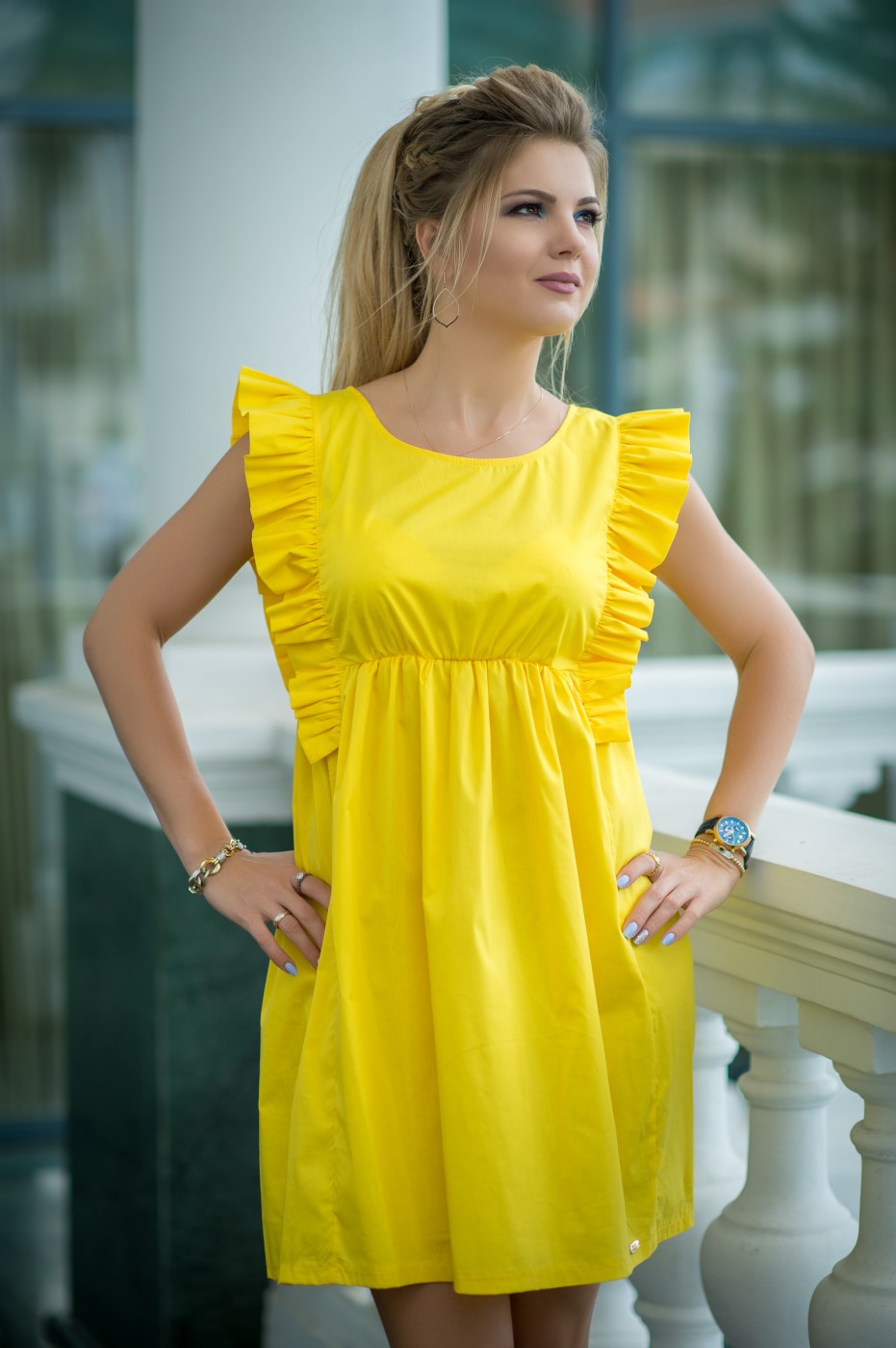 Летнее платье А-силуэта с завышенной талией под резинку. Выполнено из натурального хлопка. Длина 89 см.