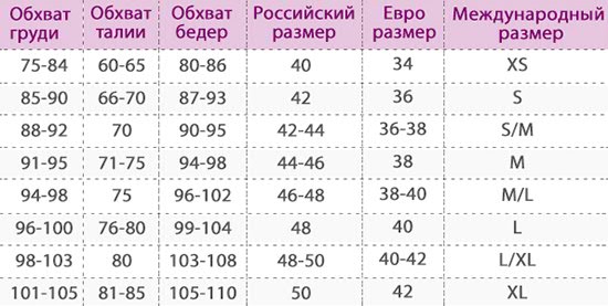 | Обхват грудей, см | 78 | 80 | 85 | 88 | 92 | 95 | 98 | 100 | 105 | 110 |