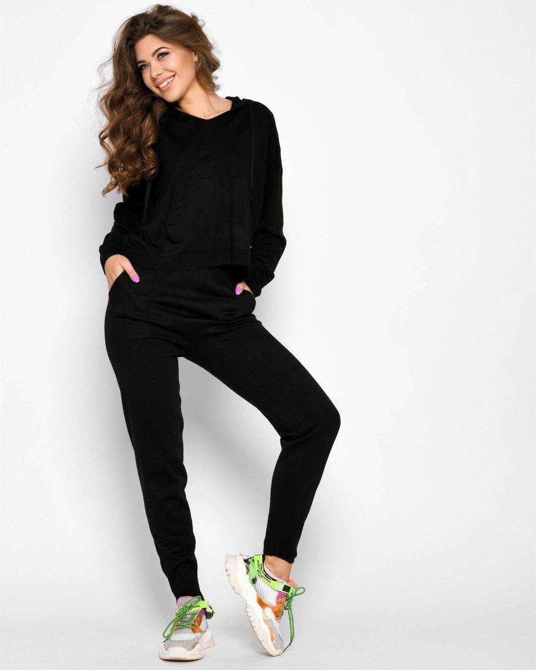 Вязаный костюм-двойка. Худи имеет v-образный вырез и капюшон, длинный рукав со спущенной линией плеча. Спинка удлиненная, спереди карман-кенгуру. Брюки с широкой резинкой на талии, штанины с манжетами. По бокам накладные карманы. Это легкий и удобный костюм на каждый день. Рост модели: 167 см