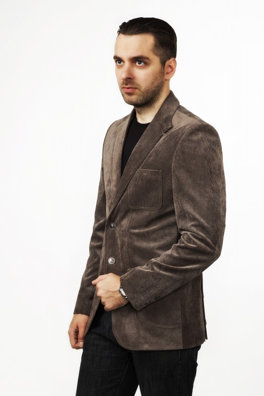 Мужской пиджак полуприлегающего силуэта. Центральная застежка на 2 кнопки. Полочка оформлена фигурным рельефом, по которому проложены отделочные строчки (0,2-0,5). На полочке имеется нагрудный карман прямоугольной формы с закругленными углами и двумя отделочными строчками по краю кармана (0,2-0,5), а также боковые накладные карманы квадратной формы и одним закругленным углом и отделочными строчками(0,2-0,5) по нему. Верхний воротник пиджака ассиметричен. На левой удлиненной его части расположена декоративная петля. По отлету лацкана и воротника проложены отделочные строчки (0,2-0,5). Рукава втачные двухшовные, с рабочими шлицами, на которых расположены по 2 кнопки. На локтевой части рукава присутствует накладной налокотник овальной формы, с двумя отделочными строчками по краю. Спинка со средним швом и рельефами, внизу которых обработаны шлицы.