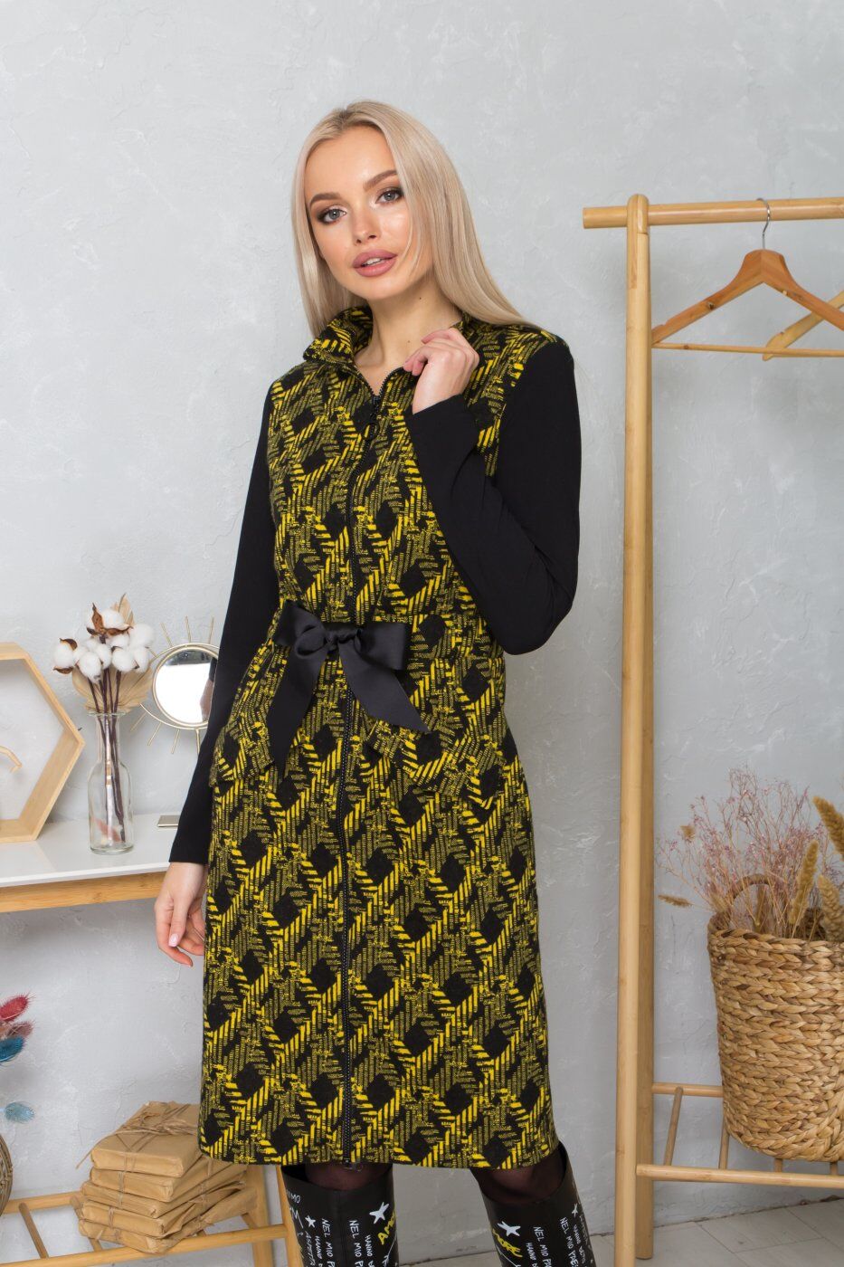 Платье из жаккарда принт «Ромб» с молнией вдоль всей длины и воротником-стойкой. Рукава выполнены из двунитки. Полочка декорирована клапанами, имитирующими карманы. Дополнена модель широкой кулиской с лентой в поясе и погонами на плечах.
