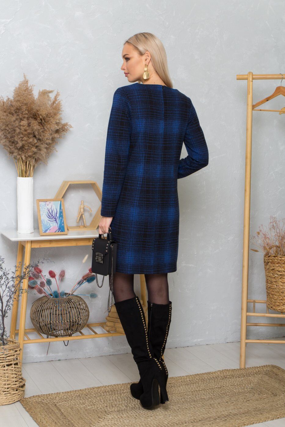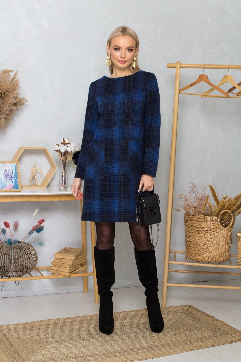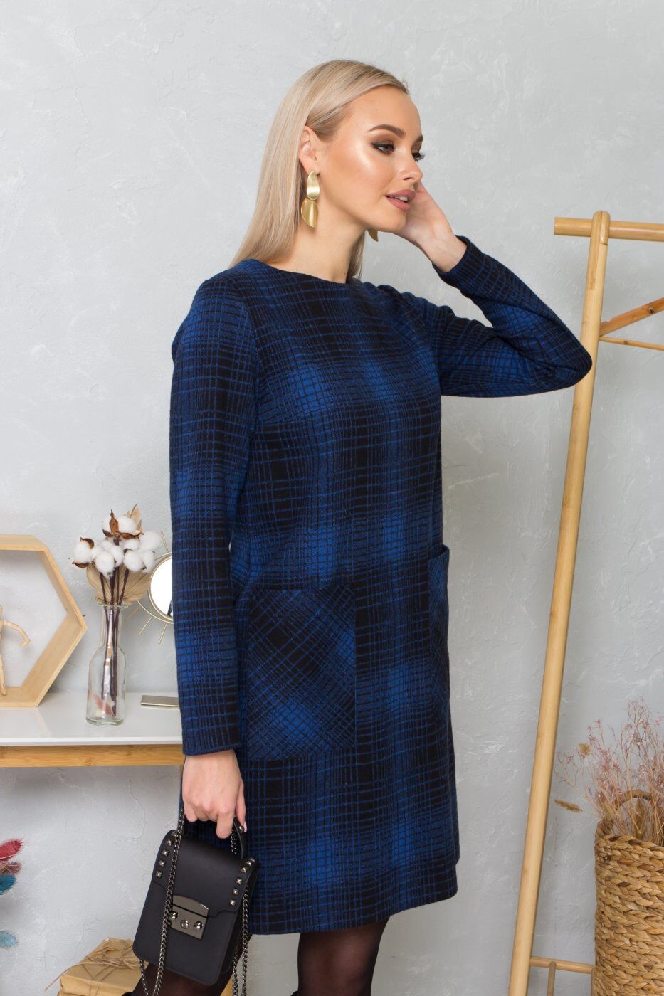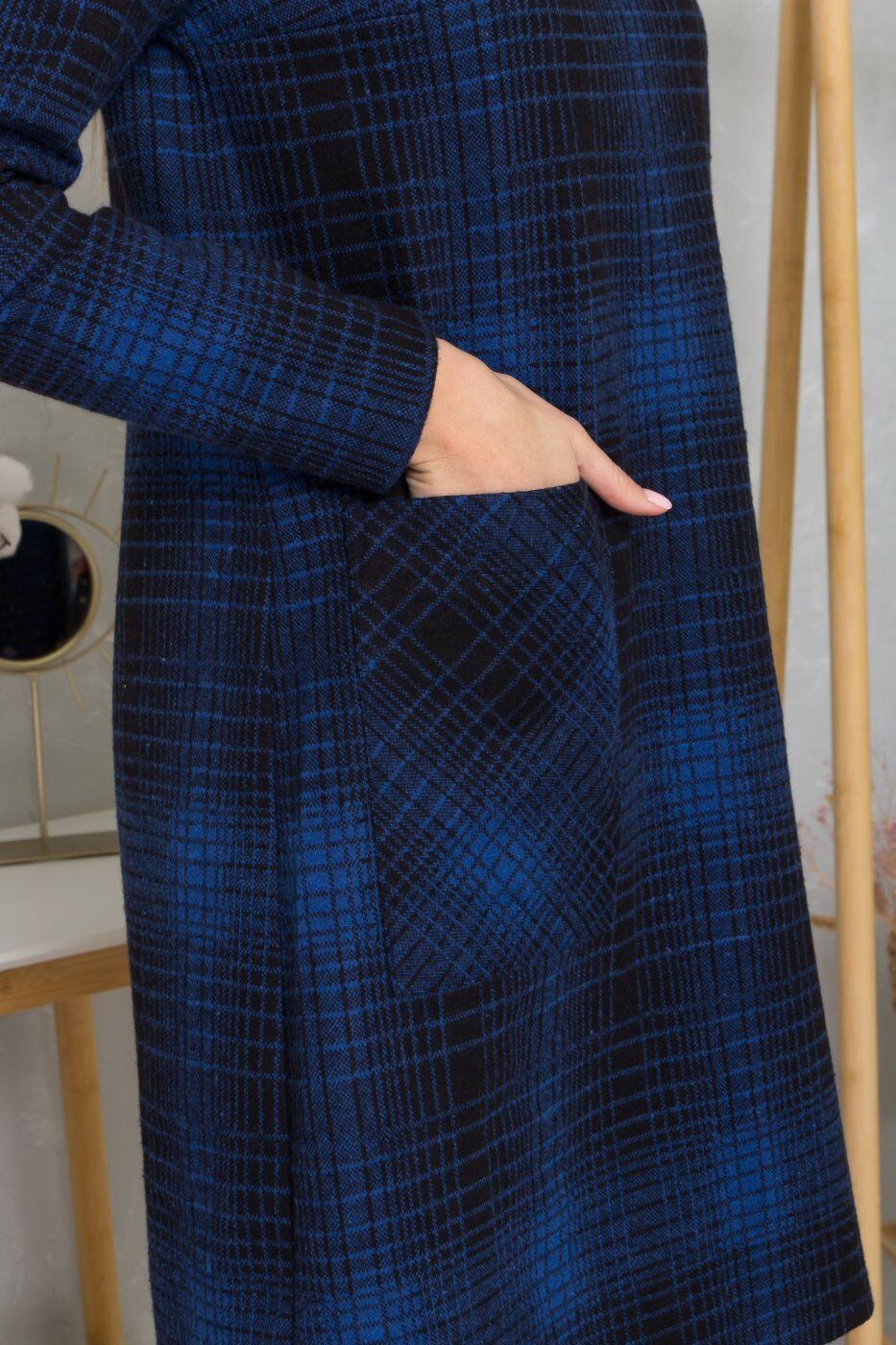 Платье прямого кроя, приталенное по спинке. Два прямоугольных кармана. Рукав длинный. Длина платья до колен.