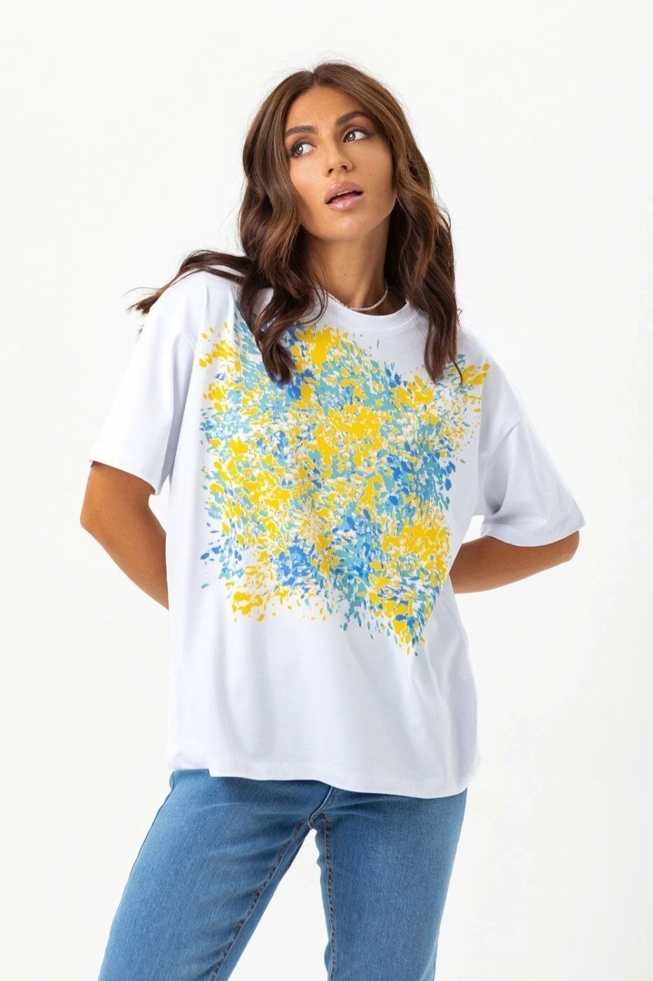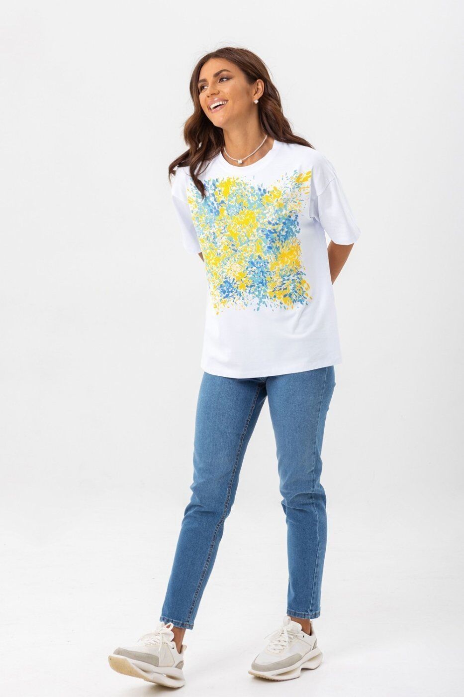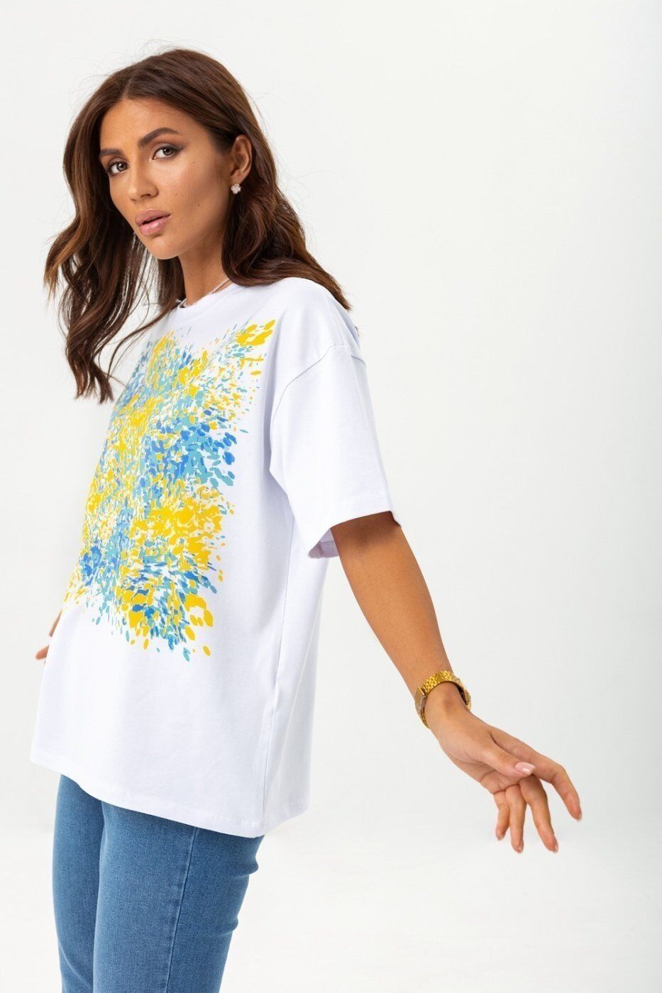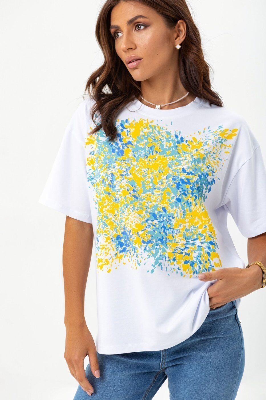 Футболка белого цвета с абстрактными пятнами, напоминающими цветы в украинском поле. Рисунок нанесен на ткань методом сублимации, когда краска под большим давлением и высокой температурой впечатывается около волокна. Такая футболка не ленит и долго сохраняет интенсивность цвета. Модель сделана из 100% хлопка. Не просвечивается.