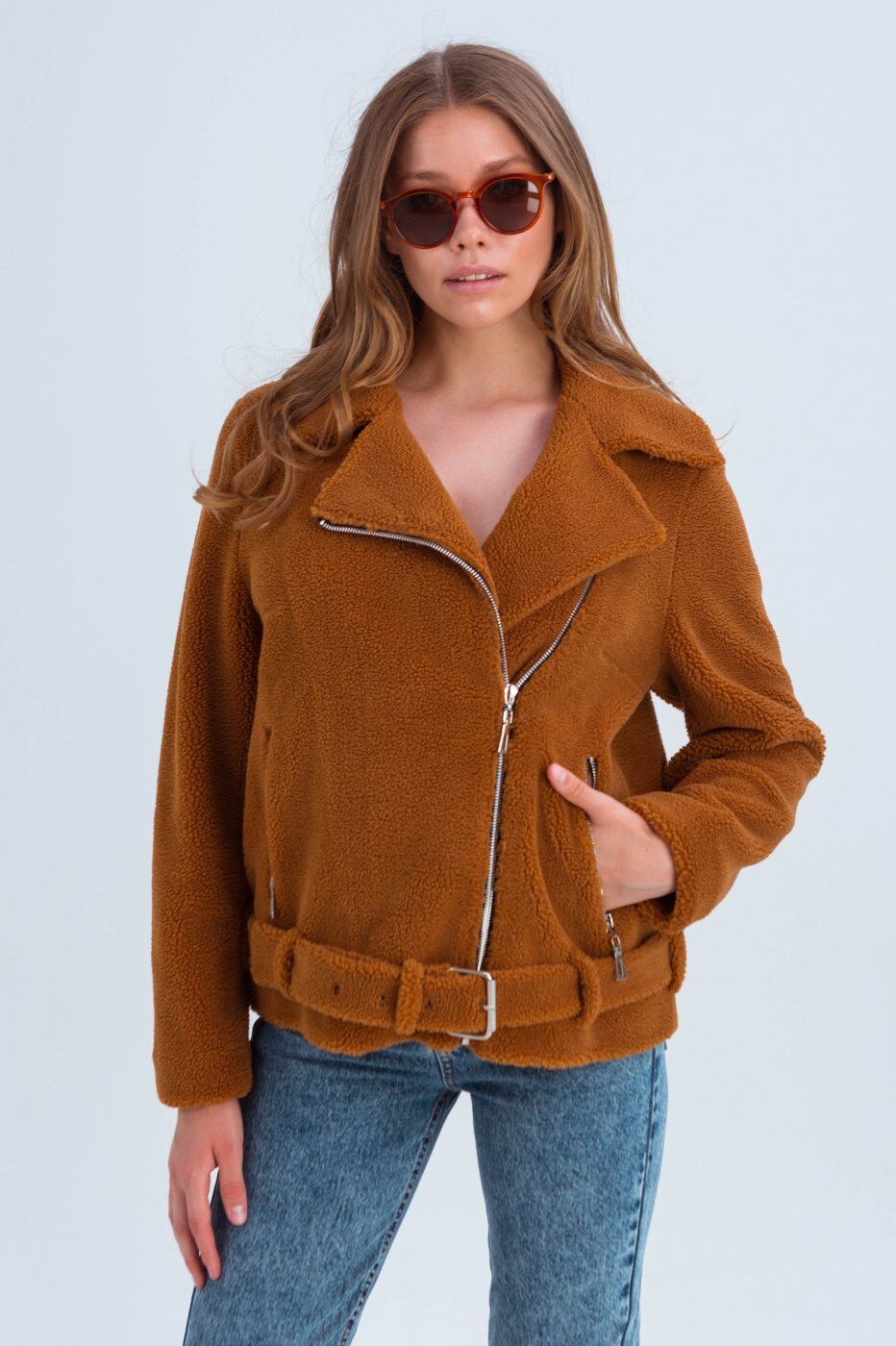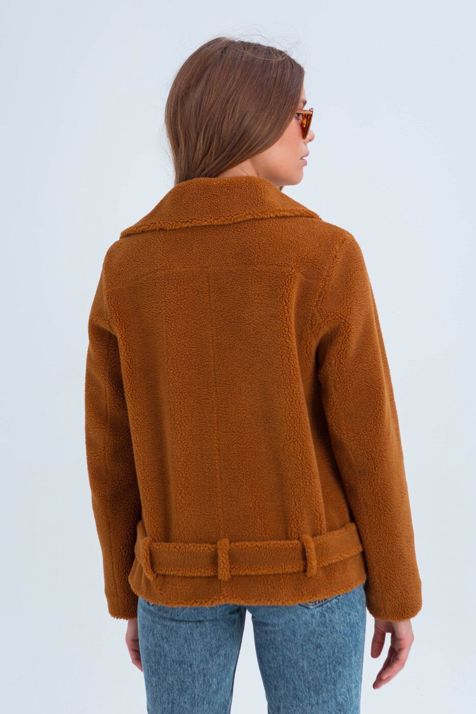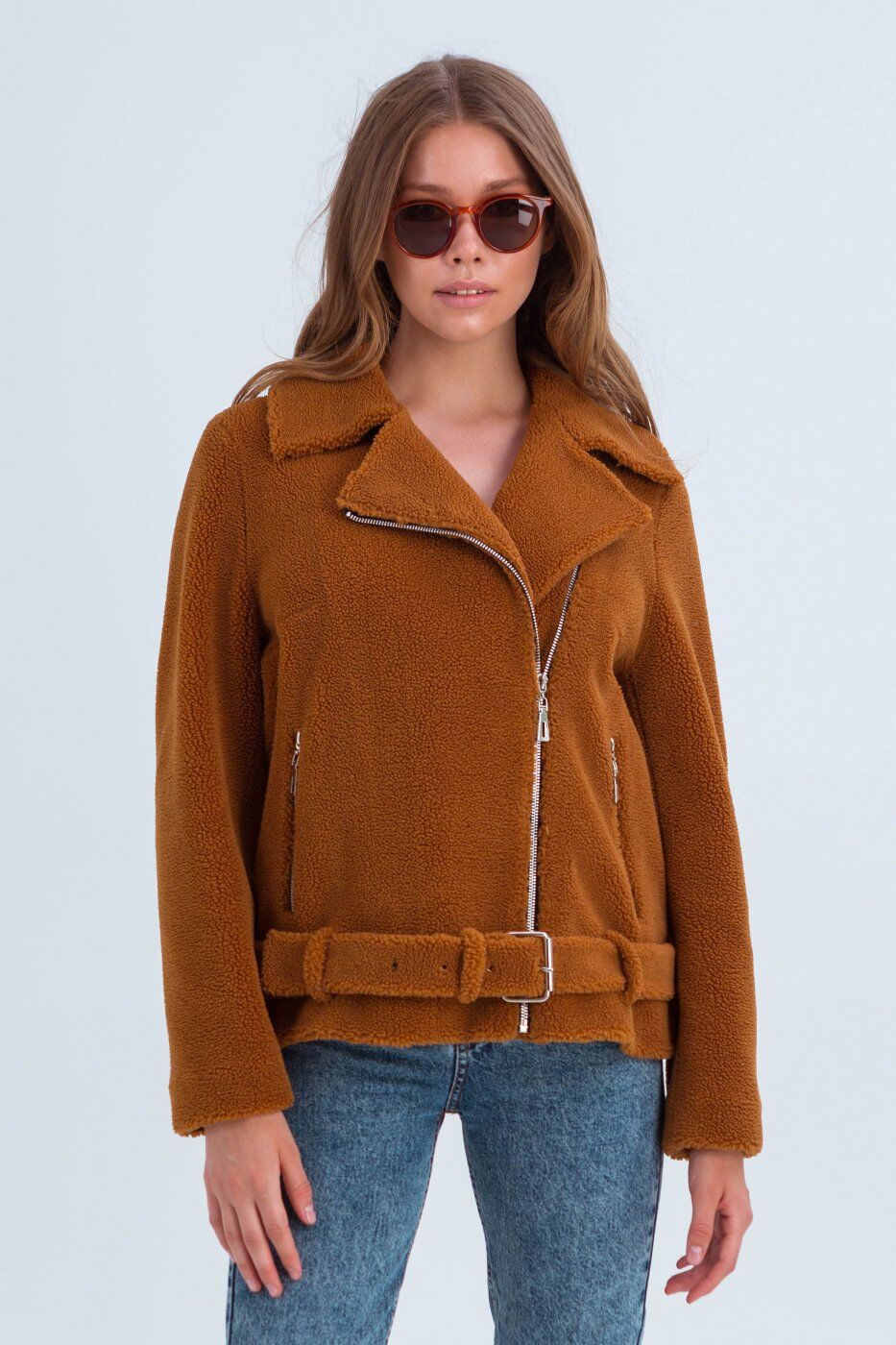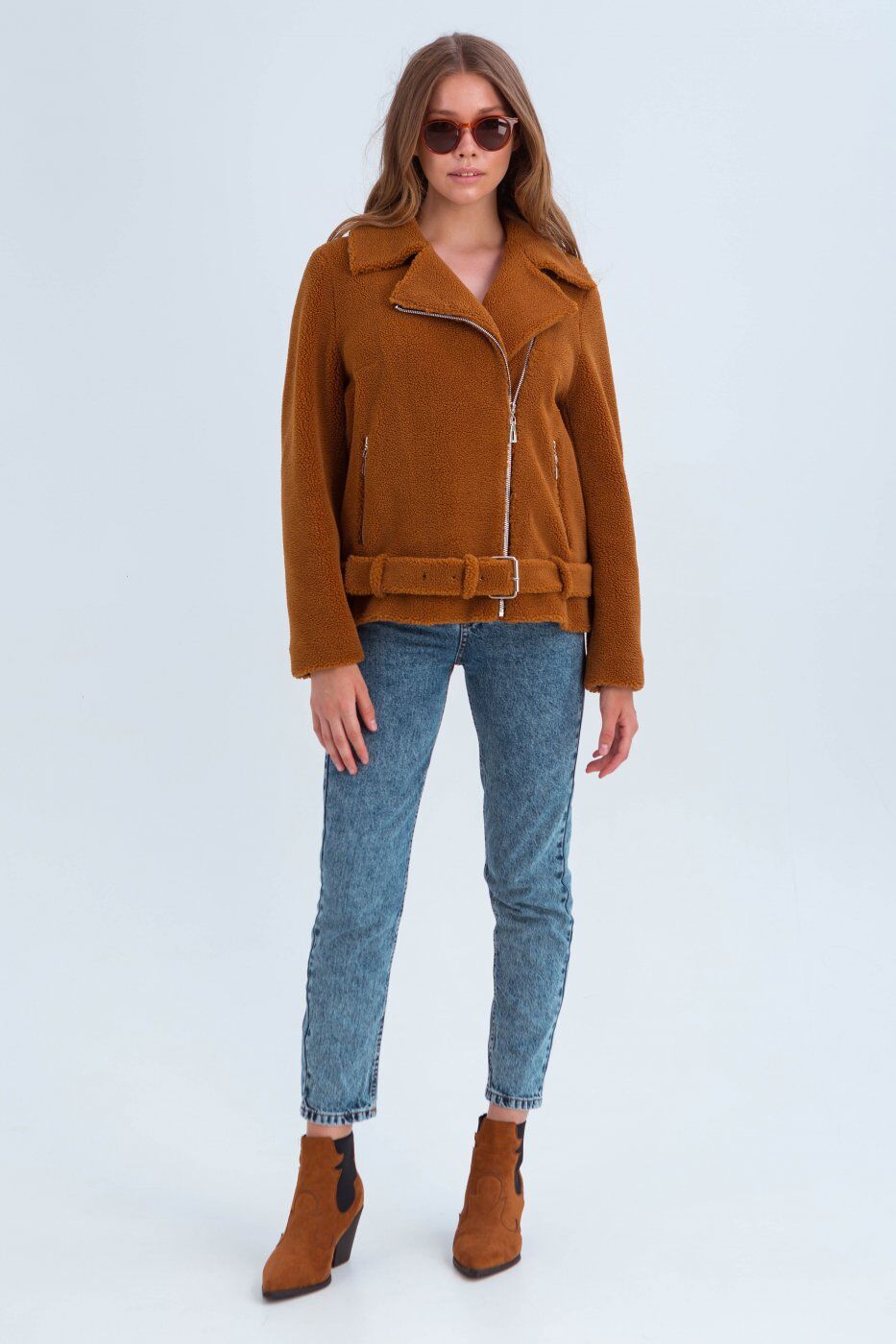 Прямой силуэт. Воротник дубленки отложной, рукава приспущены. Застежка – металлическая косая молния. Карманы на такой же застежке. Дубленка с поясом по низу.