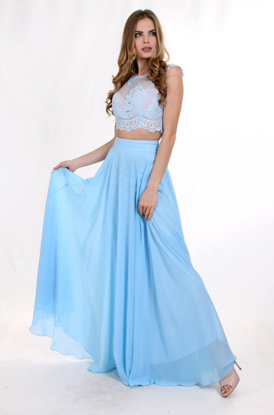 Вечернее платье в виде гипюрового топа с коротким рукавом и юбки из шифона G0839_1 от Enigma