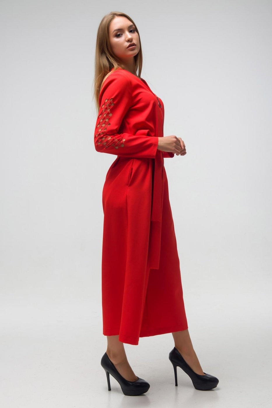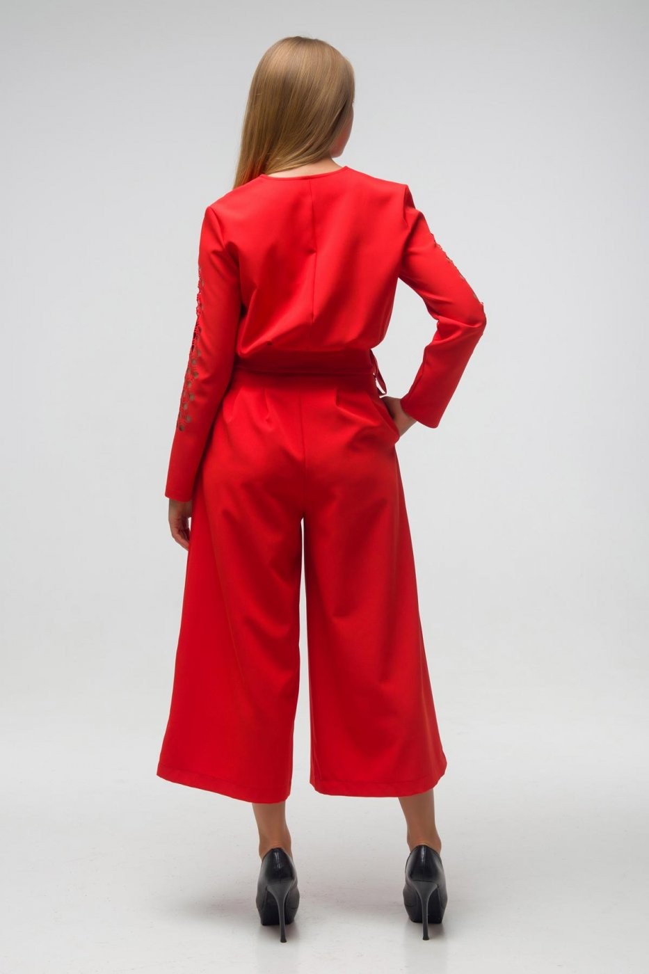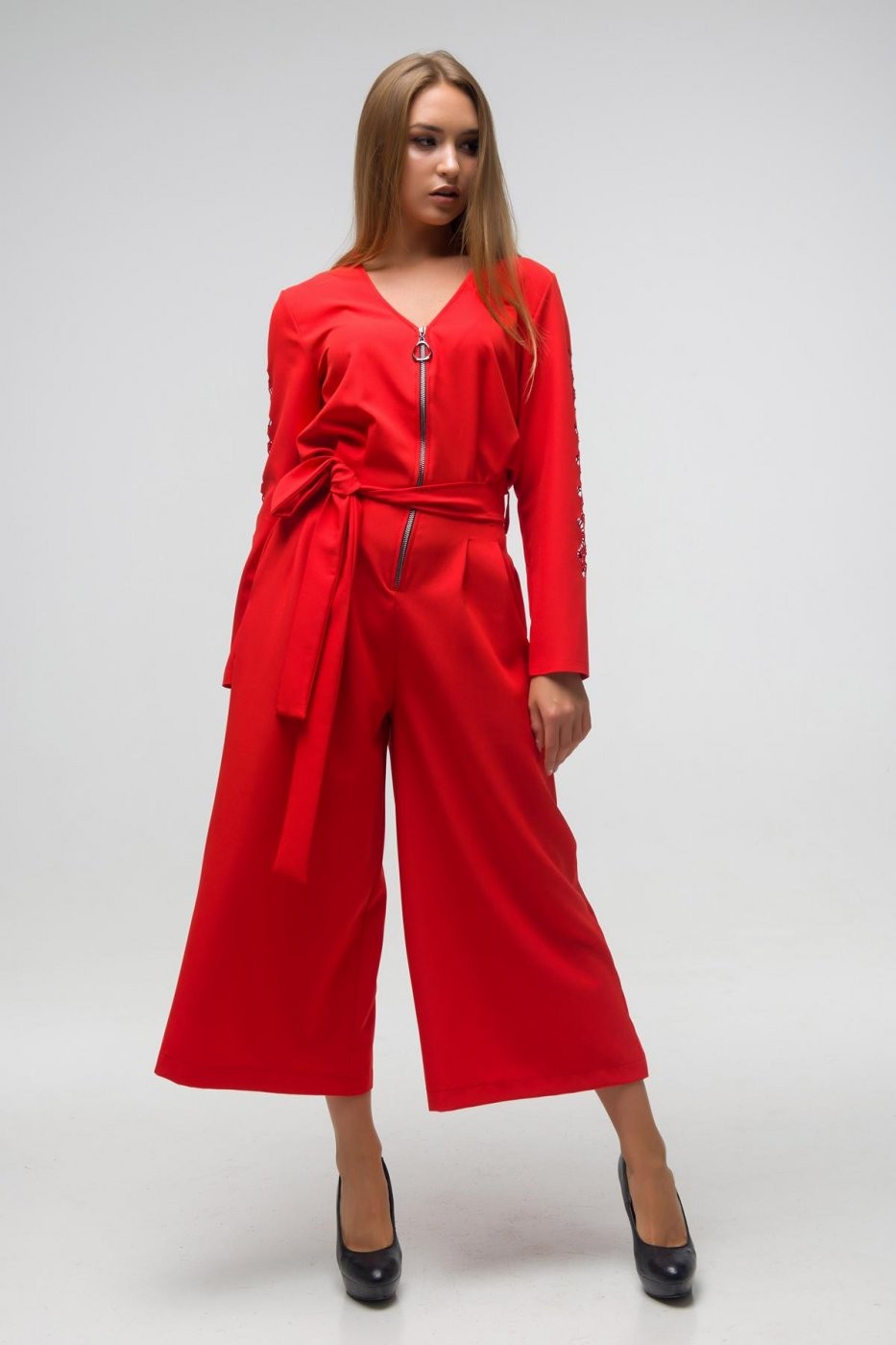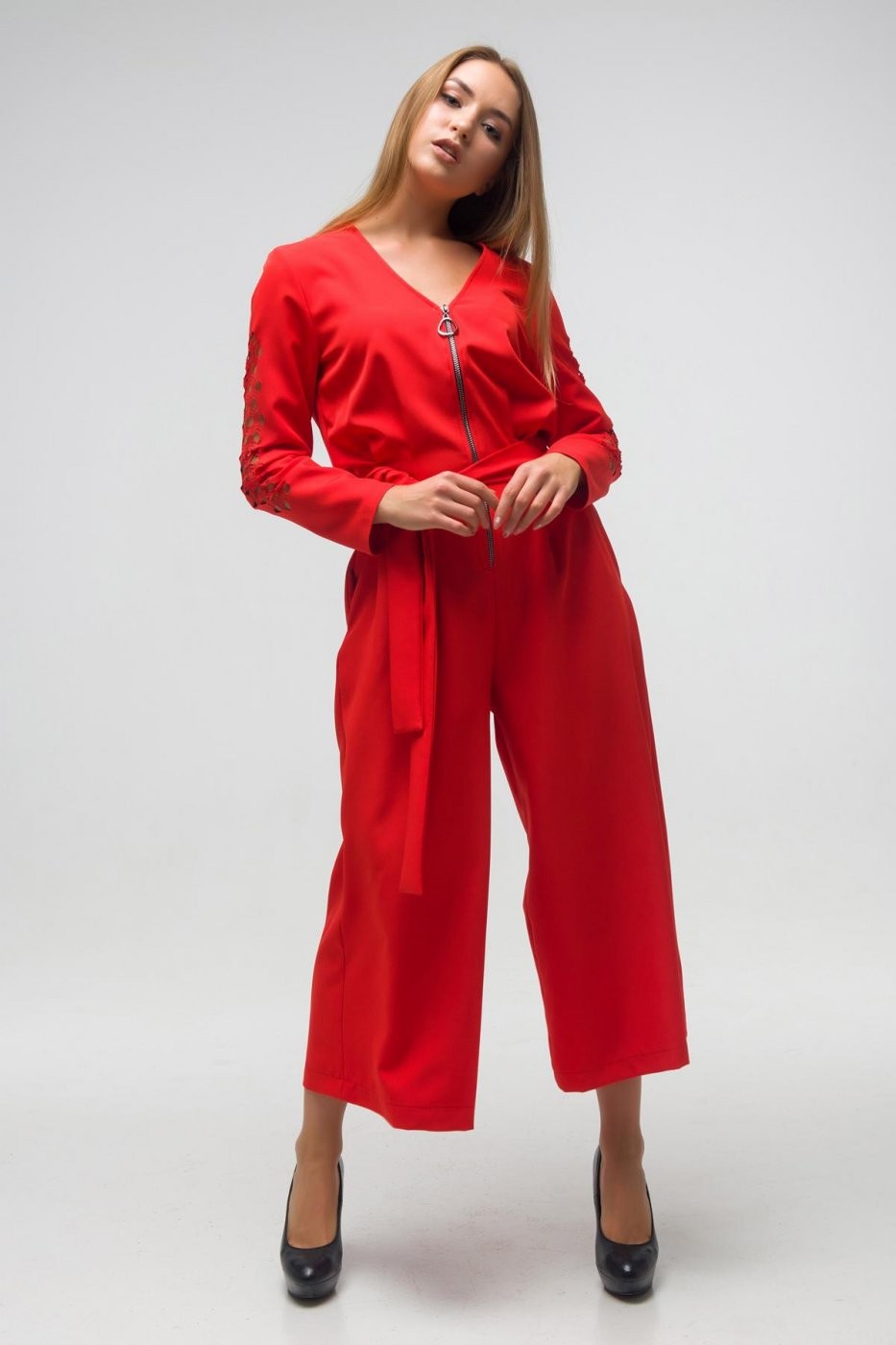 Современный дизайнерский комбинезон с укороченными брюками-клеш. Выполнен из костюмной ткани. Вырез горловины треугольный. Застегивается комбинезон спереди на молнию. Линия талии дополнена складками, что визуально делает ее еще более тонкой. В комплекте идет пояс в тон. Есть карманы. Рукава 3/4, декорированы перфорацией.