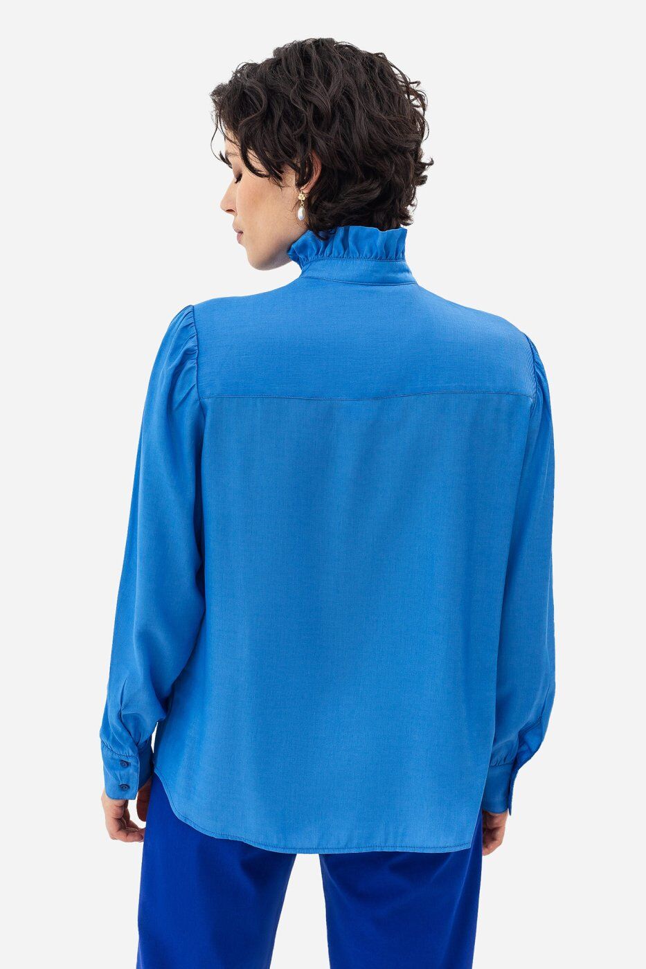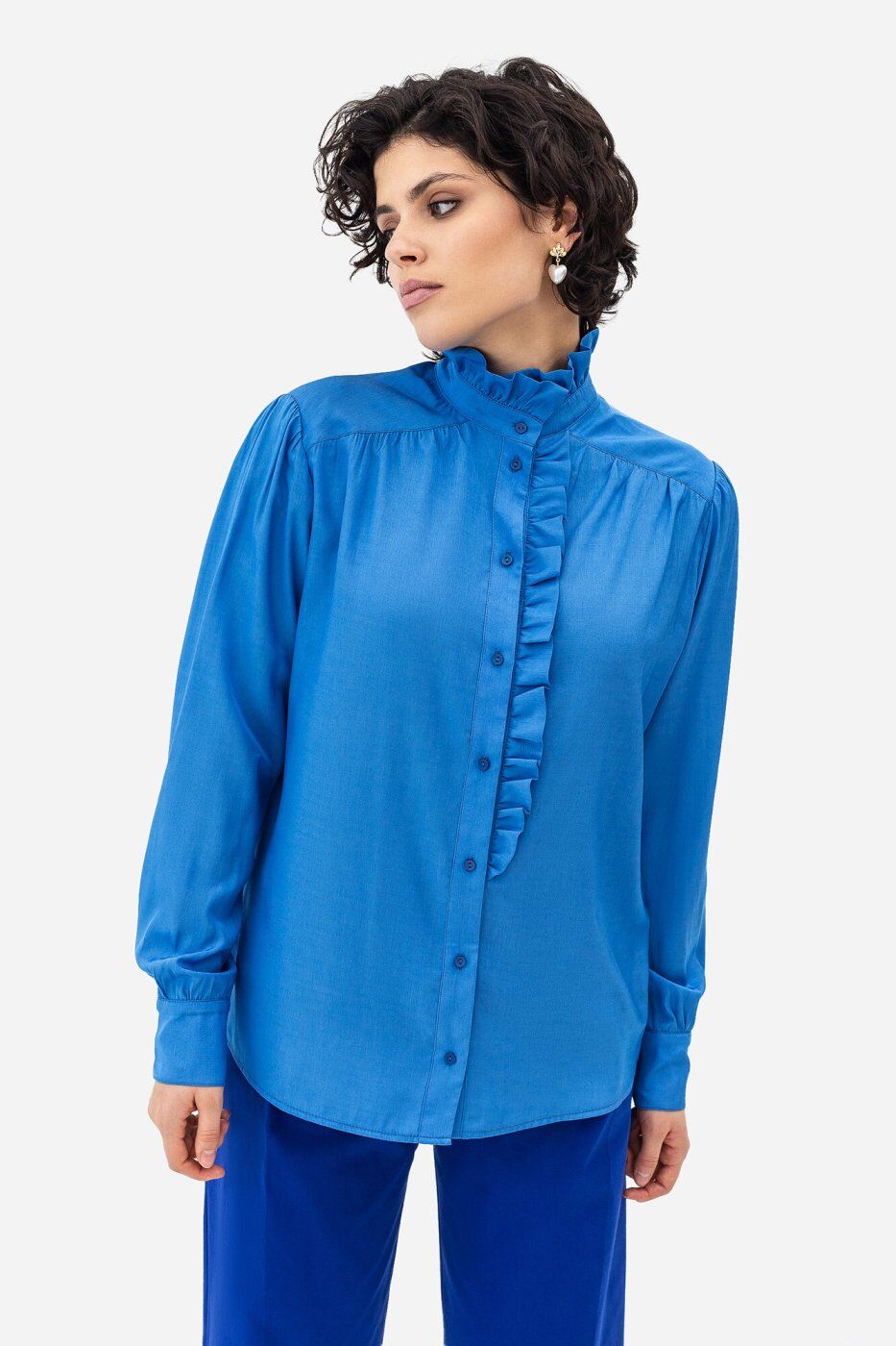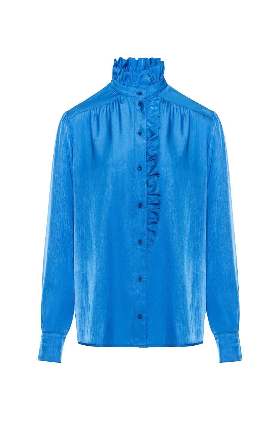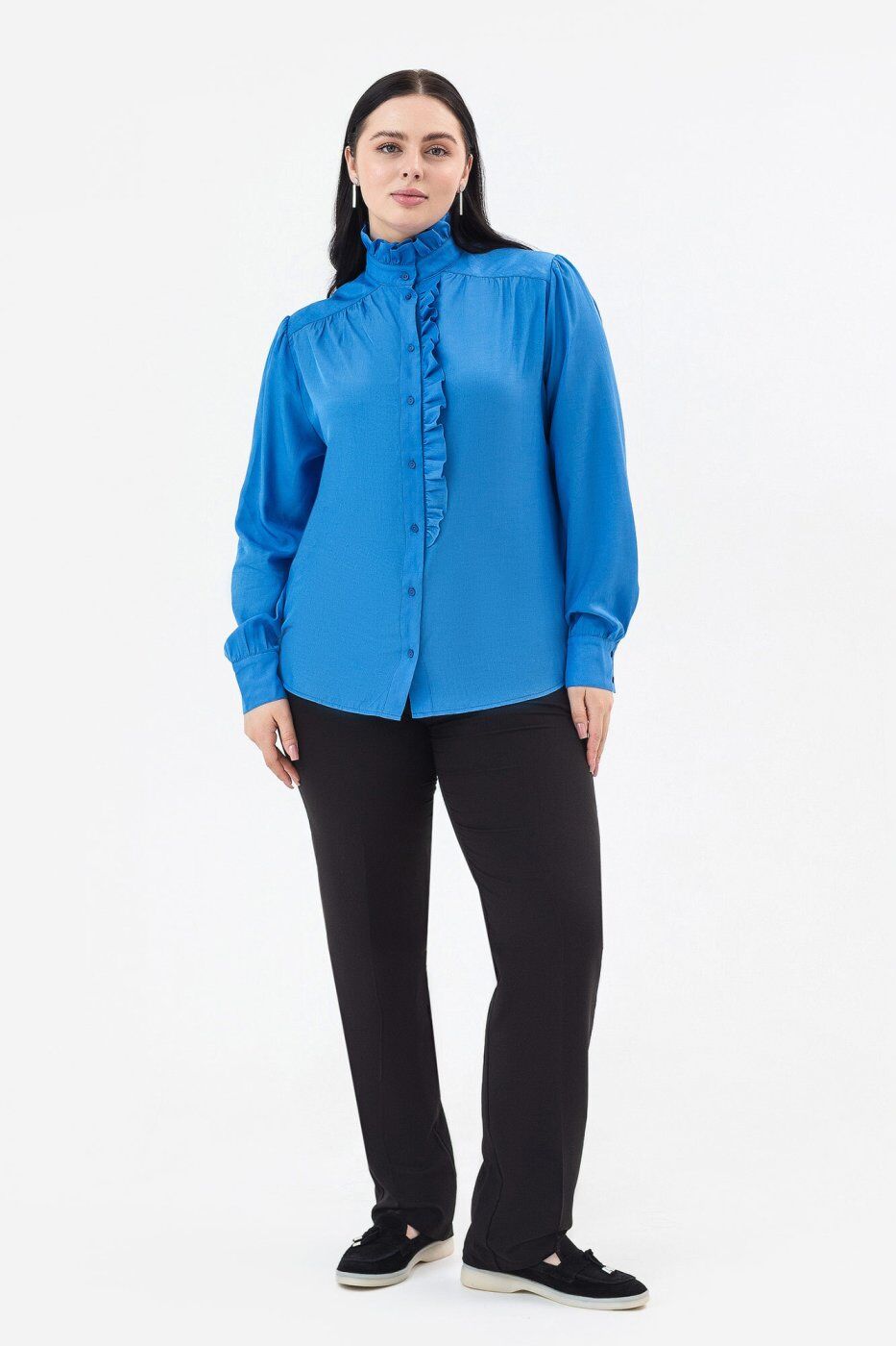 **Матеріал:** сорочкова тканина.\n**Параметри розмірів в розкладеному вигляді:**\n| Розміри| S | M | L | XL | 2XL | 3XL | 4XL |\n|:-----------------------------------------|:---:|:---: |:---:|:---:|:---:|:---:|:---:|\n| Довжина рукава від плеча (см)| 60 | 61 | 62 | 63 | 63 | 64 | 65 |\n| Обхват по грудях (см) | 110 | 114 | 118 | 122 | 126 | 130 | 134 |\n| Обхват стегон (см) | 108 | 112 | 116 | 120 | 124 | 128 | 128 |\n| Довжина виробу по центру спини (см) | 64 | 65 | 66 | 67 | 67 | 68 | 69 |\n* Розтяжність - немає.\n**Блуза JANE**\n \n* Блуза жіноча, виконана в класично - романтичному стилі, прямого силуету.\n* Покрій - вшивний рукав.\n* Лінія плеч — на природному місці.\n* По плечовому поясу зпроектовано перехідну подвійну кокетку, яка з\'єднуються зі спинкою і пілочками зі зборками.\n* Застібка - центральна, наскрізна, з настрочними планками, на петлі та гудзику.\n* Зліва під планку вставлена оборка, до рівня лінії талії.\n* Горловина оброблена пришивною стійкою, з оборкою по верхньому краю.\n* Рукав наповненої форми.\n* По окату та низу — зборки.\n* Рукав закінчується пришивними манжетами, що з\'єднуються з низом рукава, в якому окантовано розріз для застібки.\n* Манженти застібаються на дві петлі та гудзики.\n* Низ оброблено швом впідгин з обметаним зрізом, наскрізною строчкою.\n* Матеріал - сорочкова тканина.