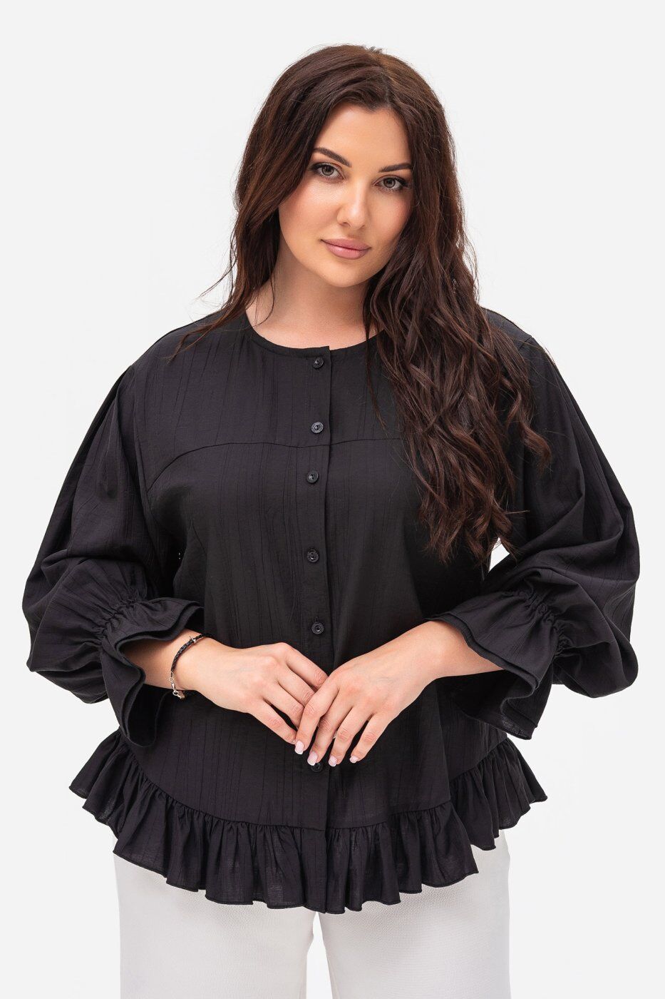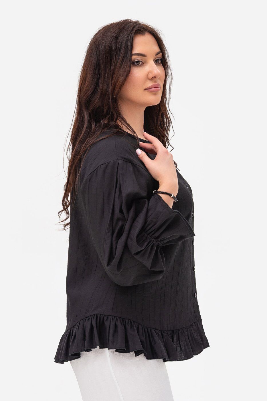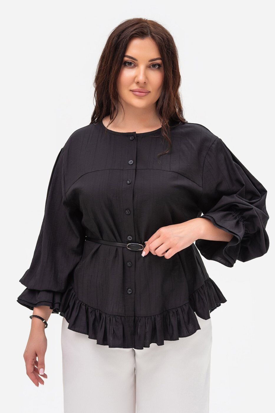 ** Матеріал: ** штапель жатка._x000A_** Розтяжність: ** не має._x000A_| Розміри | S | M | L | XL | 2XL | 3XL | 4XL | 5XL |_x000A_|:-----------------------------------------|:---:|:---:|:---:|:---:|:---:|:---:|:---:|_x000A_| Довжина рукава від плеча (см) | 60 | 60 | 60 | 60 | 60 | 60 | 60 | 60 |_x000A_| Довжина виробу по центру спини (см) | 65 | 65 | 65 | 65 | 65 | 65 | 65 | 65 |_x000A_| Ширина по лінії грудей (см) | 50 | 53 | 56 | 59 | 62 | 65 | 68 | 71|_x000A_** Легка жіноча блуза з рюшами **_x000A_* Повітряна блуза вільного силуету з фактурної тканини створена для вашого комфорту й легкості._x000A_* Не мнеться, приємна до тіла._x000A_* Рюші по низу та на рукавах додають образу грайливості та витонченості._x000A_** Силует: ** вільний._x000A_** Горловина: ** кругла._x000A_** Застібка: ** планка на гудзиках спереду._x000A_** Деталі: ** рюша по низу виробу та на рукавах._x000A_** Тканина: ** легка, з текстурною поверхнею, не мнеться._x000A_* Ідеально поєднується з джинсами, короткими шортами та спідницями, брюками — для офісу, прогулянки або відпочинку.Термін збору замовлення складає від 1 до 7 робочих днів. Докладніше
