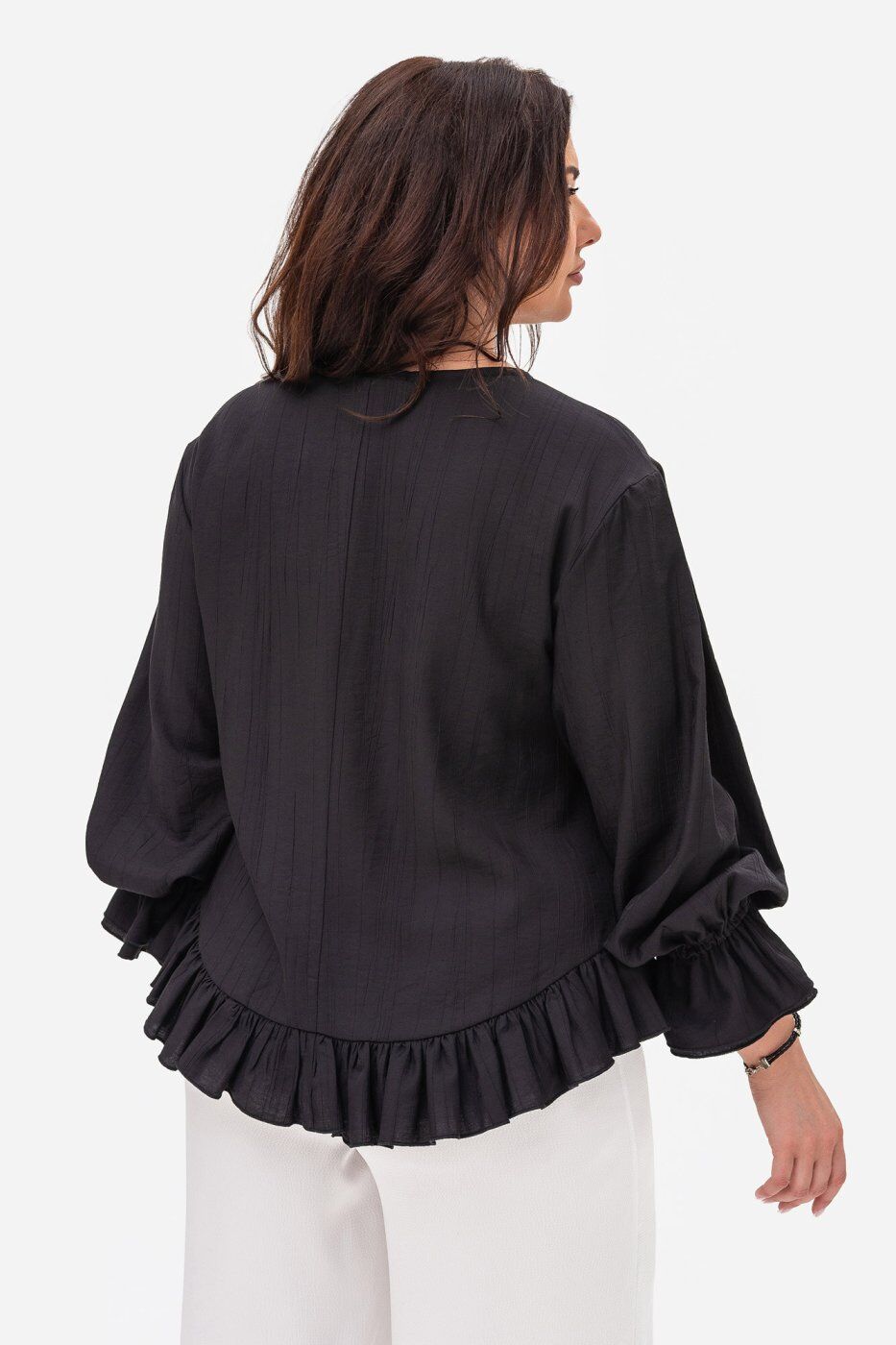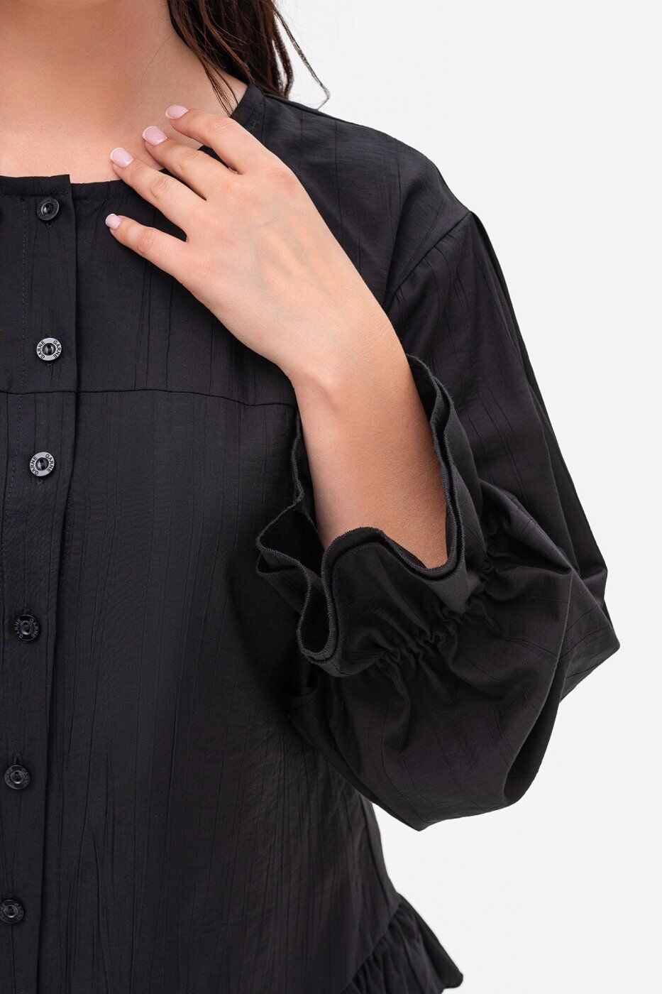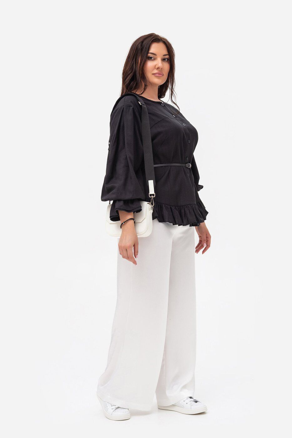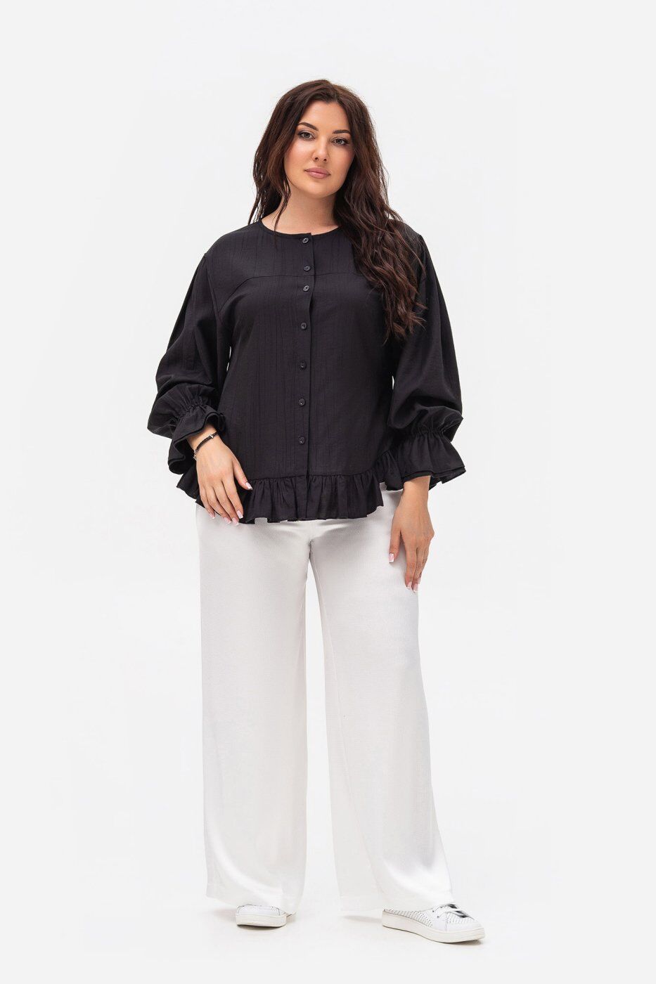 ** Матеріал: ** штапель жатка._x000A_** Розтяжність: ** не має._x000A_| Розміри | S | M | L | XL | 2XL | 3XL | 4XL | 5XL |_x000A_|:-----------------------------------------|:---:|:---:|:---:|:---:|:---:|:---:|:---:|_x000A_| Довжина рукава від плеча (см) | 60 | 60 | 60 | 60 | 60 | 60 | 60 | 60 |_x000A_| Довжина виробу по центру спини (см) | 65 | 65 | 65 | 65 | 65 | 65 | 65 | 65 |_x000A_| Ширина по лінії грудей (см) | 50 | 53 | 56 | 59 | 62 | 65 | 68 | 71|_x000A_** Легка жіноча блуза з рюшами **_x000A_* Повітряна блуза вільного силуету з фактурної тканини створена для вашого комфорту й легкості._x000A_* Не мнеться, приємна до тіла._x000A_* Рюші по низу та на рукавах додають образу грайливості та витонченості._x000A_** Силует: ** вільний._x000A_** Горловина: ** кругла._x000A_** Застібка: ** планка на гудзиках спереду._x000A_** Деталі: ** рюша по низу виробу та на рукавах._x000A_** Тканина: ** легка, з текстурною поверхнею, не мнеться._x000A_* Ідеально поєднується з джинсами, короткими шортами та спідницями, брюками — для офісу, прогулянки або відпочинку.Термін збору замовлення складає від 1 до 7 робочих днів. Докладніше