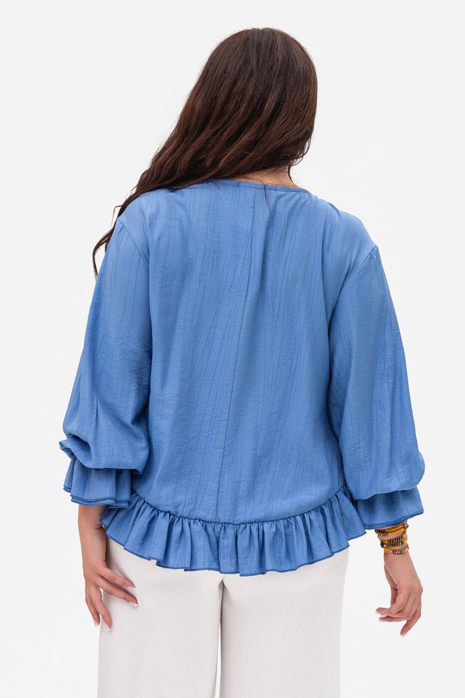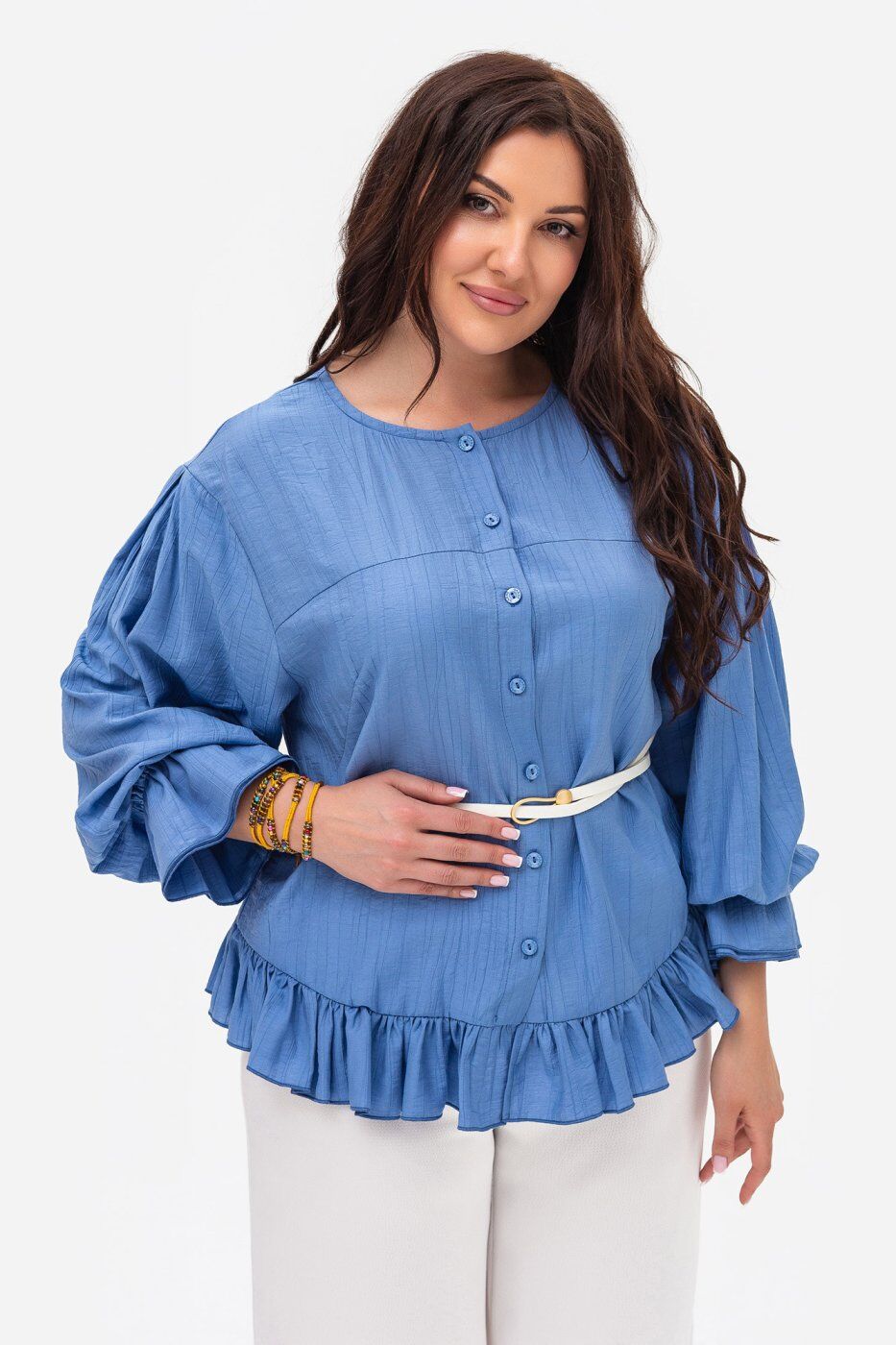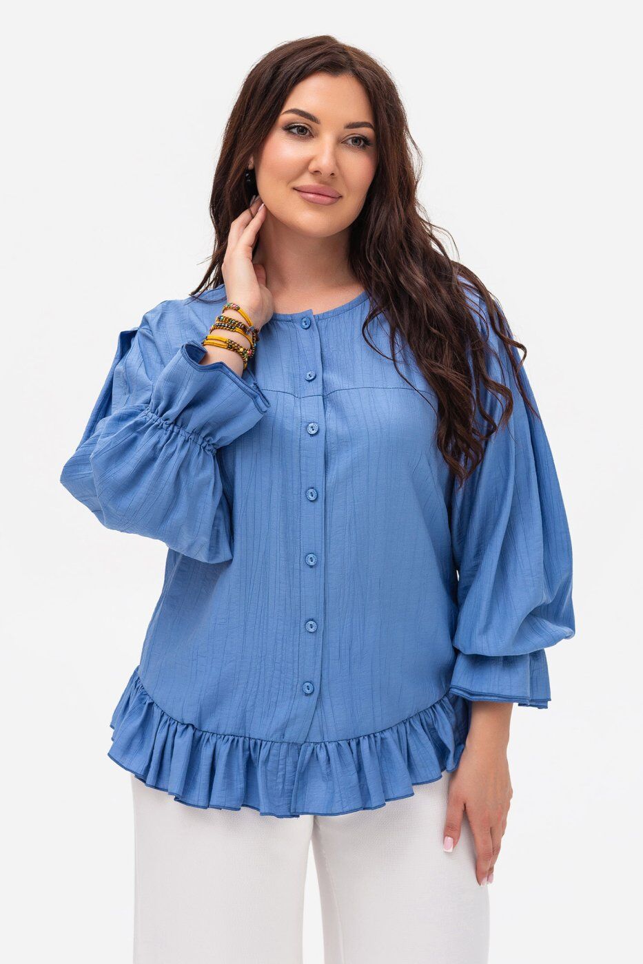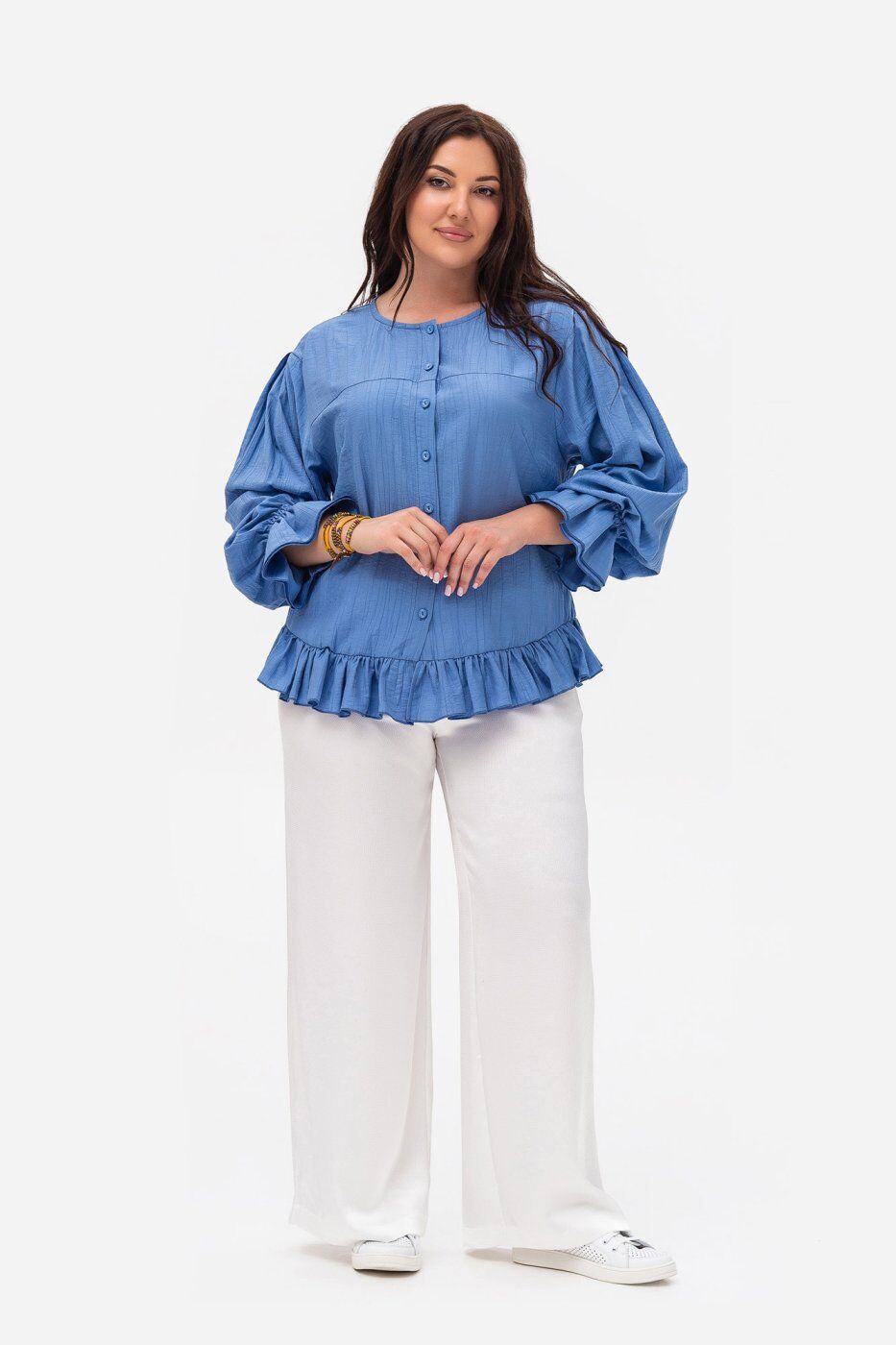 ** Матеріал: ** штапель жатка._x000A_** Розтяжність: ** не має._x000A_| Розміри | S | M | L | XL | 2XL | 3XL | 4XL | 5XL |_x000A_|:-----------------------------------------|:---:|:---:|:---:|:---:|:---:|:---:|:---:|_x000A_| Довжина рукава від плеча (см) | 60 | 60 | 60 | 60 | 60 | 60 | 60 | 60 |_x000A_| Довжина виробу по центру спини (см) | 65 | 65 | 65 | 65 | 65 | 65 | 65 | 65 |_x000A_| Ширина по лінії грудей (см) | 50 | 53 | 56 | 59 | 62 | 65 | 68 | 71|_x000A_** Легка жіноча блуза з рюшами **_x000A_* Повітряна блуза вільного силуету з фактурної тканини створена для вашого комфорту й легкості._x000A_* Не мнеться, приємна до тіла._x000A_* Рюші по низу та на рукавах додають образу грайливості та витонченості._x000A_** Силует: ** вільний._x000A_** Горловина: ** кругла._x000A_** Застібка: ** планка на гудзиках спереду._x000A_** Деталі: ** рюша по низу виробу та на рукавах._x000A_** Тканина: ** легка, з текстурною поверхнею, не мнеться._x000A_* Ідеально поєднується з джинсами, короткими шортами та спідницями, брюками — для офісу, прогулянки або відпочинку.