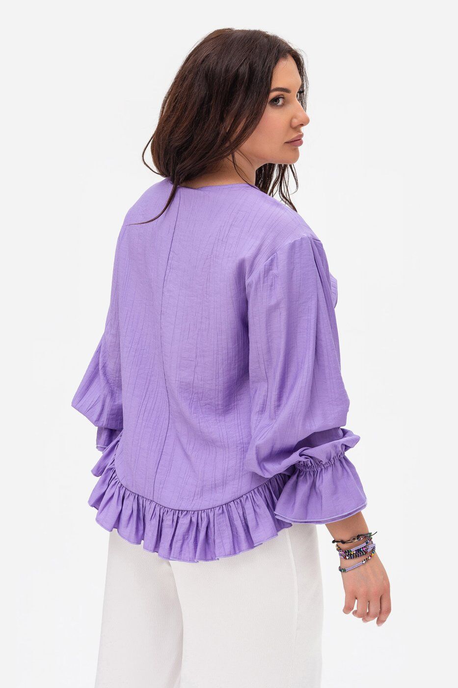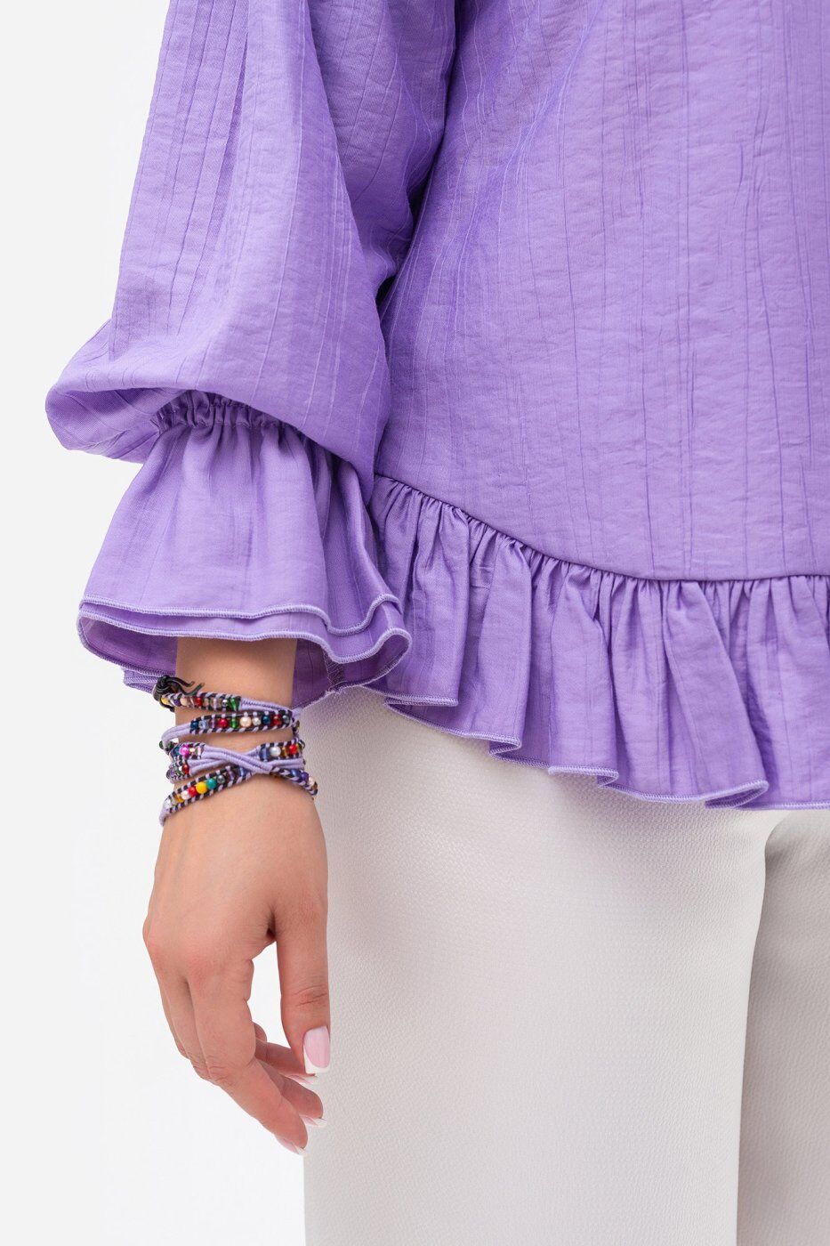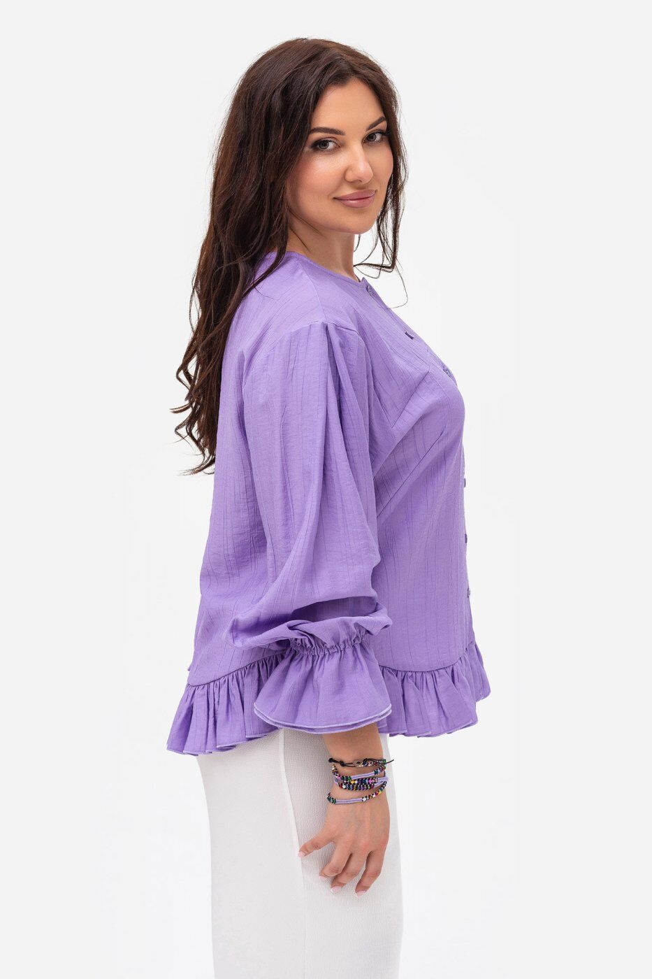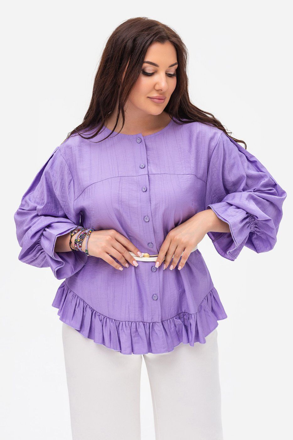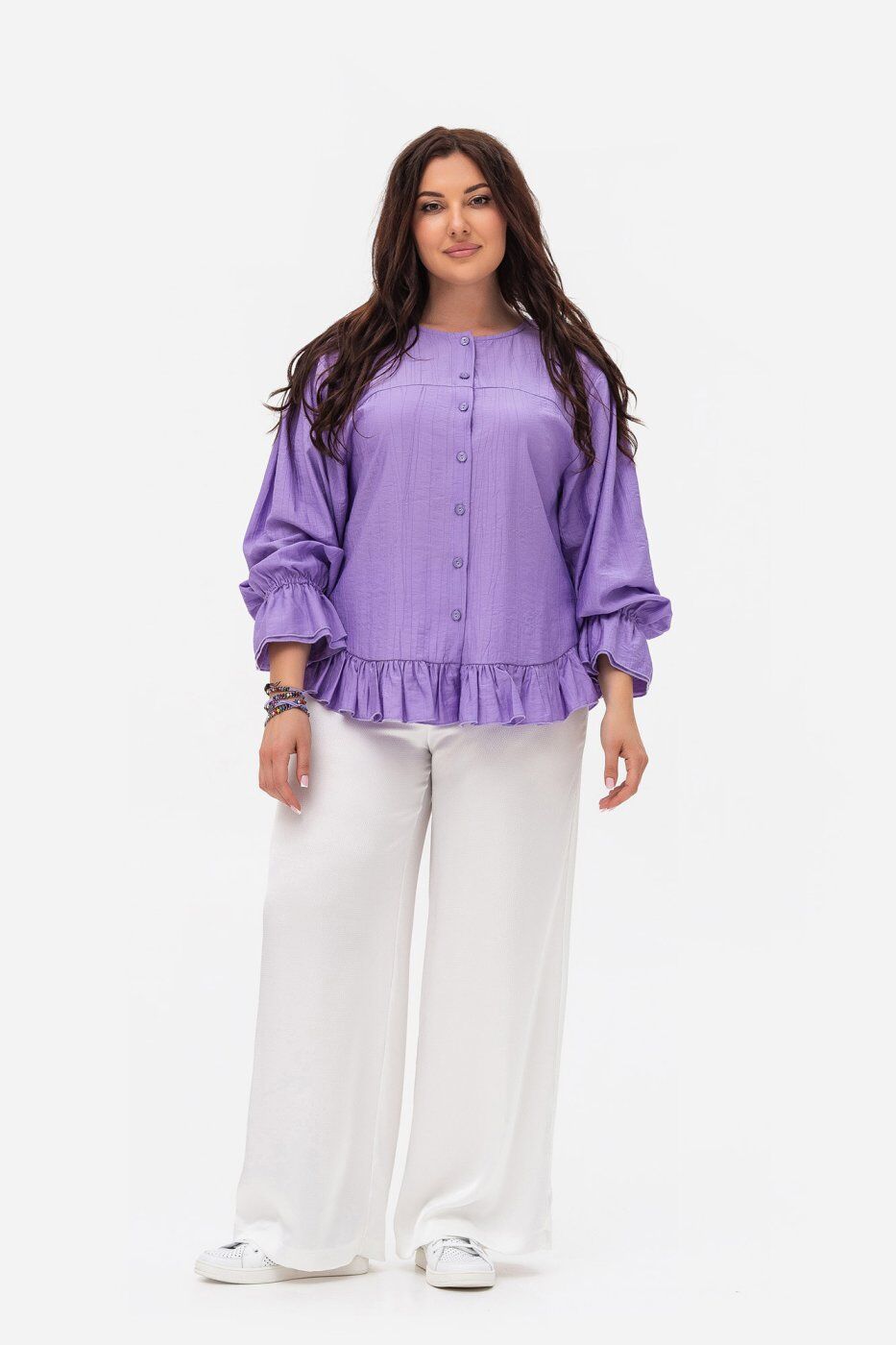 ** Матеріал: ** штапель жатка._x000A_** Розтяжність: ** не має._x000A_| Розміри | S | M | L | XL | 2XL | 3XL | 4XL | 5XL |_x000A_|:-----------------------------------------|:---:|:---:|:---:|:---:|:---:|:---:|:---:|_x000A_| Довжина рукава від плеча (см) | 60 | 60 | 60 | 60 | 60 | 60 | 60 | 60 |_x000A_| Довжина виробу по центру спини (см) | 65 | 65 | 65 | 65 | 65 | 65 | 65 | 65 |_x000A_| Ширина по лінії грудей (см) | 50 | 53 | 56 | 59 | 62 | 65 | 68 | 71|_x000A_** Легка жіноча блуза з рюшами **_x000A_* Повітряна блуза вільного силуету з фактурної тканини створена для вашого комфорту й легкості._x000A_* Не мнеться, приємна до тіла._x000A_* Рюші по низу та на рукавах додають образу грайливості та витонченості._x000A_** Силует: ** вільний._x000A_** Горловина: ** кругла._x000A_** Застібка: ** планка на гудзиках спереду._x000A_** Деталі: ** рюша по низу виробу та на рукавах._x000A_** Тканина: ** легка, з текстурною поверхнею, не мнеться._x000A_* Ідеально поєднується з джинсами, короткими шортами та спідницями, брюками — для офісу, прогулянки або відпочинку.Термін збору замовлення складає від 1 до 7 робочих днів. Докладніше
