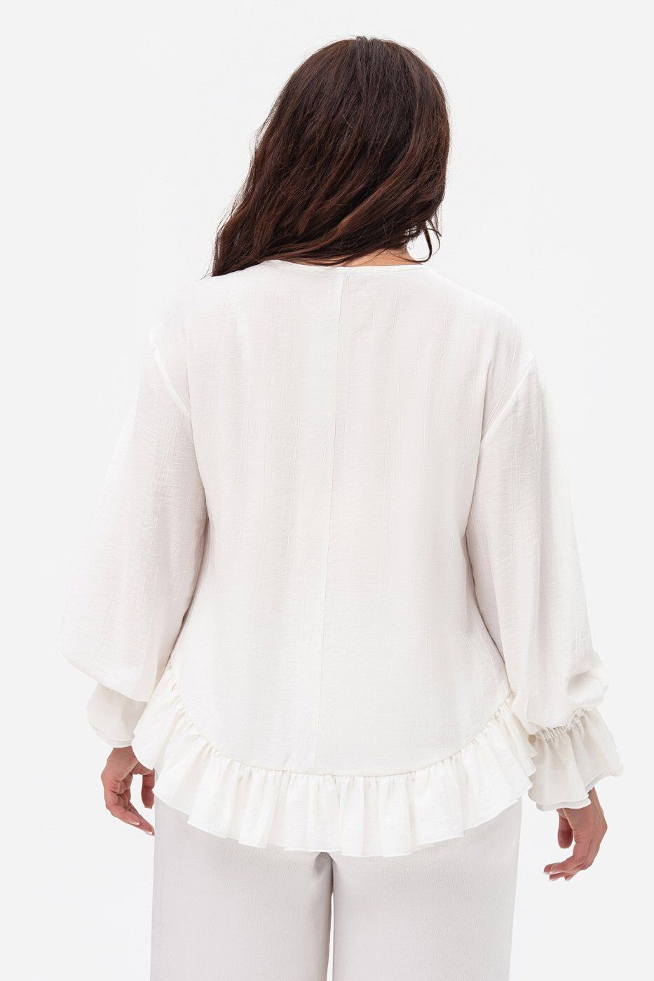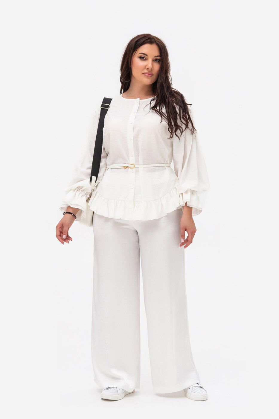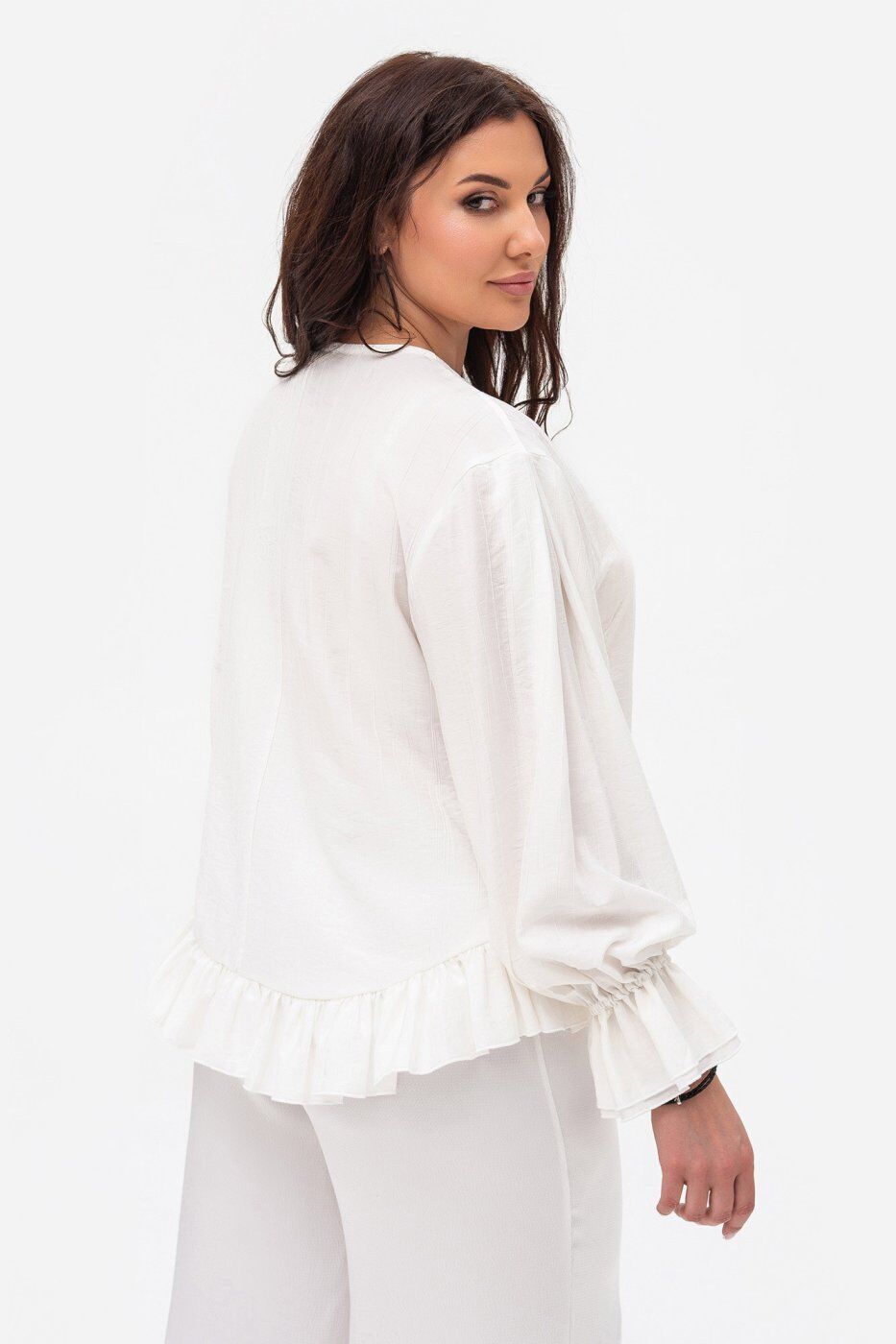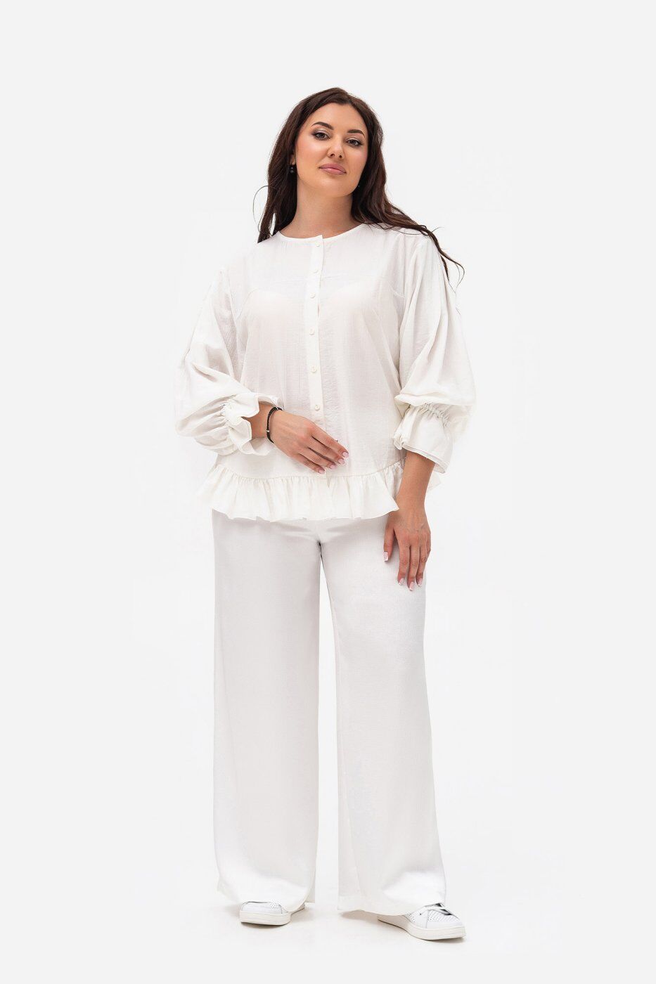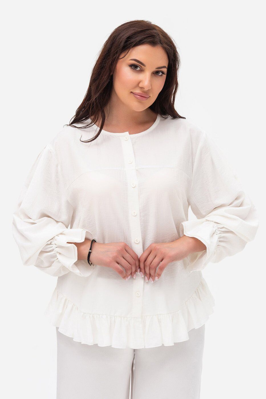 ** Матеріал: ** штапель жатка._x000A_** Розтяжність: ** не має._x000A_| Розміри | S | M | L | XL | 2XL | 3XL | 4XL | 5XL |_x000A_|:-----------------------------------------|:---:|:---:|:---:|:---:|:---:|:---:|:---:|_x000A_| Довжина рукава від плеча (см) | 60 | 60 | 60 | 60 | 60 | 60 | 60 | 60 |_x000A_| Довжина виробу по центру спини (см) | 65 | 65 | 65 | 65 | 65 | 65 | 65 | 65 |_x000A_| Ширина по лінії грудей (см) | 50 | 53 | 56 | 59 | 62 | 65 | 68 | 71|_x000A_** Легка жіноча блуза з рюшами **_x000A_* Повітряна блуза вільного силуету з фактурної тканини створена для вашого комфорту й легкості._x000A_* Не мнеться, приємна до тіла._x000A_* Рюші по низу та на рукавах додають образу грайливості та витонченості._x000A_** Силует: ** вільний._x000A_** Горловина: ** кругла._x000A_** Застібка: ** планка на гудзиках спереду._x000A_** Деталі: ** рюша по низу виробу та на рукавах._x000A_** Тканина: ** легка, з текстурною поверхнею, не мнеться._x000A_* Ідеально поєднується з джинсами, короткими шортами та спідницями, брюками — для офісу, прогулянки або відпочинку.Термін збору замовлення складає від 1 до 7 робочих днів. Докладніше