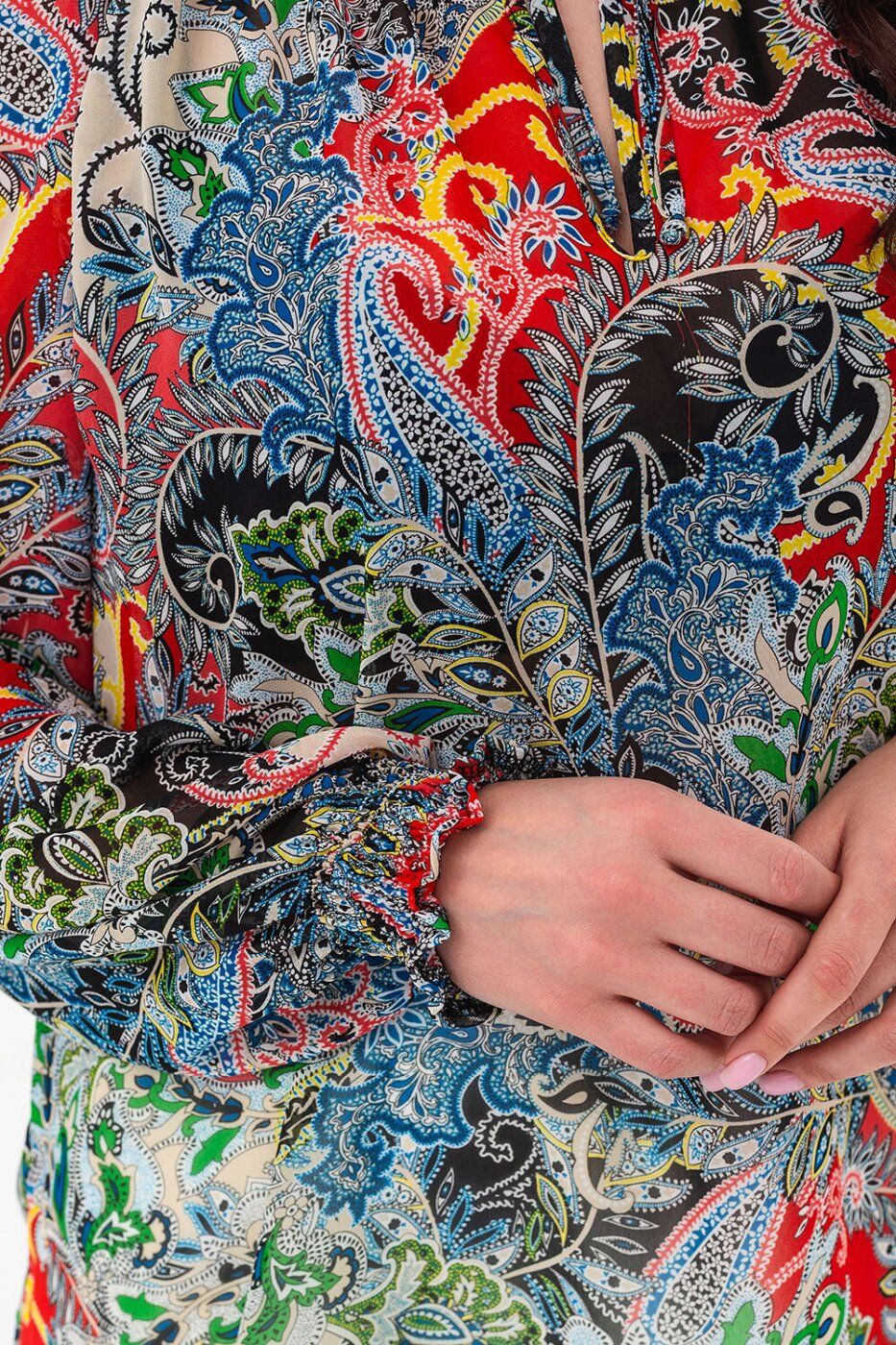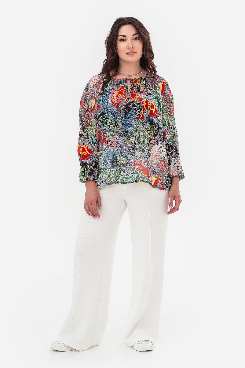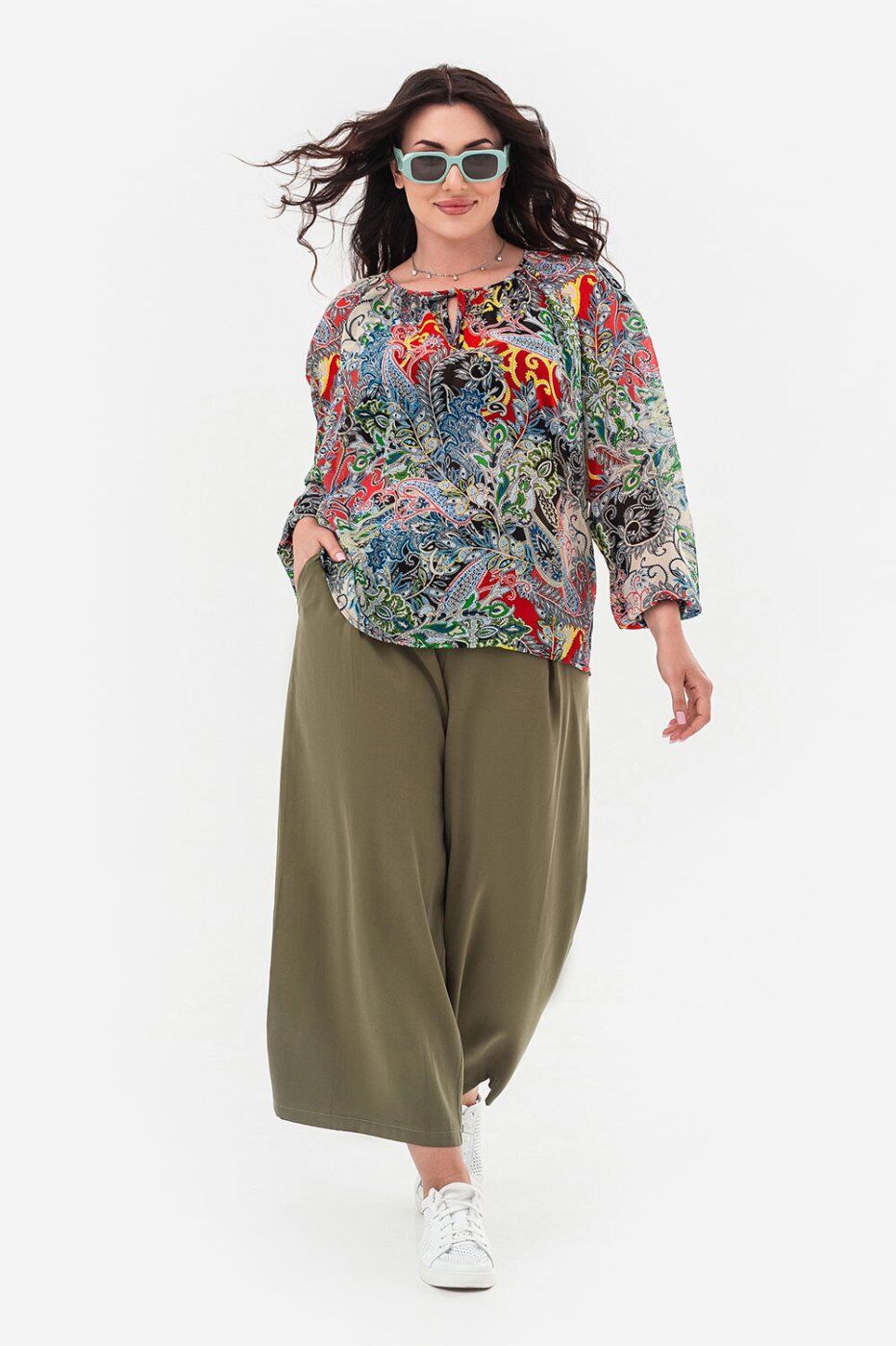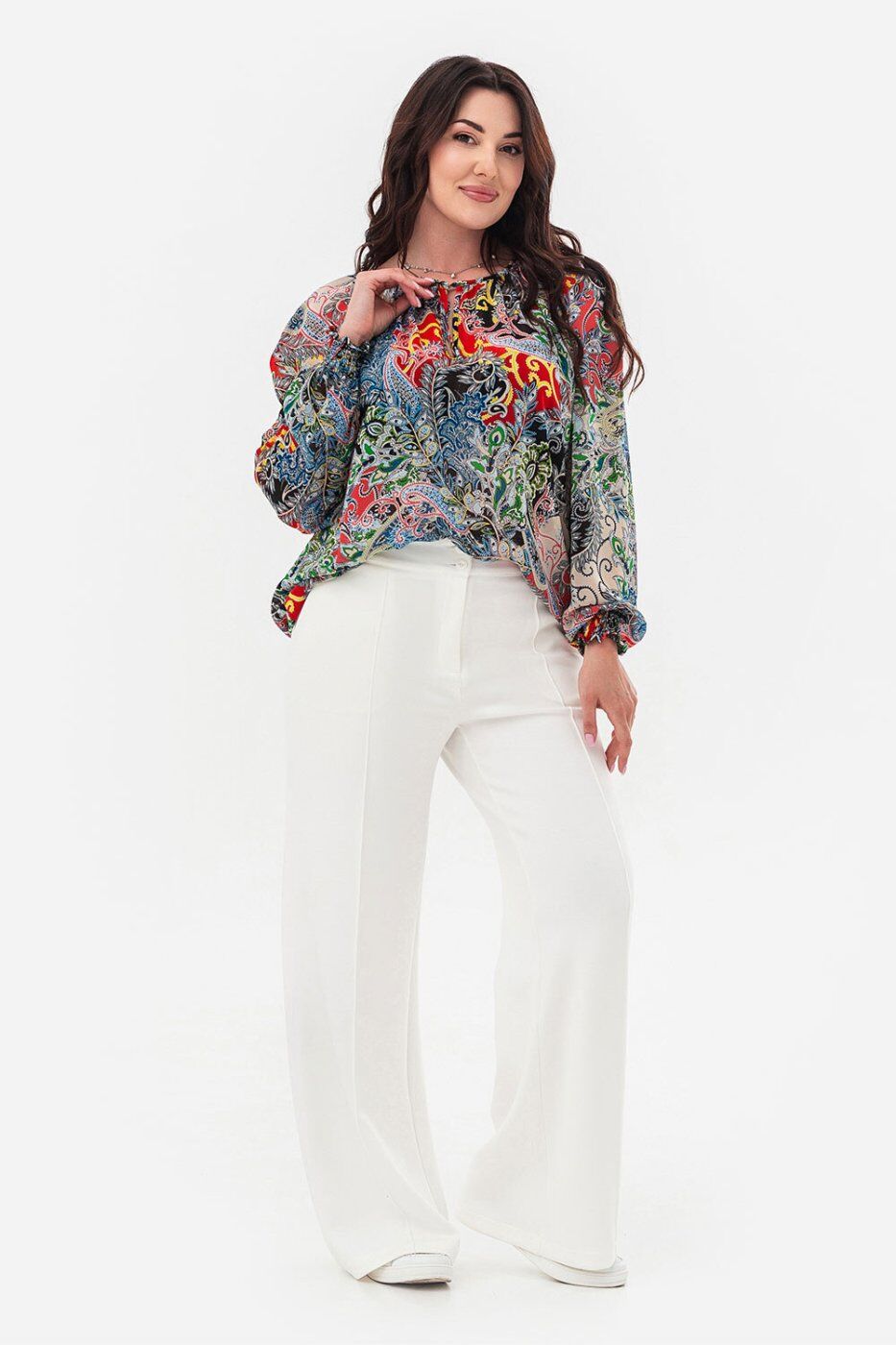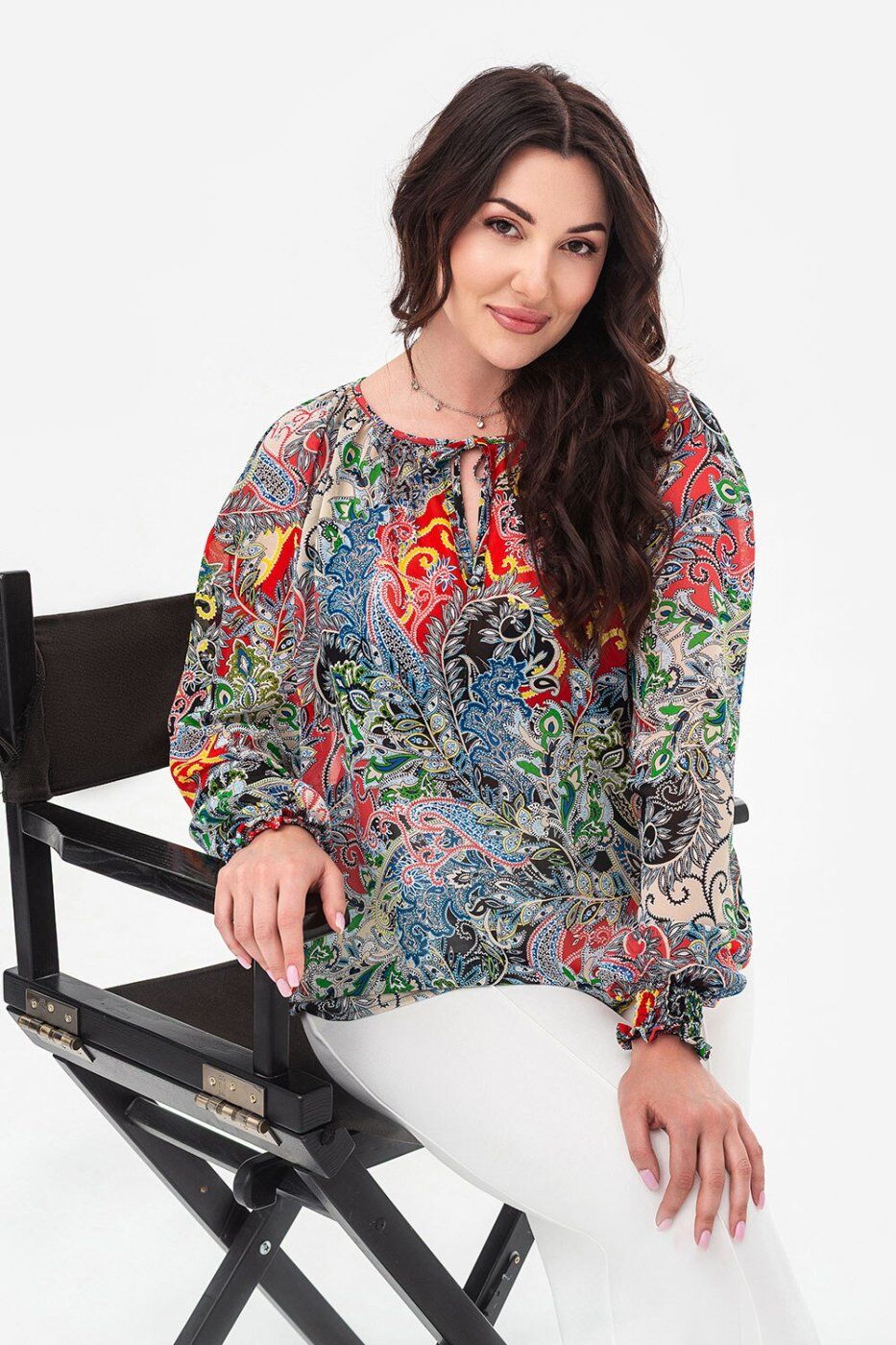 ** Матеріал: ** шифон._x000A_** Розтяжність: ** не має._x000A_| Розміри | L | XL | 2XL | 3XL | 4XL | 5XL |_x000A_|:-----------------------------------------|:---:|:---:|:---:|:---:|:---:|:---:|_x000A_| Довжина рукава від горловини (см) | 75 | 75 | 75 | 75 | 75 | 75 |_x000A_| Довжина виробу по центру спини (см) | 63 | 63 | 63 | 63 | 63 | 63 |_x000A_| Ширина по лінії грудей (см) | 59 | 62 | 65 | 68 | 71 | 74 |_x000A_* Блуза з шифону — це втілення жіночності, елегантності та витонченості._x000A_* Її легкий, невагомий матеріал м'яко облягає тіло, створюючи ніжний силует, який підкреслює грацію рухів._x000A_* Завдяки властивостям шифону, блуза виглядає особливо повітряною, додаючи образу відчуття легкості й свободи._x000A_* Такий одяг ідеально підходить для теплої пори року, адже тканина дозволяє шкірі дихати, даруючи комфорт навіть у спекотну погоду._x000A_* Ця модель блузи чудово поєднується зі спідницями різної довжини, класичними або завуженими брюками, а також джинсами, що дозволяє створювати як строгі, так і невимушені образи._x000A_* Шифон додає романтичності, а вільний крій — зручності._x000A_* Крім того, її можна носити як із високими підборами, так і з більш практичним взуттям, залежно від випадку._x000A_* Блуза зі шифону стане чудовим вибором для романтичних побачень, офісних зустрічей, вечірок або прогулянок._x000A_* Легка прозорість тканини може додати нотки загадковості, особливо якщо носити її у поєднанні з витонченим топом чи бралетом._x000A_* Це універсальний елемент гардеробу, який легко адаптується до будь-якої події, даруючи комфорт і стиль.