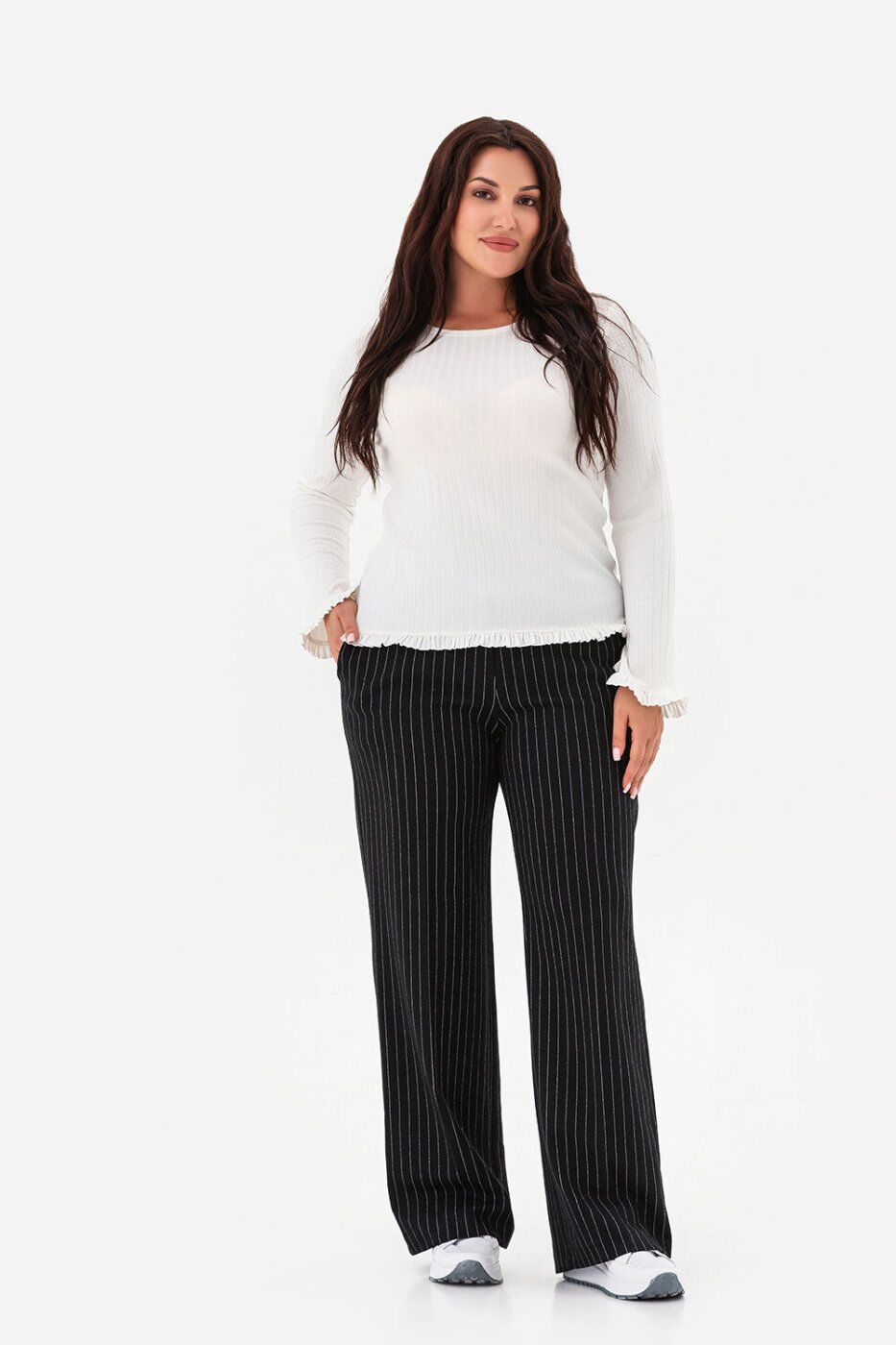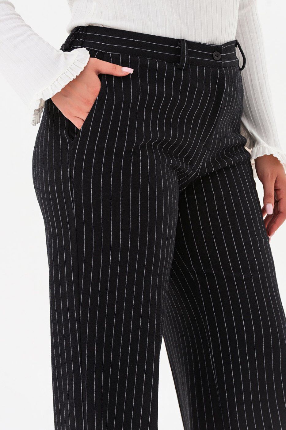 | Розміри| S | M | L | XL | 2XL | 3XL | 4XL | 5XL |_x000A_|:-----------------------------------------|:---:|:---: |:---:|:---:|:---:|:---:|:---:|:---:|_x000A_| Довжина виробу з внутрішнього шва (см) | 79 | 79 | 79 | 79 | 79 | 79 | 79 | 79 |_x000A_| Довжина виробу із зовнішнього шва (см) | 107 | 107 | 107 | 107 | 107 | 108 | 109 | 110 |_x000A_| Ширина лінії талії (см) | 34 | 36 | 38 | 40 | 43 | 46 | 49 | 52 |_x000A_| Ширина лінії стегон (см) | 48 | 50 | 52 | 56 | 59 | 62 | 65 | 69 |_x000A_* Штани в класичну смужку з акцентом на комфорт._x000A_* Модель поєднує строгість класики та відчуття затишку._x000A_* Тепла тканина з невеликим вмістом еластану забезпечує комфорт у носінні та гарну посадку по фігурі, зберігаючи при цьому елегантність._x000A_* Штани однаково вдало вписуються як у ділові образи з блузами чи жакетами, так і в повсякденні поєднання зі светрами чи кардиганами._x000A_* Завдяки універсальному дизайну вони стануть надійною основою осінньо-зимового гардероба._x000A_* Це практична річ, яка дарує відчуття впевненості та стилю щодня.Термін збору замовлення складає від 1 до 7 робочих днів. Докладніше