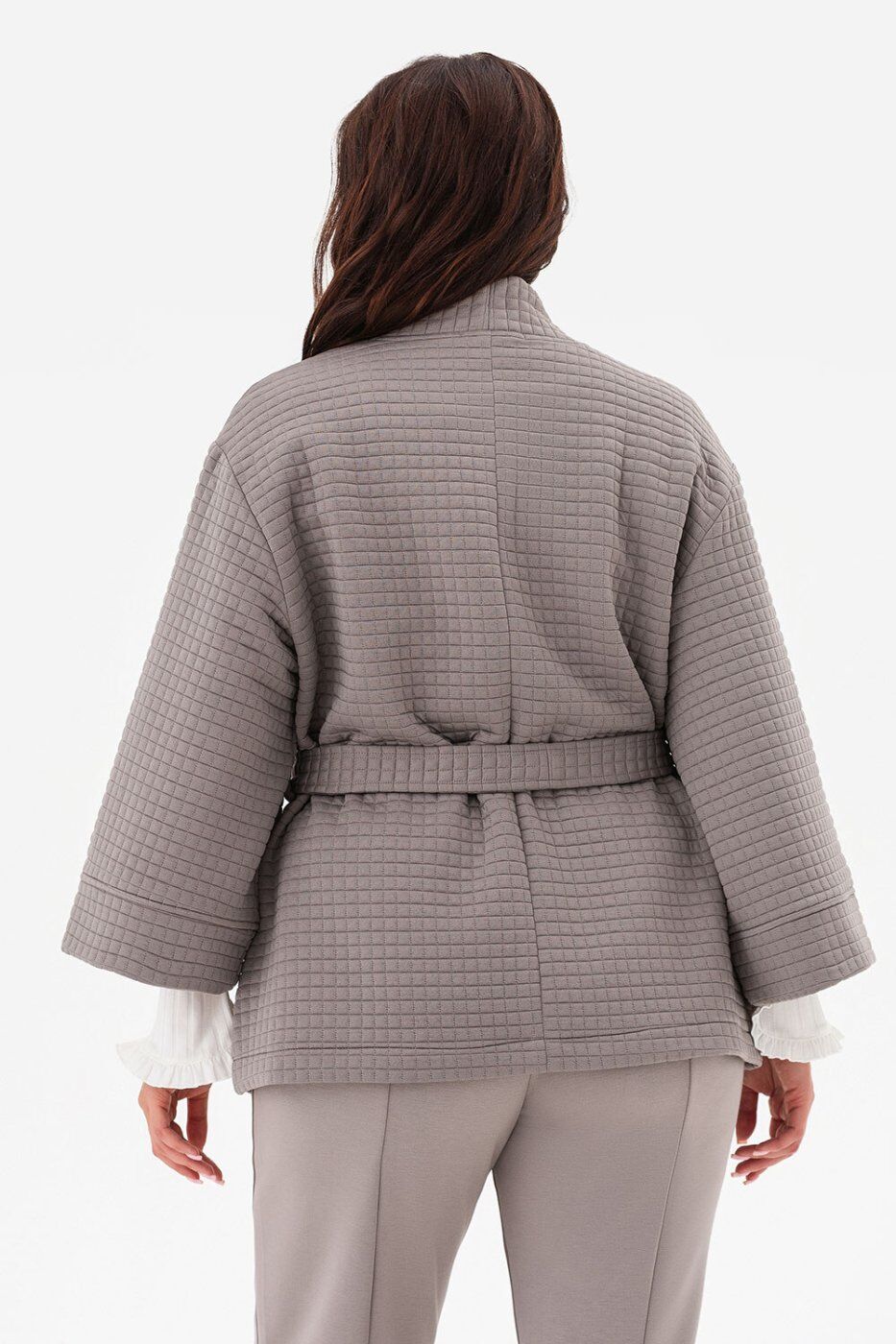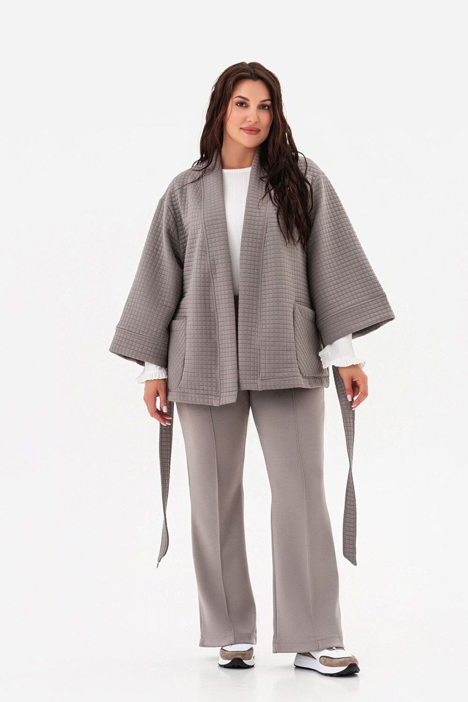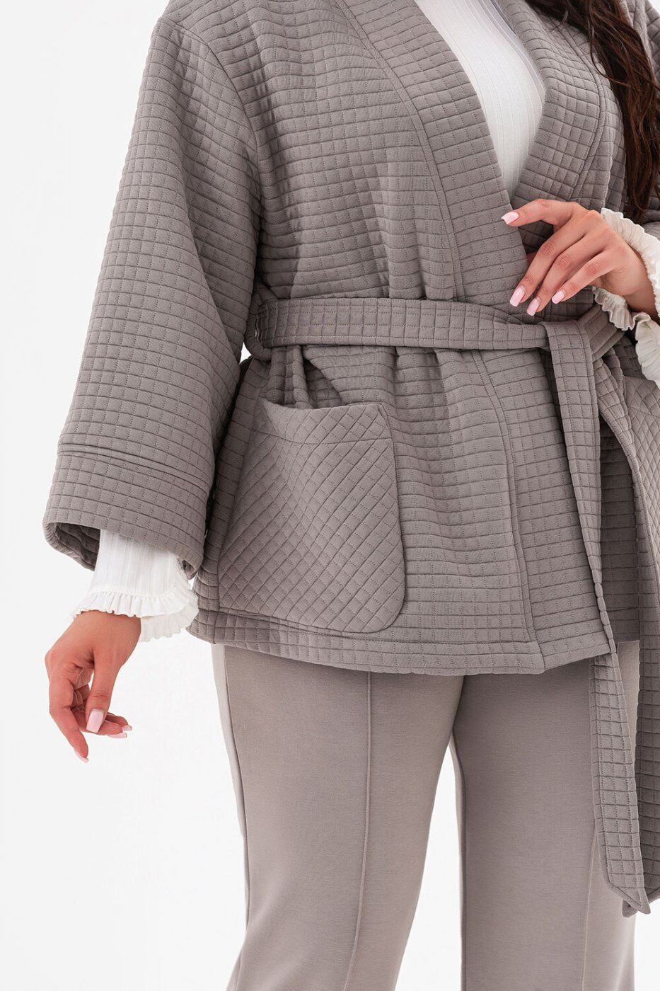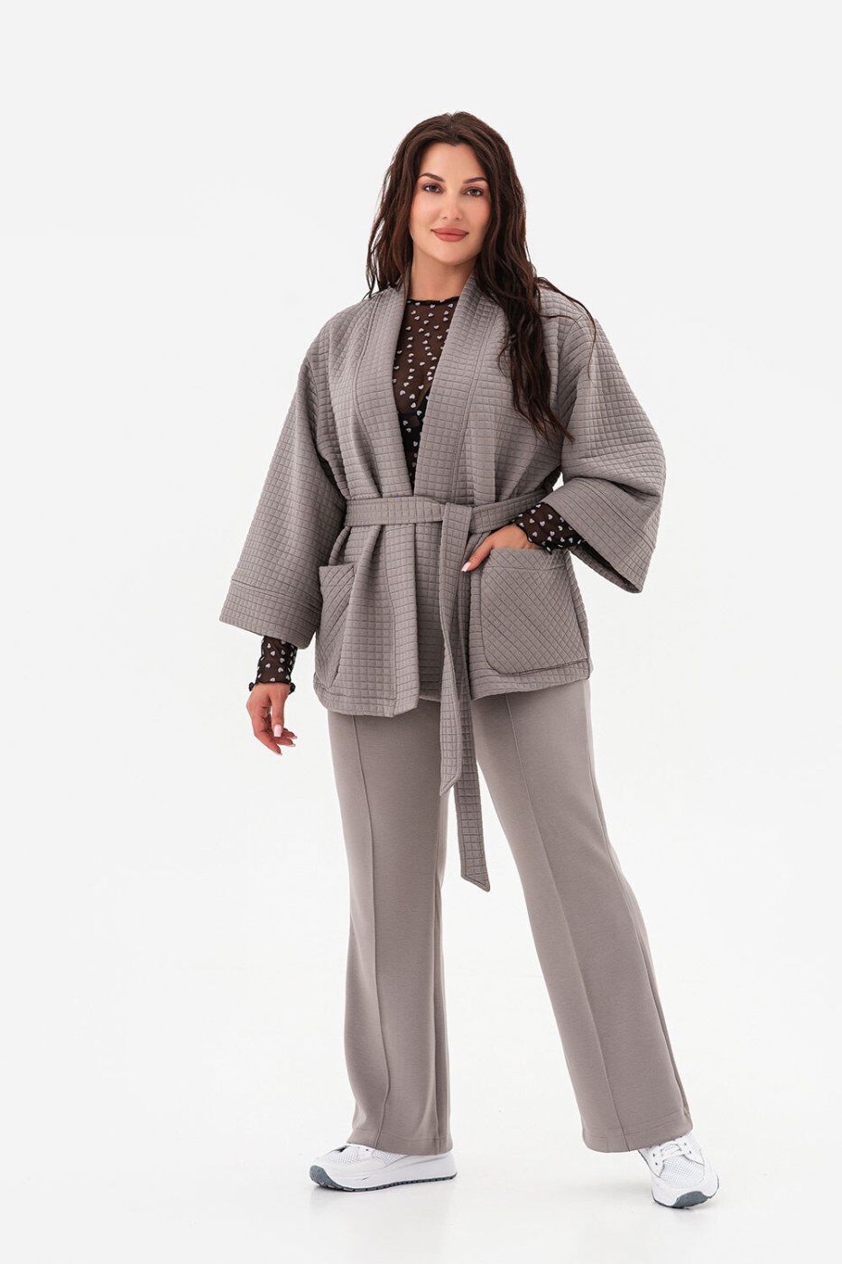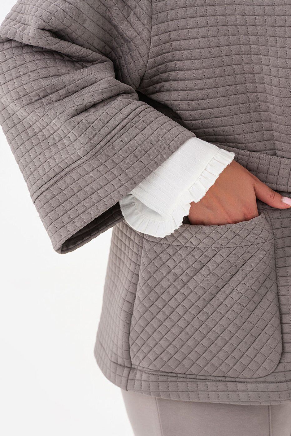 ** Матеріал: ** трикотаж стьоганий._x000A_** Розтяжність: ** середня._x000A_| Розміри | L/XL | 2XL/3XL | 4XL/5XL |_x000A_|:-----------------------------------------|:---:|:---:|:---:|_x000A_| Довжина рукава від плеча (см) | 47 | 48 | 49 |_x000A_| Довжина виробу по центру спини (см) | 69 | 70 | 71 |_x000A_| Ширина по лінії грудей (см) | 61 | 67 | 73 |_x000A_** Кардиган із фактурного Ocean Modal. **_x000A_* Модель з унікальною кубічною фактурою поєднує тактильну розкіш і сучасну архітектурність._x000A_* Вільний крій у стилі кімоно дарує відчуття свободи та легкості, створюючи ефект невимушеної елегантності._x000A_* Класична палітра — чорний, мокко та світло-сірий — робить кардиган універсальним для будь-якого гардероба._x000A_* Це річ, яка не змагається з образом, а підкреслює його, дозволяючи кожного разу створювати нову історію стилю._x000A_* Кардиган ідеально поєднується зі штанами DESERT, утворюючи вишуканий костюм, але так само легко комбінується з базовими топами, сукнями чи джинсами, залишаючись актуальним у будь-якому сезоні.