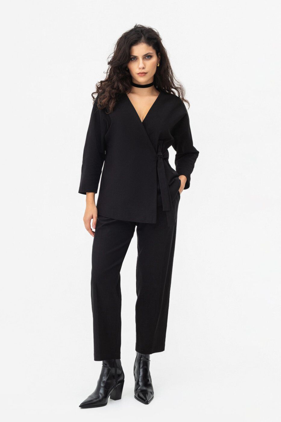 **Матеріал:** стрейч-котон.\\n**Параметри розмірів жакету в розкладеному вигляді:**\\n| Розміри| S | M | L | XL | 2XL | 3XL | 4XL |\\n|:-----------------------------------------|:---:|:---: |:---:|:---:|:---:|:---:|:---:|\\n| Довжина рукава від плеча (см)| 61 | 61 | 61 | 61 | 61 | 61 | 61 |\\n| Обхват по грудях (см) | 52 | 54 | 56 | 58 | 60 | 62 | 64 |\\n| Довжина виробу по центру спини (см) | 66 | 66 | 67 | 69 | 69 | 70 | 70 |\\n* Розтяжність - середня.\\n**Жакет PANNA**\\n* Жакет жіночий, довжиною до лінії стегон, покрою — цільновикроєний рукав, застібка- на запах по лінії талії, виконаний на підкладці.\\n* Горловина без коміра.\\n* Довжина рукава -7\8.\\n* Завязки у вигляді поясів, що зав’язуються зліва.\\n* Внутрішня застібка виконана у вигляді поясів, що регулюються застібкою на петлю та ґудзики.\\n* Матеріал - стрейч-котон