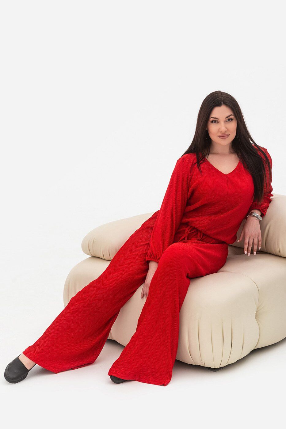 ** БЛУЗА **_x000A_** Матеріал: ** атлас жатка._x000A_** Розтяжність: ** висока._x000A_| Розміри | L | XL | 2XL | 3XL | 4XL | 5XL |_x000A_|:-----------------------------------------|:---:|:---:|:---:|:---:|:---:|:---:|_x000A_| Довжина рукава від плеча (см) | 56 | 57 | 57 | 58 | 58 | 59 |_x000A_| Довжина виробу по центру спини (см) | 55 | 56 | 58 | 60 | 60 | 62 |_x000A_| Ширина по лінії грудей (см) | 53 | 56 | 59 | 62 | 65 | 68 |_x000A_* Елегантна жіноча блуза з текстурованої тканини._x000A_* Стиль, комфорт та універсальність в одному виробі!_x000A_* Ця блуза стане чудовим доповненням до вашого гардеробу, адже вона поєднує в собі лаконічний дизайн, елегантність та зручність._x000A_* Завдяки вільному крою, вона підходить для будь-якого типу фігури, гарно сідає на тіло та не обмежує рухів._x000A_** Дизайн та особливості: **_x000A_* V-подібний виріз візуально подовжує шию та надає витонченості образу._x000A_* Довгі рукави додають стриманості та елегантності, що робить блузу ідеальною як для роботи, так і для святкових подій._x000A_* Легка текстурована тканина виглядає стильно та додає образу особливого шарму._x000A_** Матеріал та комфорт: **_x000A_* Блуза виготовлена з м’якої, приємної на дотик тканини, яка забезпечує комфорт упродовж усього дня. _x000A_** З чим поєднувати? **_x000A_* Ця модель чудово комбінується з класичними брюками, спідницями, джинсами ._x000A_* У поєднанні з жакетом чи кардиганом створить стильний діловий образ, а з кедами або босоніжками – більш розслаблений casual-лук._x000A_* Елегантна жіноча блуза з текстурованої тканини_x000A_* Стиль, комфорт та універсальність в одному виробі!_x000A_* Ця блуза стане чудовим доповненням до вашого гардеробу, адже вона поєднує в собі лаконічний дизайн, елегантність та зручність._x000A_* Завдяки вільному крою, вона підходить для будь-якого типу фігури, гарно сідає на фігуру та не обмежує рухів._x000A_** ШТАНИ **_x000A_** Розтяжність: ** висока._x000A_| Розміри | L | XL | 2XL | 3XL | 4XL | 5XL |_x000A_|:-----------------------------------------|:---:|:---:|:---:|:---:|:---:|:---:|_x000A_| Довжина виробу з внутрішнього шва (см) | 78 | 78 | 78 | 78 | 78 | 79 |_x000A_| Довжина виробу із зовнішнього шва (см) | 106 | 106 | 106 | 106 | 106 | 107 |_x000A_| Ширина лінії талії (см) | 36 | 39 | 42 | 44 | 47 | 50 |_x000A_| Ширина лінії стегон (см) | 59 | 62 | 65 | 68 | 71 | 74 |_x000A_** Пояс: ** резинка._x000A_* Жіночі широкі штани з текстурованої тканини – поєднання стилю та комфорту._x000A_** Легкість та свобода рухів: **_x000A_* Якщо ви шукаєте ідеальну річ для створення стильних і комфортних образів, ці широкі штани – саме те, що вам потрібно!_x000A_* Вони виготовлені з легкої, струмливої тканини з приємною текстурою, яка гарно лягає на тіло та забезпечує максимальний комфорт протягом усього дня._x000A_** Стильний oversize крій для будь-якої фігури: **_x000A_* Широкі штани створюють ефектний силует, виглядають дуже елегантно та підходять жінкам будь-якого типу фігури._x000A_* Вони не обмежують рухи, а навпаки – додають відчуття легкості та свободи._x000A_** Зручний пояс на резинці – ідеальна посадка: **_x000A_* Головна перевага цих штанів – пояс на широкій резинці._x000A_* Завдяки йому штани ідеально сідають по фігурі, не створюють відчуття тиску та дискомфорту._x000A_* Пояс м’яко прилягає до талії та забезпечує чудову посадку на будь-якому типі статури._x000A_** Ці штани можна легко поєднувати з будь-якими речами у вашому гардеробі: **_x000A_* зі світлими або яскравими топами для контрастних образів, з об’ємними светрами для комфортного кежуал-луку,_x000A_* з блузами для більш елегантного вигляду,_x000A_* з підборами або кросівками – залежно від вашого настрою._x000A_* Високоякісна ткани