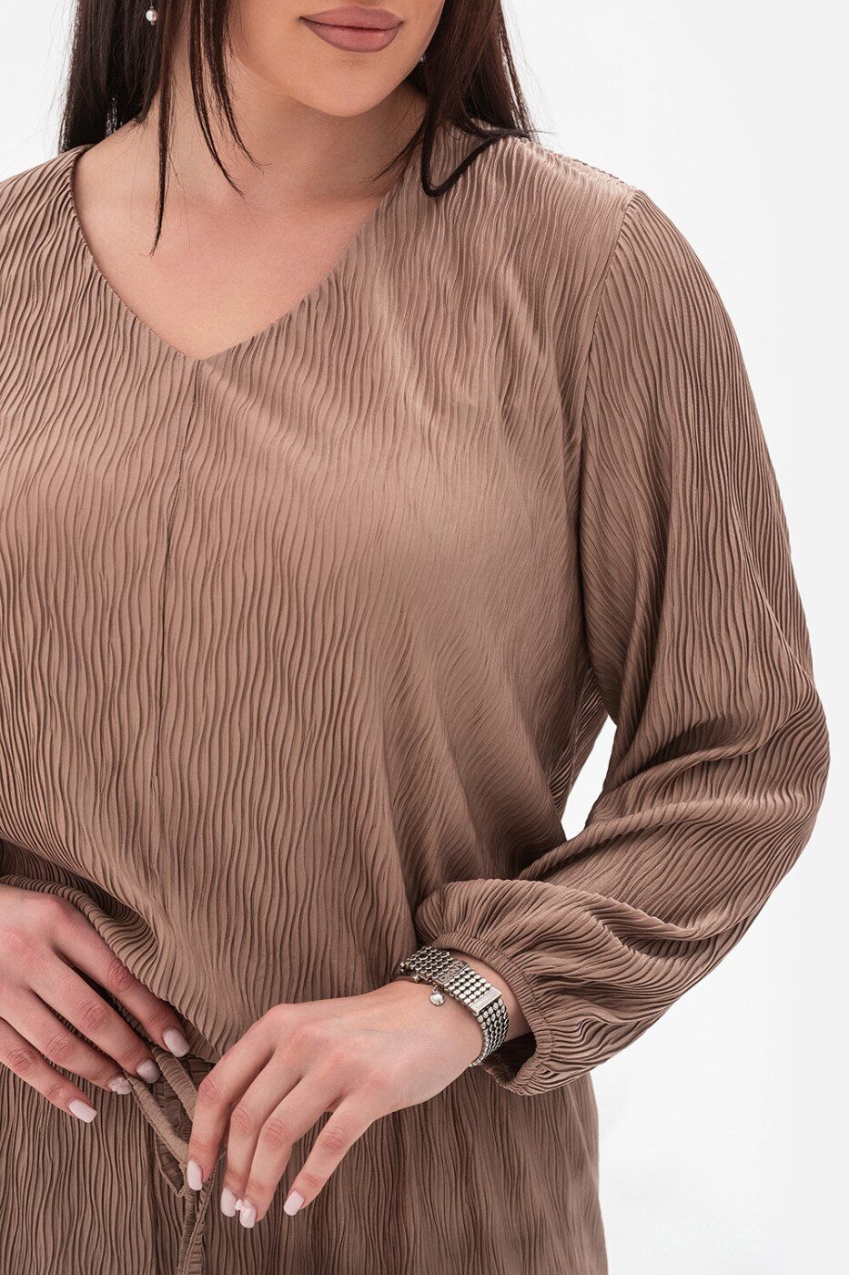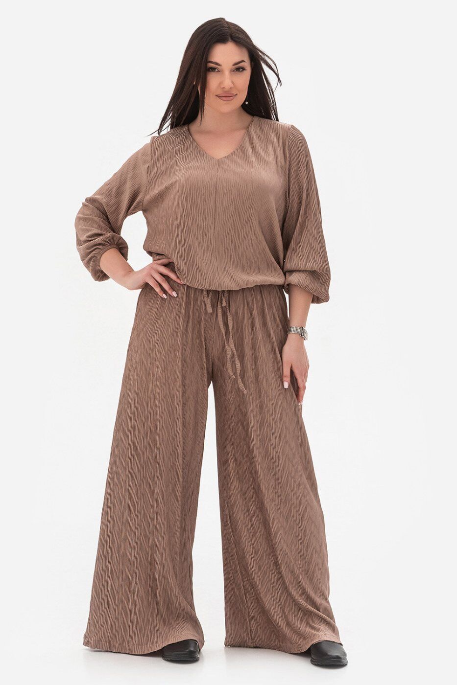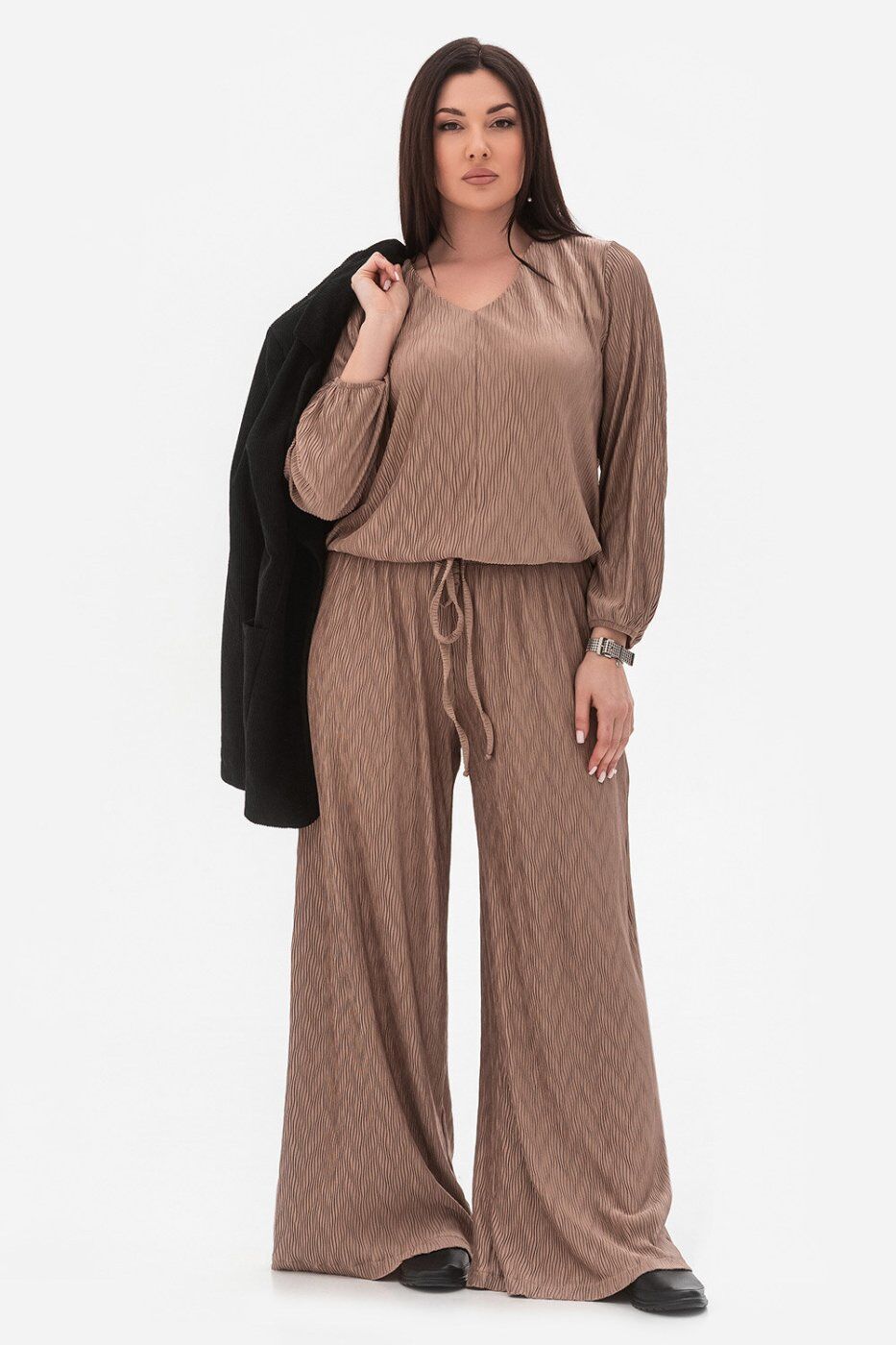 ** БЛУЗА **_x000A_** Матеріал: ** атлас жатка._x000A_** Розтяжність: ** висока._x000A_| Розміри | L | XL | 2XL | 3XL | 4XL | 5XL |_x000A_|:-----------------------------------------|:---:|:---:|:---:|:---:|:---:|:---:|_x000A_| Довжина рукава від плеча (см) | 56 | 57 | 57 | 58 | 58 | 59 |_x000A_| Довжина виробу по центру спини (см) | 55 | 56 | 58 | 60 | 60 | 62 |_x000A_| Ширина по лінії грудей (см) | 53 | 56 | 59 | 62 | 65 | 68 |_x000A_* Елегантна жіноча блуза з текстурованої тканини._x000A_* Стиль, комфорт та універсальність в одному виробі!_x000A_* Ця блуза стане чудовим доповненням до вашого гардеробу, адже вона поєднує в собі лаконічний дизайн, елегантність та зручність._x000A_* Завдяки вільному крою, вона підходить для будь-якого типу фігури, гарно сідає на тіло та не обмежує рухів._x000A_** Дизайн та особливості: **_x000A_* V-подібний виріз візуально подовжує шию та надає витонченості образу._x000A_* Довгі рукави додають стриманості та елегантності, що робить блузу ідеальною як для роботи, так і для святкових подій._x000A_* Легка текстурована тканина виглядає стильно та додає образу особливого шарму._x000A_** Матеріал та комфорт: **_x000A_* Блуза виготовлена з м’якої, приємної на дотик тканини, яка забезпечує комфорт упродовж усього дня. _x000A_** З чим поєднувати? **_x000A_* Ця модель чудово комбінується з класичними брюками, спідницями, джинсами ._x000A_* У поєднанні з жакетом чи кардиганом створить стильний діловий образ, а з кедами або босоніжками – більш розслаблений casual-лук._x000A_* Елегантна жіноча блуза з текстурованої тканини_x000A_* Стиль, комфорт та універсальність в одному виробі!_x000A_* Ця блуза стане чудовим доповненням до вашого гардеробу, адже вона поєднує в собі лаконічний дизайн, елегантність та зручність._x000A_* Завдяки вільному крою, вона підходить для будь-якого типу фігури, гарно сідає на фігуру та не обмежує рухів._x000A_** ШТАНИ **_x000A_** Розтяжність: ** висока._x000A_| Розміри | L | XL | 2XL | 3XL | 4XL | 5XL |_x000A_|:-----------------------------------------|:---:|:---:|:---:|:---:|:---:|:---:|_x000A_| Довжина виробу з внутрішнього шва (см) | 78 | 78 | 78 | 78 | 78 | 79 |_x000A_| Довжина виробу із зовнішнього шва (см) | 106 | 106 | 106 | 106 | 106 | 107 |_x000A_| Ширина лінії талії (см) | 36 | 39 | 42 | 44 | 47 | 50 |_x000A_| Ширина лінії стегон (см) | 59 | 62 | 65 | 68 | 71 | 74 |_x000A_** Пояс: ** резинка._x000A_* Жіночі широкі штани з текстурованої тканини – поєднання стилю та комфорту._x000A_** Легкість та свобода рухів: **_x000A_* Якщо ви шукаєте ідеальну річ для створення стильних і комфортних образів, ці широкі штани – саме те, що вам потрібно!_x000A_* Вони виготовлені з легкої, струмливої тканини з приємною текстурою, яка гарно лягає на тіло та забезпечує максимальний комфорт протягом усього дня._x000A_** Стильний oversize крій для будь-якої фігури: **_x000A_* Широкі штани створюють ефектний силует, виглядають дуже елегантно та підходять жінкам будь-якого типу фігури._x000A_* Вони не обмежують рухи, а навпаки – додають відчуття легкості та свободи._x000A_** Зручний пояс на резинці – ідеальна посадка: **_x000A_* Головна перевага цих штанів – пояс на широкій резинці._x000A_* Завдяки йому штани ідеально сідають по фігурі, не створюють відчуття тиску та дискомфорту._x000A_* Пояс м’яко прилягає до талії та забезпечує чудову посадку на будь-якому типі статури._x000A_** Ці штани можна легко поєднувати з будь-якими речами у вашому гардеробі: **_x000A_* зі світлими або яскравими топами для контрастних образів, з об’ємними светрами для комфортного кежуал-луку,_x000A_* з блузами для більш елегантного вигляду,_x000A_* з підборами або кросівками – залежно від вашого настрою._x000A_* Високоякісна ткани
