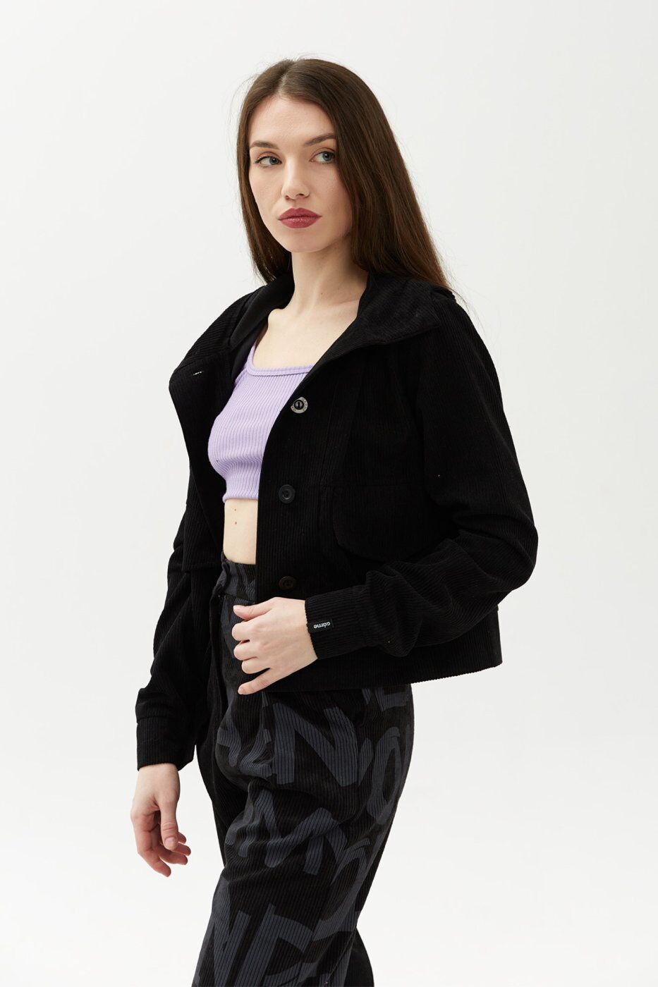 **Матеріал:** вельвет.\n**Параметри розмірів в розкладеному вигляді:**\n| Розміри| XS | S | M | L | XL | 2XL |\n|:-----------------------------------------:|:---:|:---: |:---:|:---:|:---:|:---:|\n| Довжина рукава від плеча (см)| 62 | 63 | 64 | 65 | 66 | 67 |\n| Ширина лінією грудей (см) | 46 | 48 | 50 | 52 | 54 | 56 | \n| Довжина виробу по центру спини (см) | 48 | 50 | 52 | 53 | 55 | 56 | \n**Розтяжність:** ні.Термін збору замовлення складає від 1 до 7 робочих днів. Докладніше