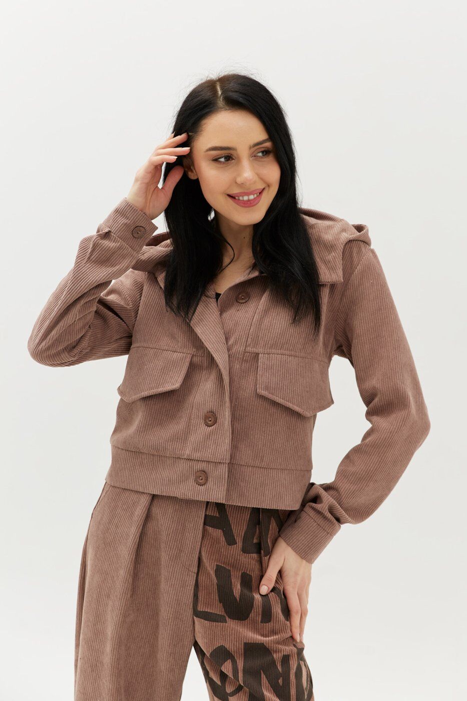 **Матеріал:** вельвет.\n**Параметри розмірів в розкладеному вигляді:**\n| Розміри| XS | S | M | L | XL | 2XL |\n|:-----------------------------------------:|:---:|:---: |:---:|:---:|:---:|:---:|\n| Довжина рукава від плеча (см)| 62 | 63 | 64 | 65 | 66 | 67 |\n| Ширина лінією грудей (см) | 46 | 48 | 50 | 52 | 54 | 56 | \n| Довжина виробу по центру спини (см) | 48 | 50 | 52 | 53 | 55 | 56 | \n**Розтяжність:** ні.Термін збору замовлення складає від 1 до 7 робочих днів. Докладніше