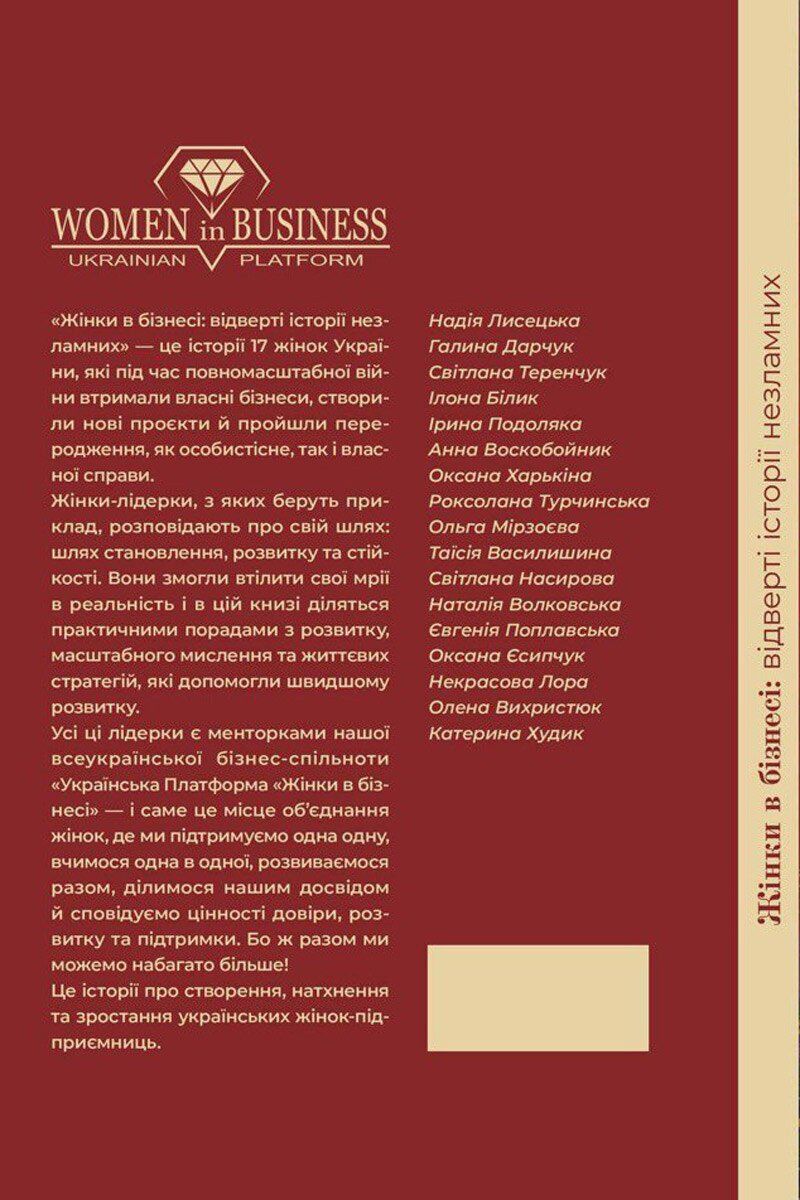 - «Жінки в бізнесі: відверті історії незламних» — це історії 17 жінок України, які під час повномасштабної війни втримали власні бізнеси, створили нові й пройшли переродження, як особистісне, так і власної справи. \n