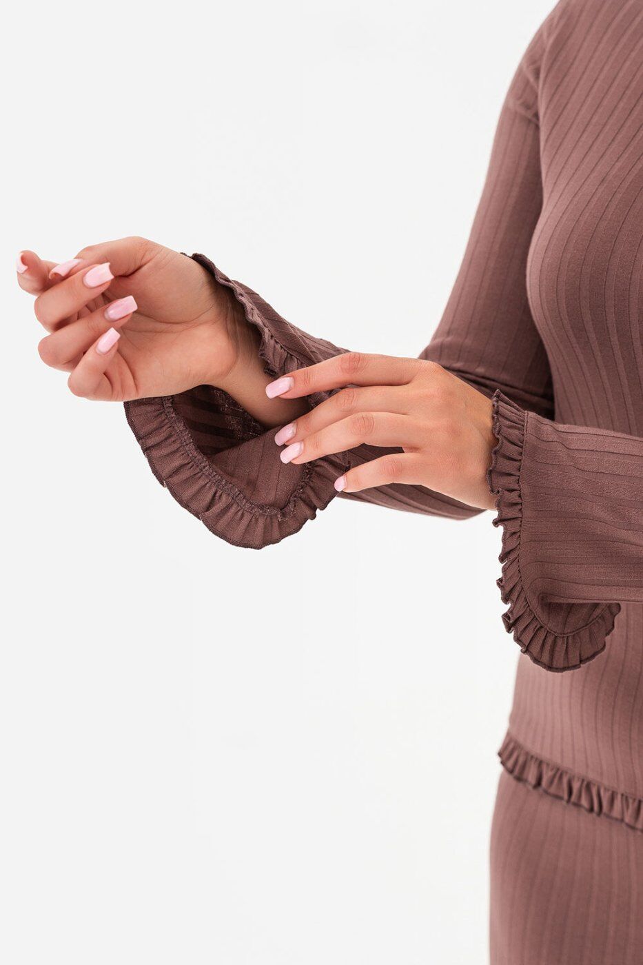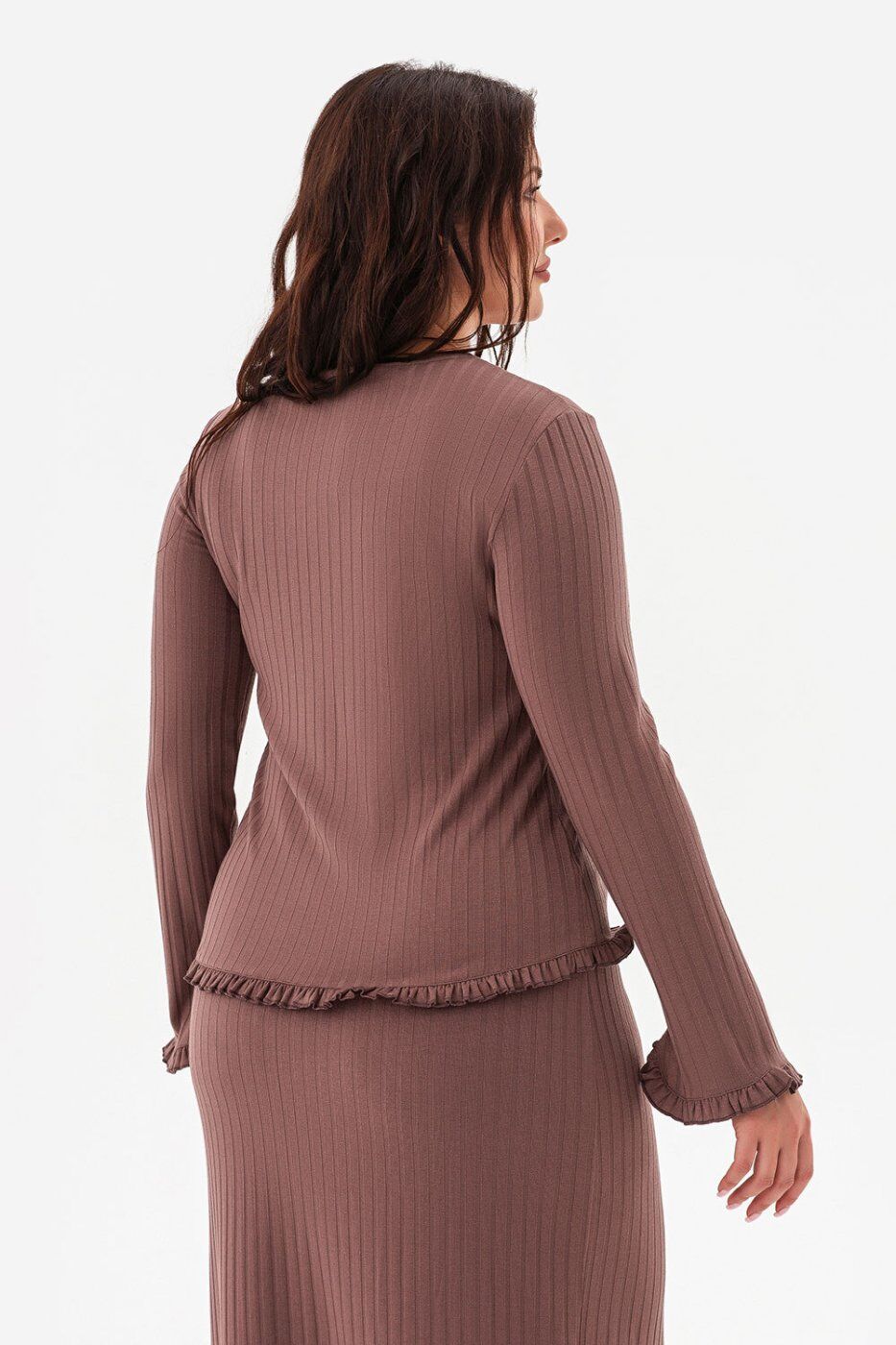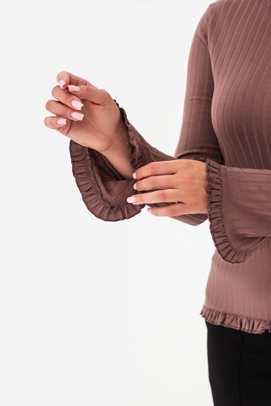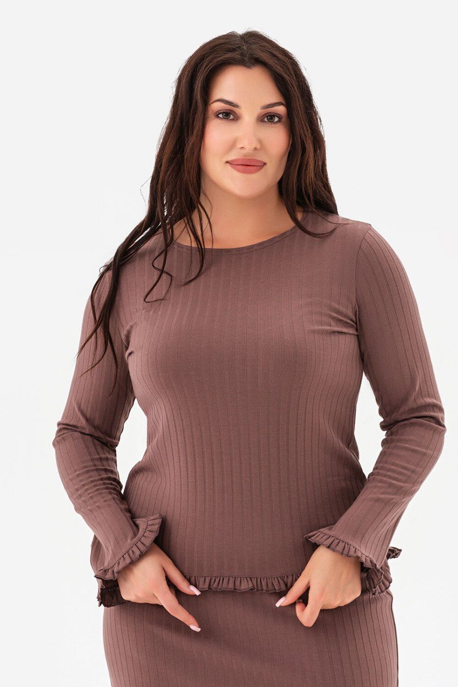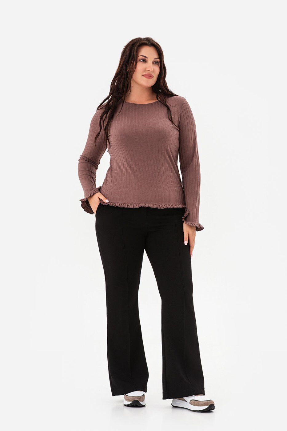 ** Матеріал: ** широкий рубчик мустанг._x000A_** Розтяжність: ** висока._x000A_| Розміри | L | XL | 2XL | 3XL | 4XL | 5XL |_x000A_|:-----------------------------------------|:---:|:---:|:---:|:---:|:---:|:---:|_x000A_| Довжина рукава від плеча (см) | 60 | 60 | 60 | 60 | 60 | 60 |_x000A_| Довжина виробу по центру спини (см) | 58 | 59 | 60 | 61 | 62 | 63 |_x000A_| Ширина по лінії грудей (см) | 45 | 48 | 51 | 54 | 57 | 60 |_x000A_** Класика з ноткою жіночності. **_x000A_* Наші лонгсліви вже давно стали базою гардероба, але цього разу ми надали моделі більш романтичного звучання._x000A_* Ніжні рюші по рукавах та низу додають легкості, кокетства й підкреслюють індивідуальність._x000A_* Лонг можна носити як самостійний верх або використовувати як стильну основу під кардигани чи жакети — декоративні рукави створюють ефект цікавих манжетів._x000A_* Модель чудово поєднується не лише з джинсами чи класичними штанами, а й зі спідницями в романтичному стилі з розрізом та рюшею, утворюючи гармонійний, цілісний образ._x000A_* Завдяки універсальності та витонченим деталям цей лонгслів стане тією базовою річчю, яка завжди працює на вашу жіночність і стиль.