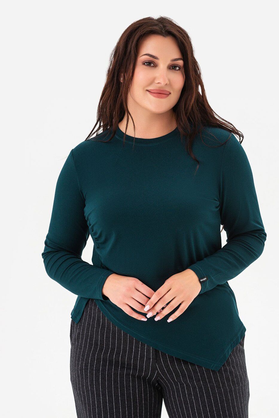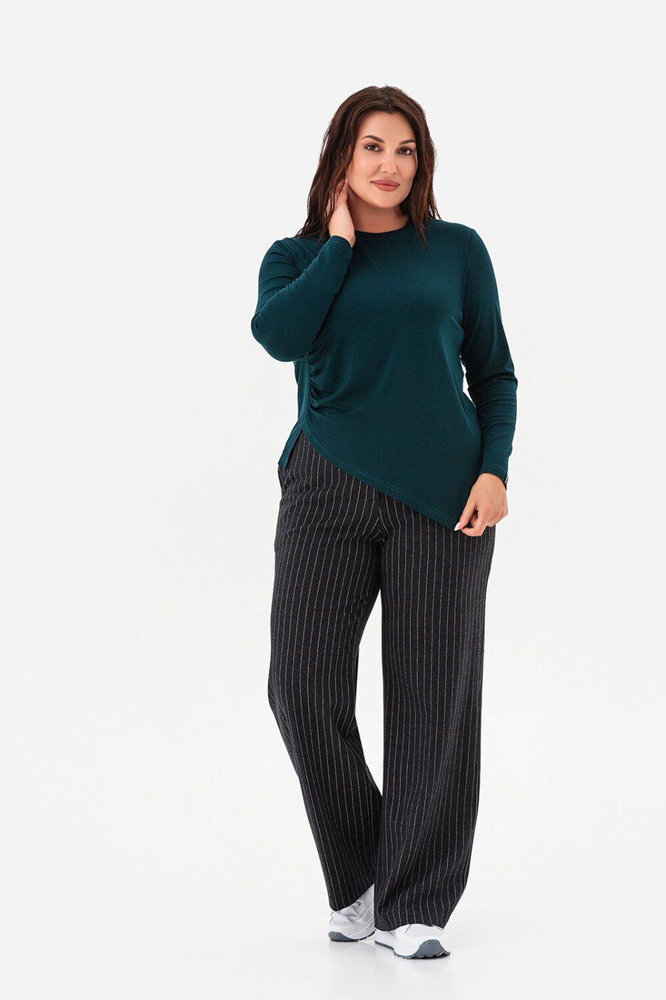 ** Матеріал: ** віскоза._x000A_** Розтяжність: ** висока._x000A_| Розміри | L | XL | 2XL | 3XL | 4XL | 5XL |_x000A_|:-----------------------------------------|:---:|:---:|:---:|:---:|:---:|:---:|_x000A_| Довжина рукава від плеча (см) | 57 | 57 | 57 | 58 | 58 | 58 |_x000A_| Довжина виробу по центру спини (см) | 54 | 55 | 56 | 56 | 56 | 57 |_x000A_| Ширина по лінії грудей (см) | 52 | 54 | 56 | 58 | 60 | 62 |_x000A_** Лонг у продовження історії BRI. **_x000A_* Цього літа ви полюбили нашу футболку BRI — і ми почули вас._x000A_* Тепер вона повертається в осінньому варіанті лонгу, зберігаючи впізнаваний характер і додаючи нових акцентів._x000A_* Асиметричний крій попереду та легка драпіровка збоку в області талії створюють м’який коригуючий ефект, надаючи силуету витонченості й гармонії._x000A_* Завдяки універсальному дизайну лонг легко інтегрується у ваш гардероб: він чудово виглядає як у поєднанні з джинсами та штанами, так і зі спідницями чи кардиганами, що дозволяє створювати безліч стильних образів.