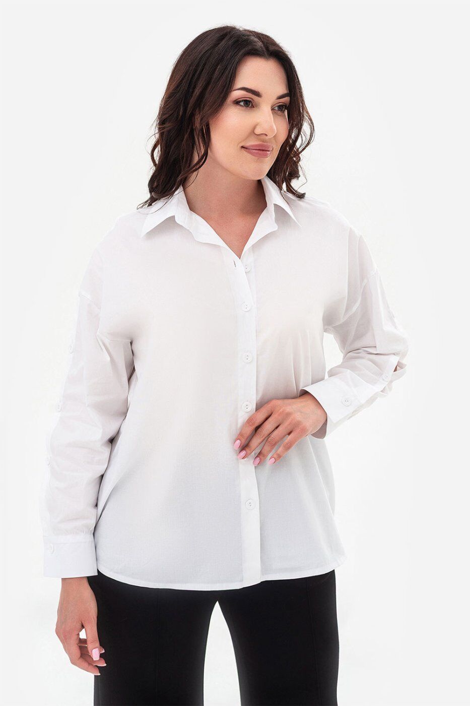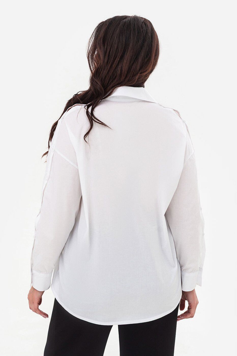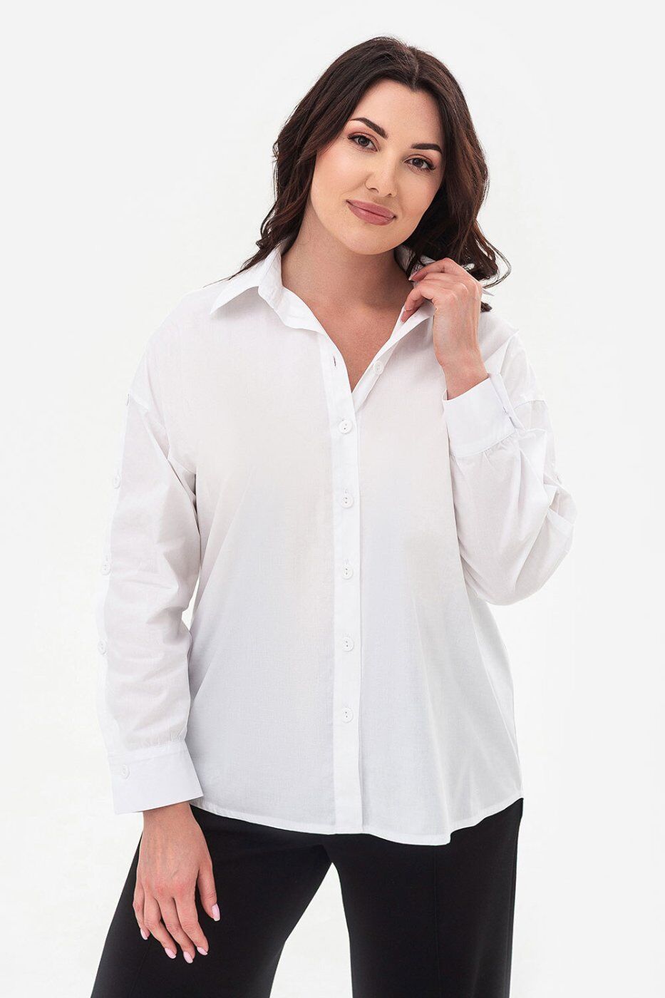 ** Матеріал: ** рубашка._x000A_** Розтяжність: ** не має._x000A_| Розміри | L | XL | 2XL | 3XL | 4XL | 5XL |_x000A_|:-----------------------------------------|:---:|:---:|:---:|:---:|:---:|:---:|_x000A_| Довжина рукава від горловини (см) | 72 | 73 | 73 | 73 | 75 | 75 |_x000A_| Довжина виробу по центру спини (см) | 72 | 73 | 73 | 73 | 73 | 73 |_x000A_| Ширина по лінії грудей (см) | 62 | 64 | 66 | 68 | 70 | 72 |_x000A_* Сорочка з декоративними ґудзиками на рукавах та плечах._x000A_* Ця сорочка — модний акцент вашого гардеробу._x000A_* Вона поєднує елегантність, комфорт і трендовий декор, що одразу привертає увагу._x000A_* Дизайн із рядом ґудзиків уздовж плечового шва та рукава додає індивідуальності — без потреби в додаткових аксесуарах._x000A_* Модель має вільний крій із прямими лініями, що дозволяє легко адаптувати сорочку під будь-яку фігуру та комбінувати її з базовими речами._x000A_* Класичний комір і манжети врівноважують експресивність деталей, додаючи стриманості й витонченості._x000A_** Чому вона must-have: **_x000A_— Акцент на декоративну деталь._x000A_— Легка в стилізації: носіть заправленою або навипуск._x000A_— Підходить до офісних, кежуал і романтичних образів._x000A_— Ідеально виглядає в total look, у поєднанні з денімом чи класикою._x000A_** Склад тканини: ** бавовна, приємна до тіла, тримає форму, дихає — комфорт гарантовано впродовж усього дня._x000A_* Ця сорочка — символ сучасної жіночності: сміливої, витонченої та незалежної.