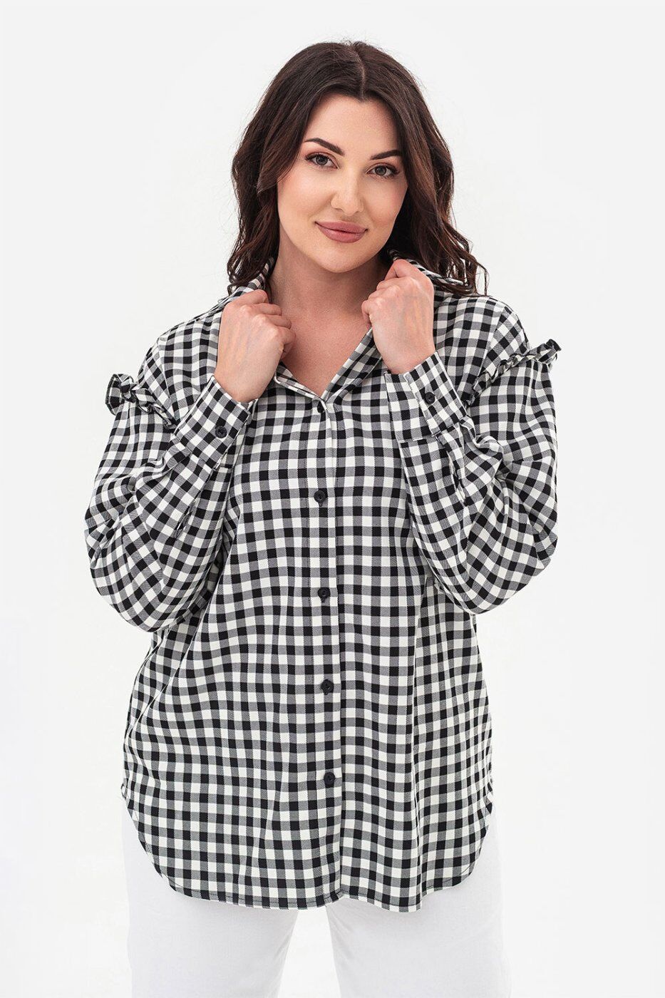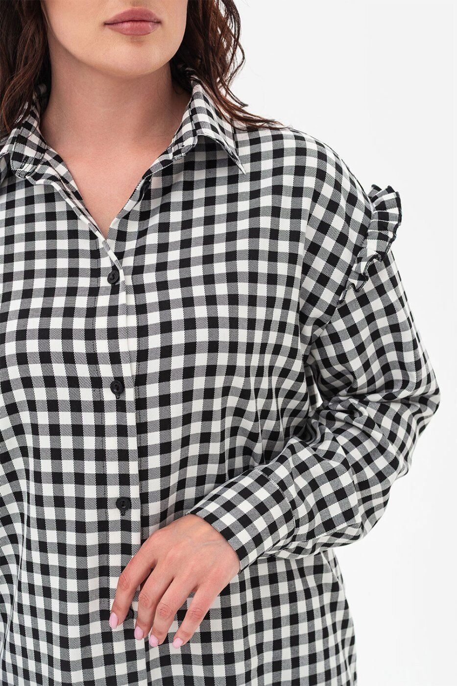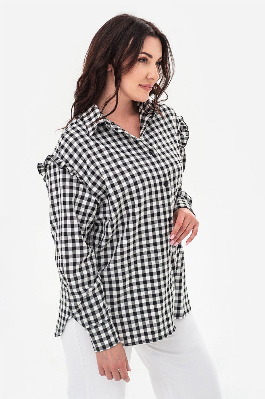 ** Матеріал: ** трикотаж._x000A_** Розтяжність: ** не має._x000A_| Розміри | S | M | L | XL | 2XL | 3XL |_x000A_|:-----------------------------------------|:---:|:---:|:---:|:---:|:---:|:---:|_x000A_| Довжина рукава від плеча (см) | 56 | 56 | 56 | 56 | 56 | 57 |_x000A_| Довжина виробу по центру спини (см) | 72 | 73 | 74 | 74 | 75 | 76 |_x000A_| Ширина по лінії грудей (см) | 56 | 58 | 61 | 64 | 66 | 68 |_x000A_* Жіноча сорочка у чорно-білу клітинку з рюшею._x000A_* Актуальна модель, що поєднує класику та трендові акценти._x000A_* Вільний силует забезпечує комфорт і свободу рухів, а спущений рукав із делікатною рюшею додає образу жіночності та м’якої романтики._x000A_* Класичний відкладний комір балансує дизайн, додаючи стриманості та гармонійно врівноважуючи декоративні елементи._x000A_* Завдяки продуманому крою сорочка красиво лягає по фігурі, виглядає легко та невимушено._x000A_* Матеріал приємний до тіла, дихає, добре тримає форму, тож підходить для будь-якої пори року._x000A_** Особливості моделі: **_x000A_— Вільний крій._x000A_— Спущений рукав із рюшею._x000A_— Класичний комір._x000A_— Стильна чорно-біла клітинка._x000A_* Ця сорочка стане базою для стильних поєднань у повсякденному чи офісному гардеробі._x000A_* Її можна носити навипуск або заправляти — під класичні брюки, джинси, спідниці чи навіть шорти._x000A_* Обирай свій варіант — під настрій.