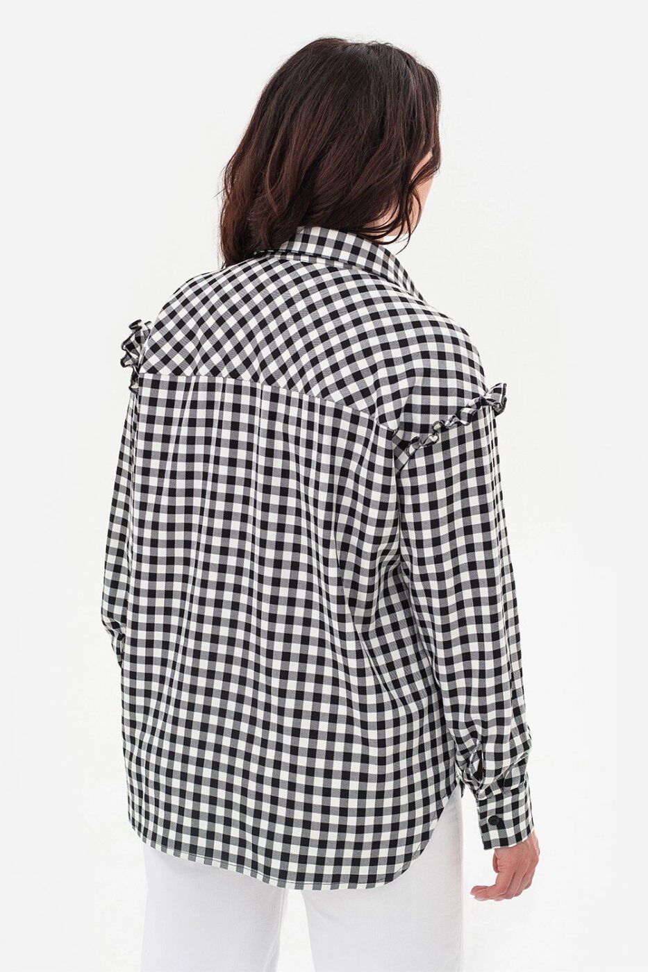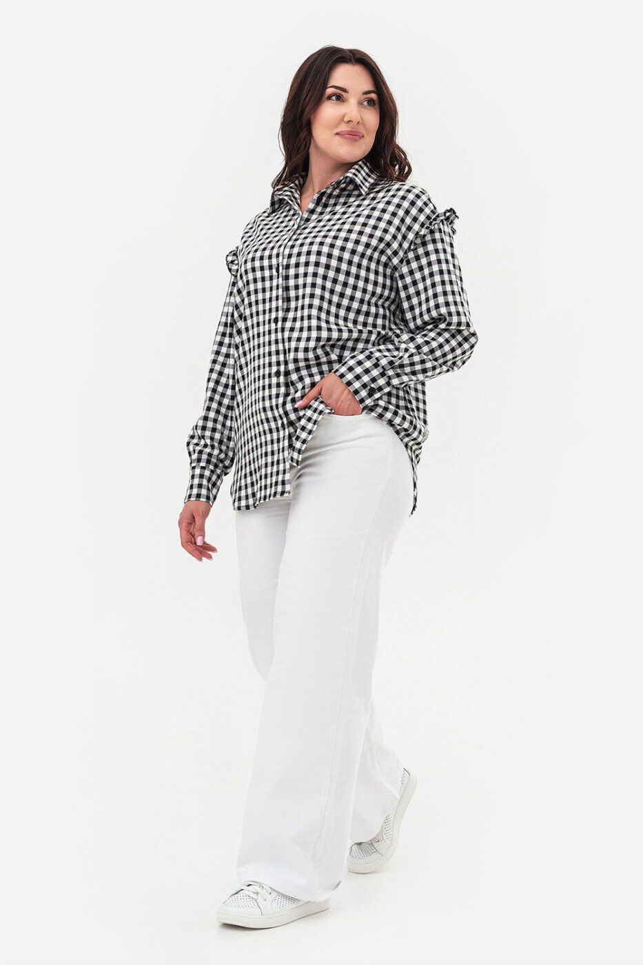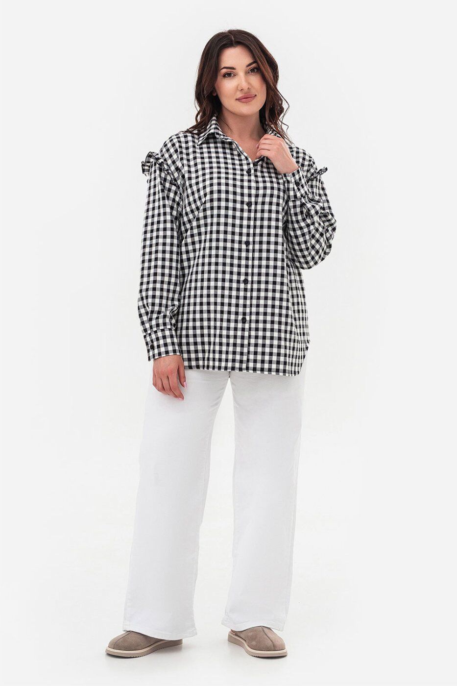 ** Матеріал: ** трикотаж._x000A_** Розтяжність: ** не має._x000A_| Розміри | S | M | L | XL | 2XL | 3XL |_x000A_|:-----------------------------------------|:---:|:---:|:---:|:---:|:---:|:---:|_x000A_| Довжина рукава від плеча (см) | 56 | 56 | 56 | 56 | 56 | 57 |_x000A_| Довжина виробу по центру спини (см) | 72 | 73 | 74 | 74 | 75 | 76 |_x000A_| Ширина по лінії грудей (см) | 56 | 58 | 61 | 64 | 66 | 68 |_x000A_* Жіноча сорочка у чорно-білу клітинку з рюшею._x000A_* Актуальна модель, що поєднує класику та трендові акценти._x000A_* Вільний силует забезпечує комфорт і свободу рухів, а спущений рукав із делікатною рюшею додає образу жіночності та м’якої романтики._x000A_* Класичний відкладний комір балансує дизайн, додаючи стриманості та гармонійно врівноважуючи декоративні елементи._x000A_* Завдяки продуманому крою сорочка красиво лягає по фігурі, виглядає легко та невимушено._x000A_* Матеріал приємний до тіла, дихає, добре тримає форму, тож підходить для будь-якої пори року._x000A_** Особливості моделі: **_x000A_— Вільний крій._x000A_— Спущений рукав із рюшею._x000A_— Класичний комір._x000A_— Стильна чорно-біла клітинка._x000A_* Ця сорочка стане базою для стильних поєднань у повсякденному чи офісному гардеробі._x000A_* Її можна носити навипуск або заправляти — під класичні брюки, джинси, спідниці чи навіть шорти._x000A_* Обирай свій варіант — під настрій.