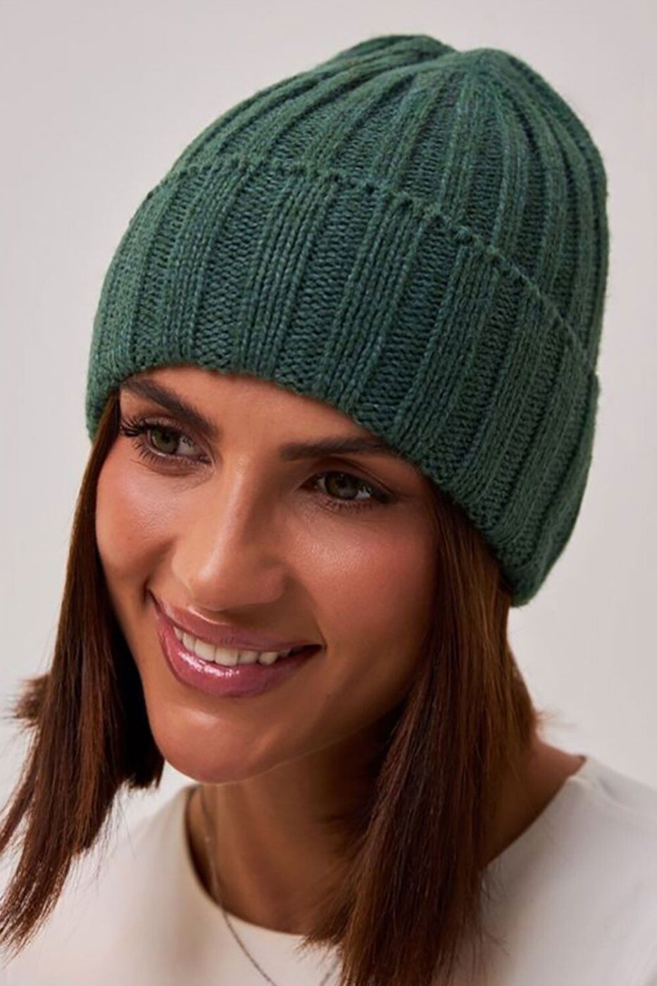 Жіноча демісезонна шапка зеленого кольору з відворотом 4496504 от Garne
