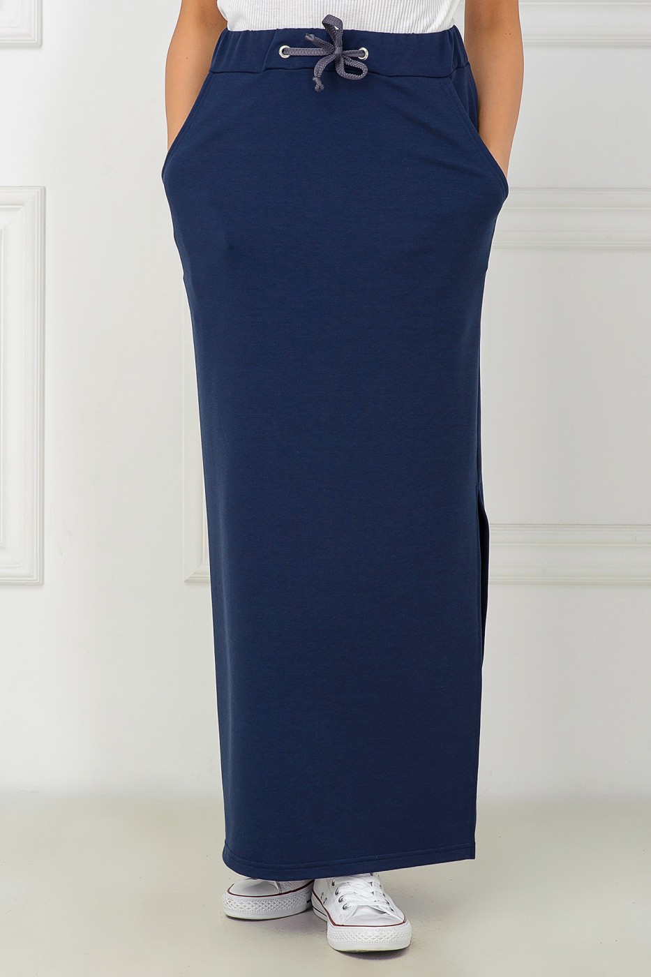 Трендовая юбка Nesti в стиле спорт-шик из свежей коллекции известной украинской марки Garne. Комфортная и стильная модель для динамичных урбан-луков. Юбка длиной макси имеет прямой фасон с актуальной высокой посадкой на притачном поясе. Широкая резинка в поясе и шнуровка в люверсах делают модель универсальной для любого обхвата талии. На бедрах расположены функциональные карманы. Высокий разрез в боковом шве гарантирует не только удобную ходьбу, но и нотку интригующей сексуальности.