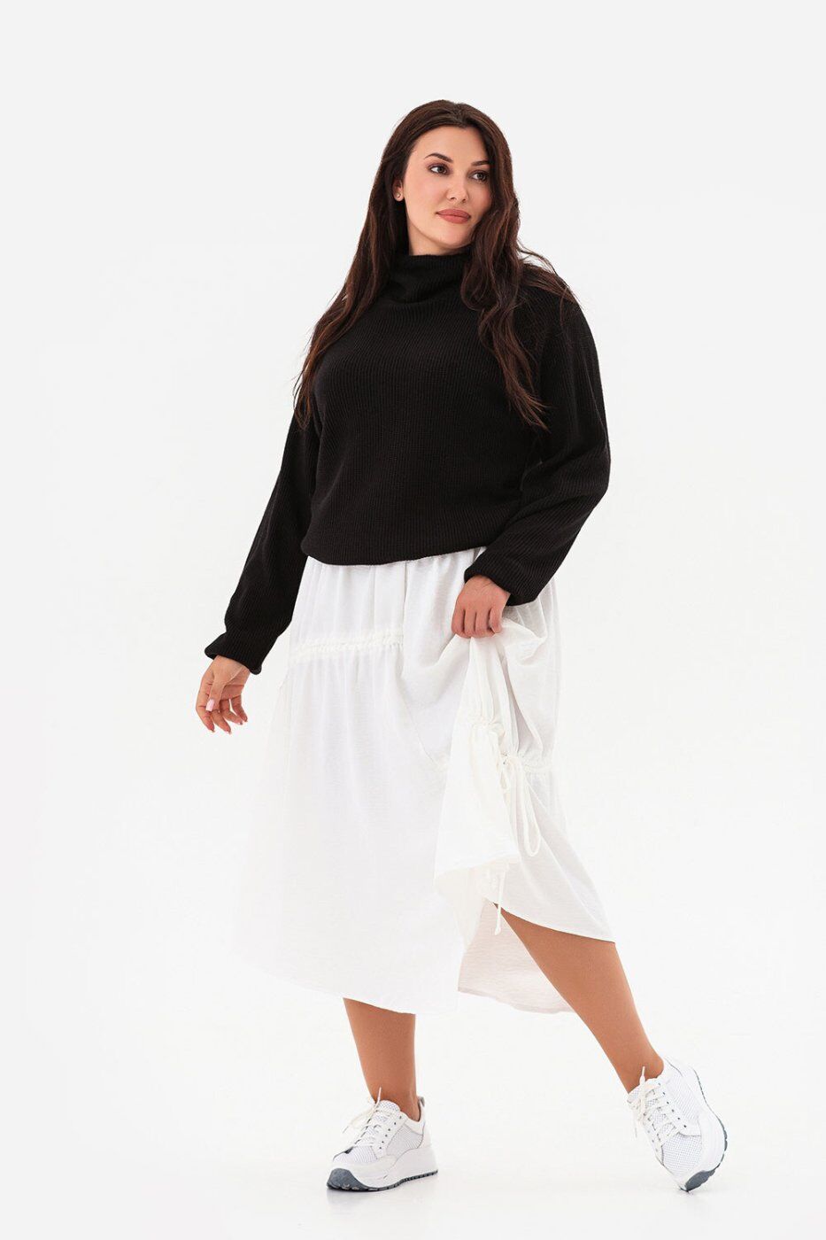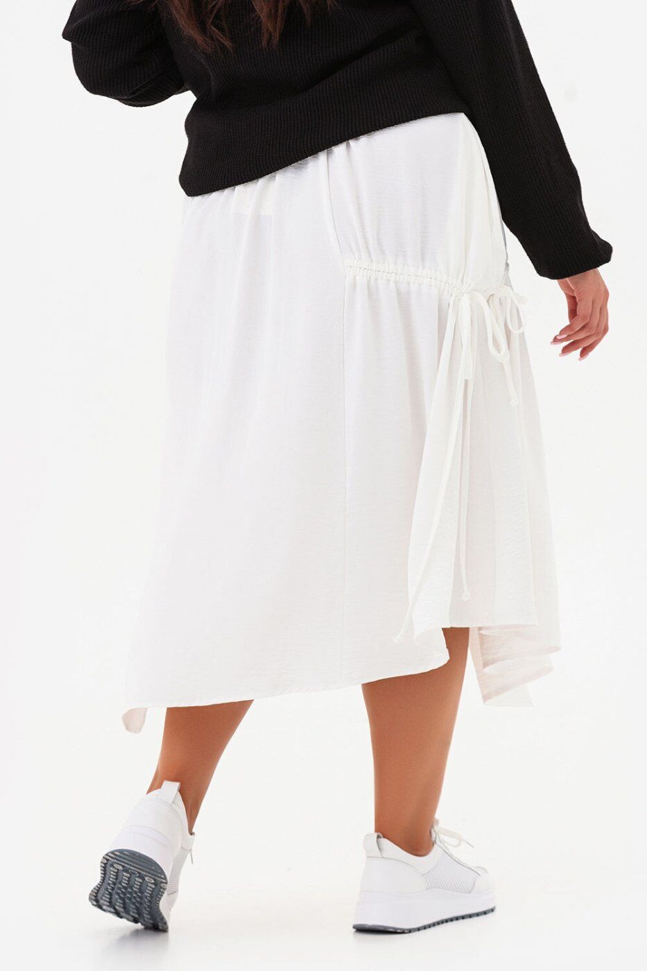 ** Тканина: ** американський креп._x000A_** Пояс: ** резинка._x000A_| Розміри | L | XL | 2XL | 3XL | 4XL | 5XL |_x000A_|:-----------------------------------------|:---:|:---:|:---:|:---:|:---:|:---:|_x000A_| Довжина виробу разом із поясом (см) | 88 | 88 | 88 | 89 | 89 | 89 |_x000A_| Ширина лінії талії (см) | 36 | 38 | 40 | 43 | 46 | 49 |_x000A_* Модна спідниця з асиметрією та драпіровками._x000A_* Ця модель створена для тих, хто цінує сучасний дизайн і можливість трансформації._x000A_* Асиметричні лінії додають образу архітектурності та динаміки, а зав’язки дозволяють змінювати силует під настрій — від більш вільного до зібраного._x000A_* Спідниця органічно поєднується як із масивними светрами крупної в’язки та брутальними черевиками, так і з класичними сорочками чи елегантними топами._x000A_* Завдяки цьому вона легко переходить із кежуального стилю у більш вишуканий, залишаючись актуальною в будь-якому сезоні._x000A_* Легка фактура, продумані драпіровки та комфортна посадка роблять модель не лише стильною, а й зручною для щоденного носіння.