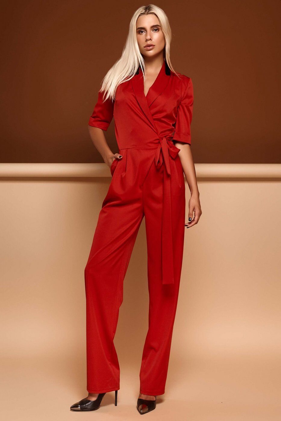 Изюминкой является верх комбинезона, крой блузки «на запах», переходящий к брюкам придает изделию уникальности, рукав до локтя, брюки прямые с косыми карманами дополняют изделие.