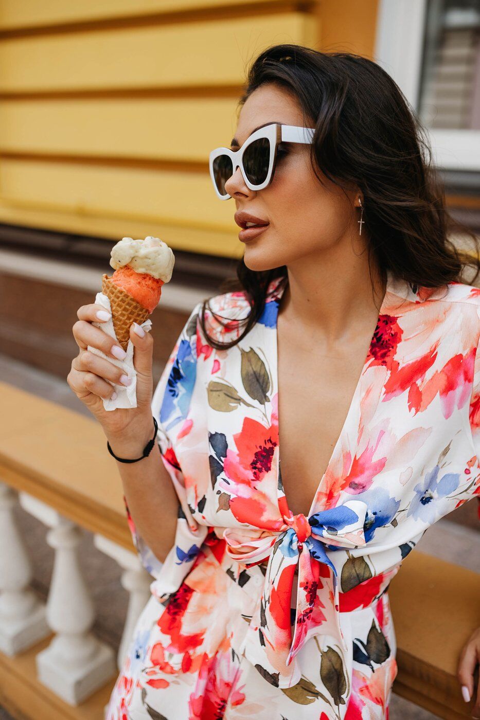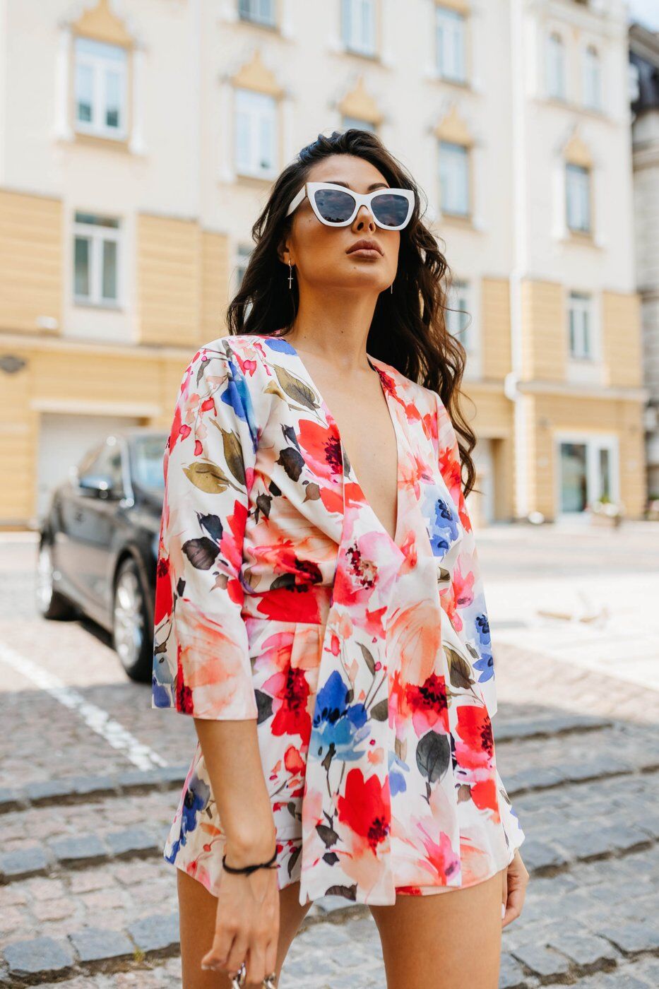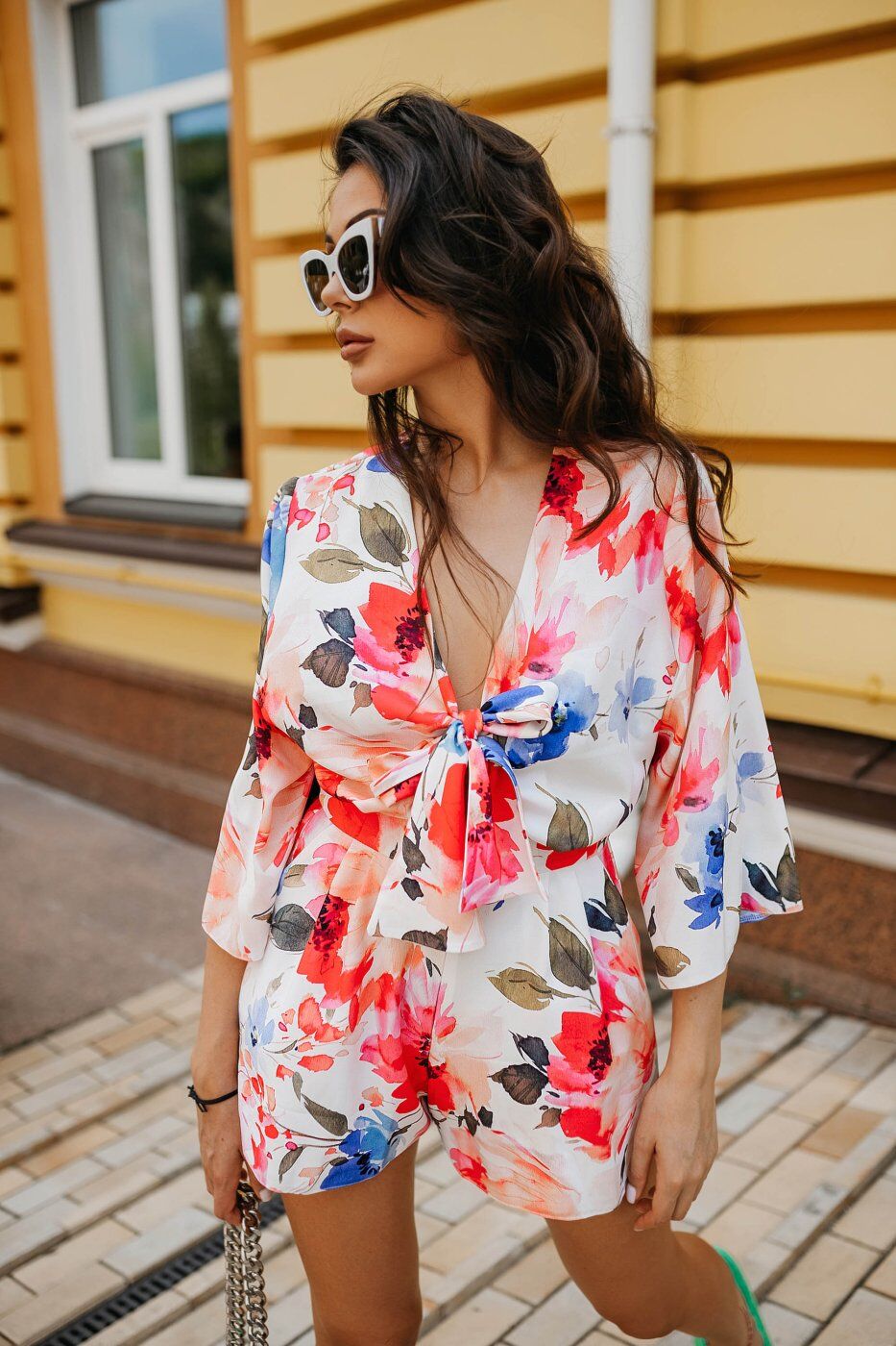 Ефектний комбінезон у яскравих літніх кольорах. Виконаний з приємної яскравої тканини, яка в поєднанні з оригінальним кроєм, надає образу легкий настрій. Модель відрізняє акуратний ліф з зав’язками, короткий широкий рукав та короткі шорти вільного крою. Еластична вставка на поясі забезпечує комфортну посадку.