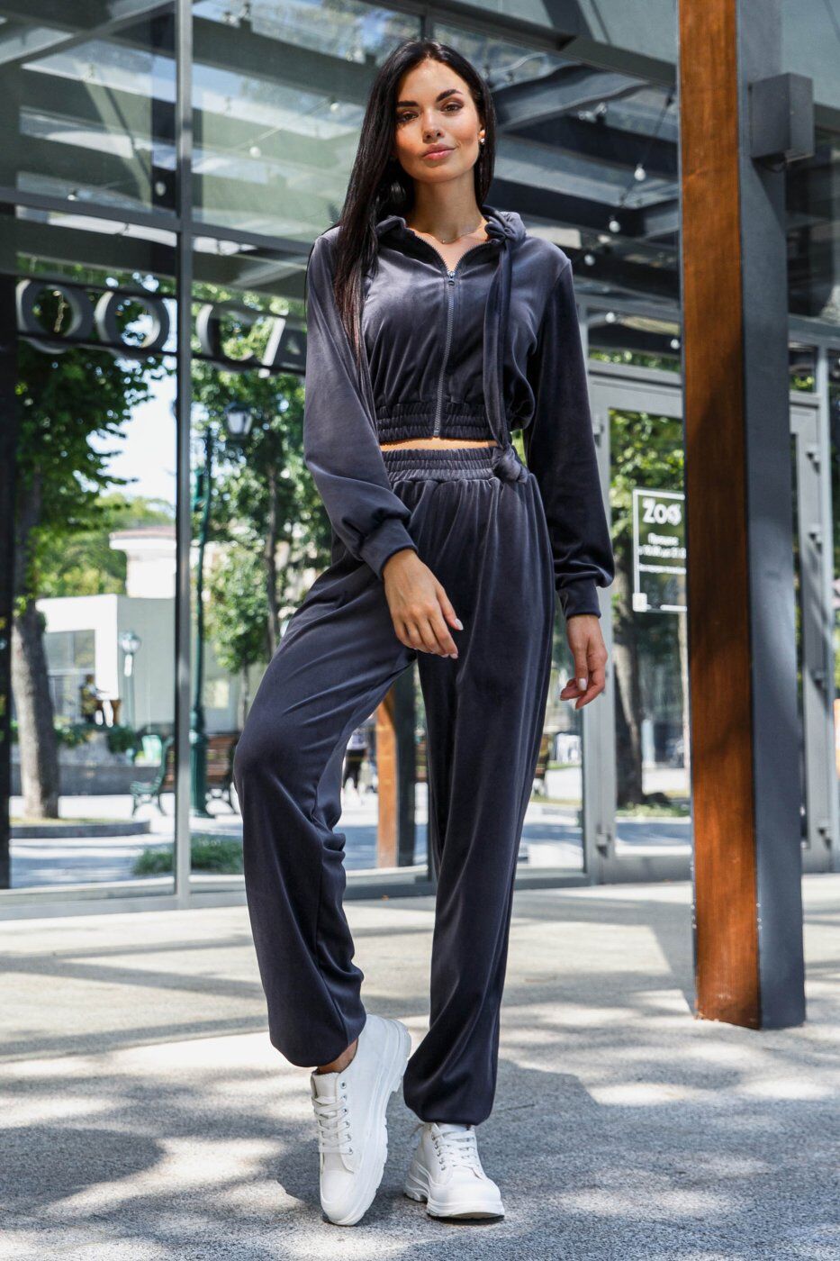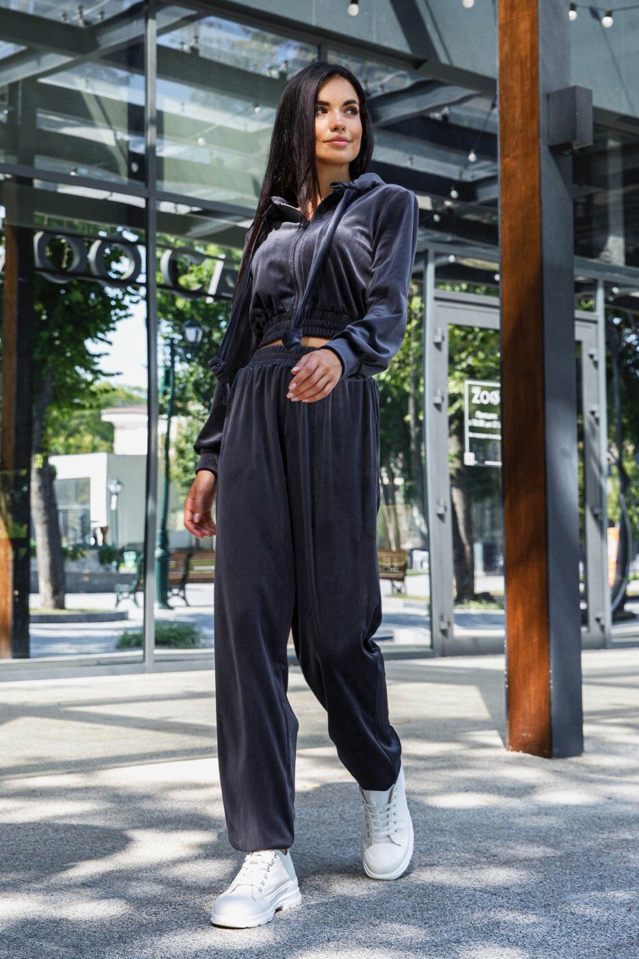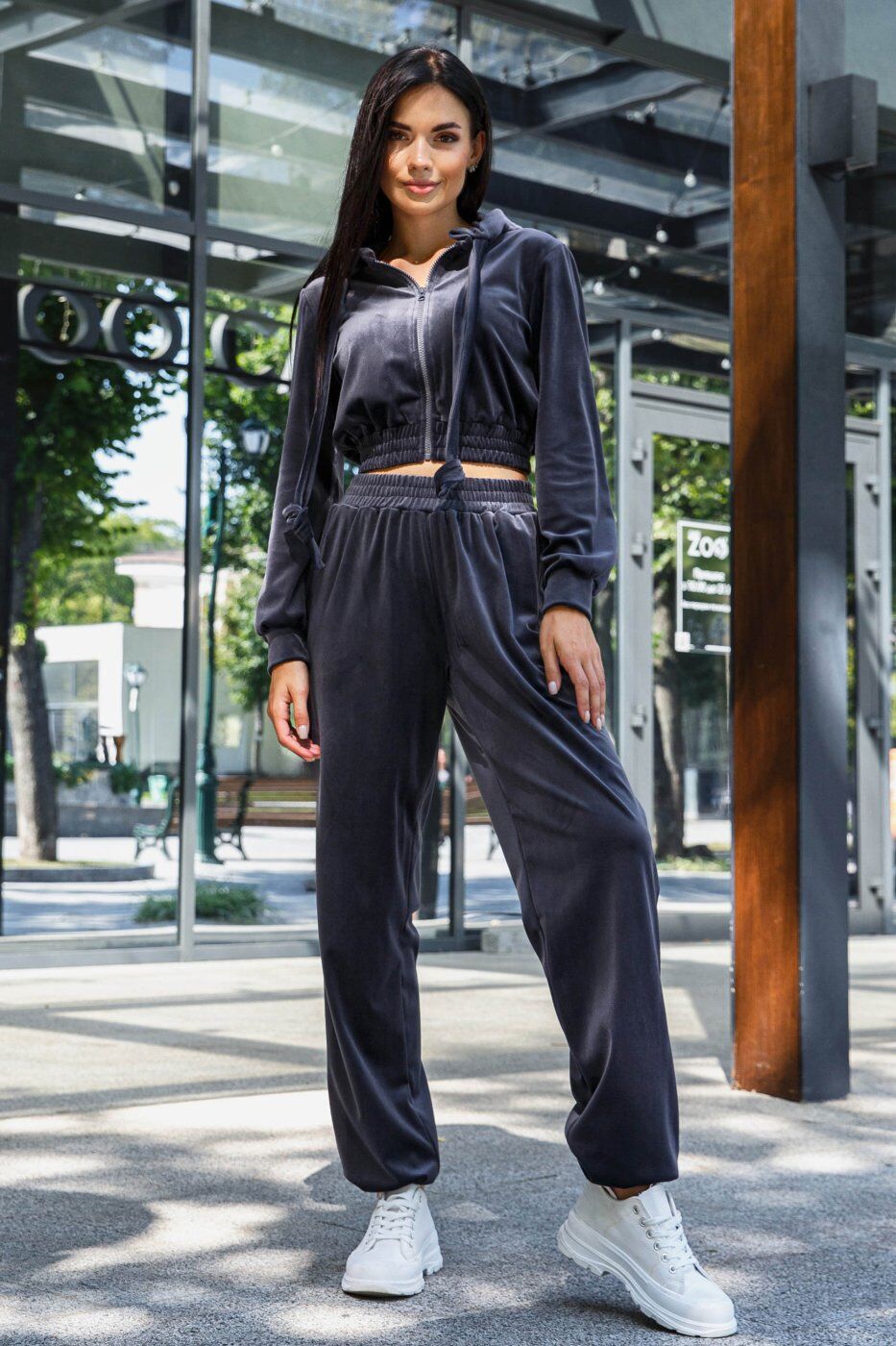 Модний жіночий костюм з велюру у стилі спорт-шик. Наш новий прогулянковий костюм – двійка – чудовий вибір на теплу осінь! Головним критерієм для повсякденного одягу залишається комфорт. У нашій новій моделі Ви почуватиметеся зручно та комфортно, адже це так важливо у сучасному ритмі життя. Модель костюма поєднує у собі світшот з довгими рукавами з капюшоном та комфортні штани.