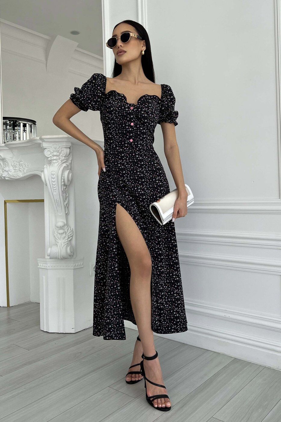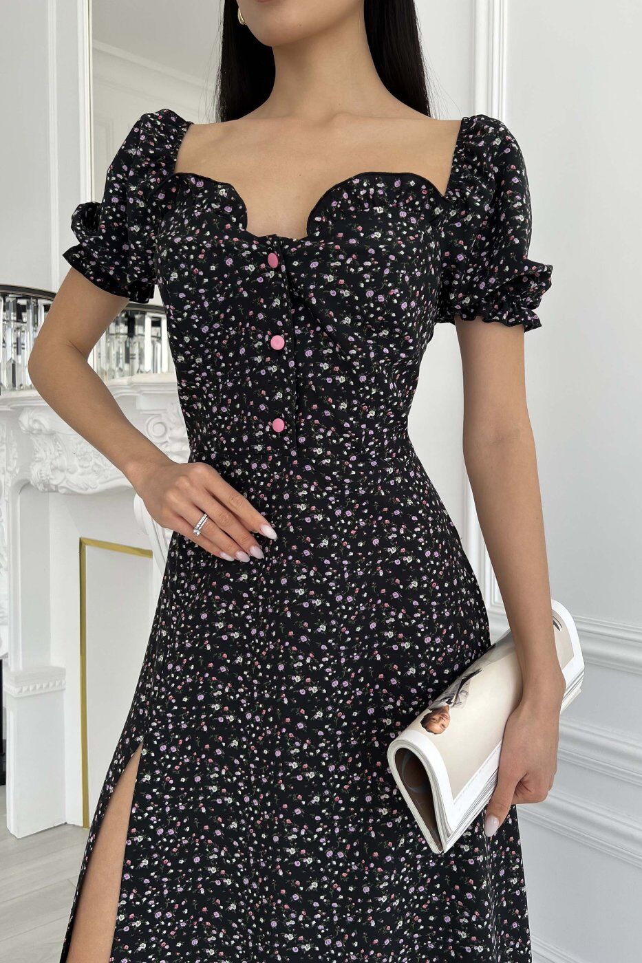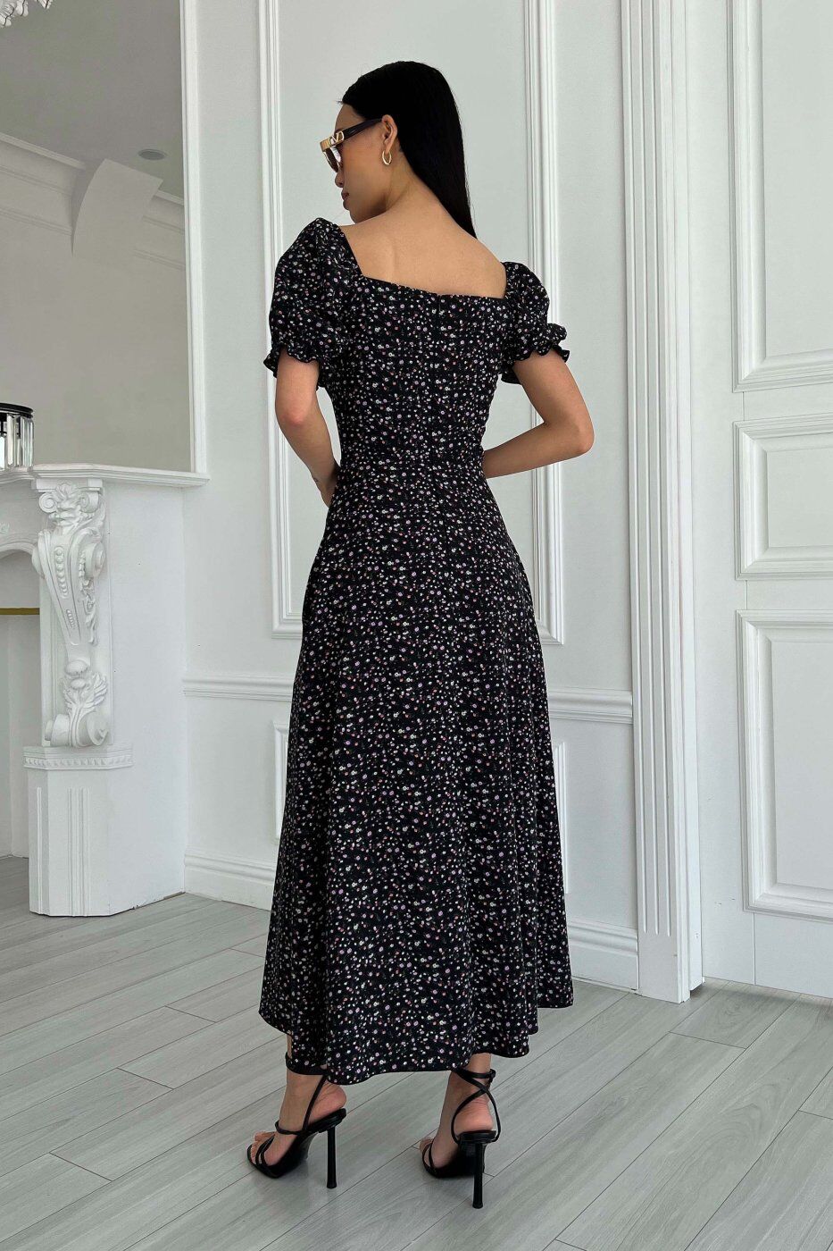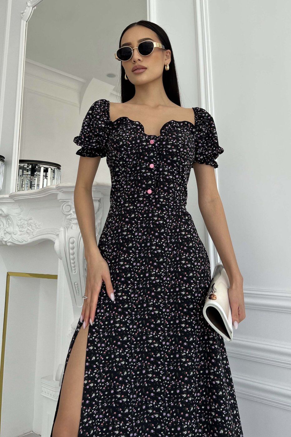 Літня сукня-міді романтичного крою. Виконано з принтованої тканини, що струмує, в дрібний квітковий принт. Модель прикрашає фігурний виріз та оборка по ліфу, що підкреслює зону декольте. Короткий рукав-ліхтарик із еластичною манжетою. Довга спідниця а-силуету підкреслює лінію талії. Збоку передбачено невеликий розріз.
