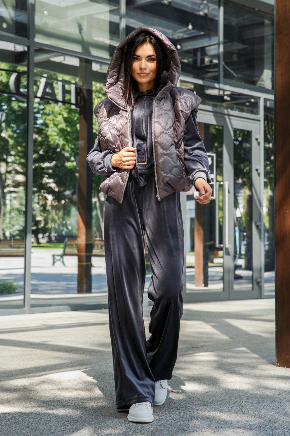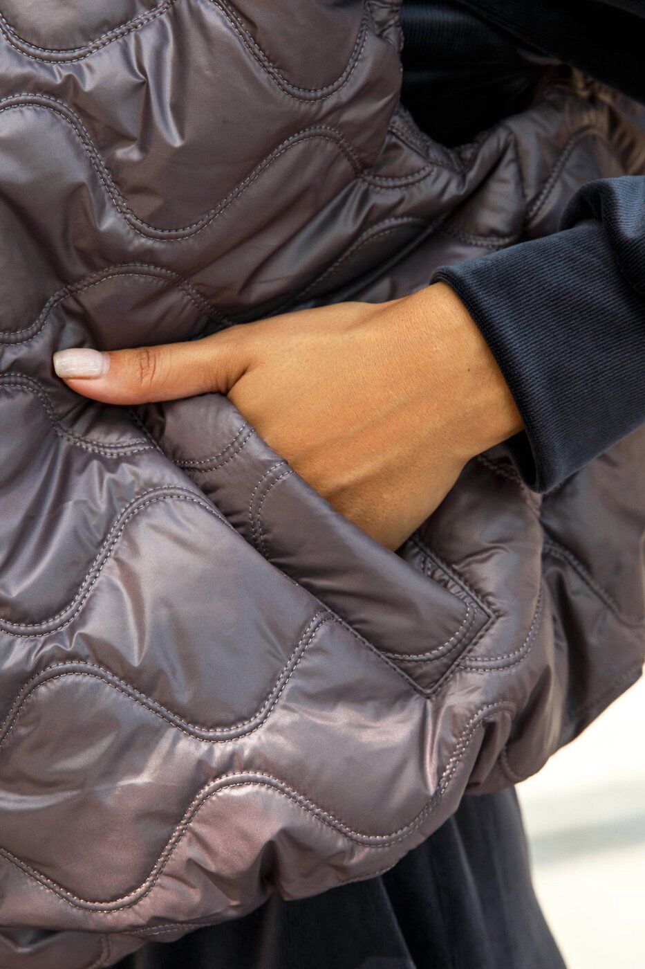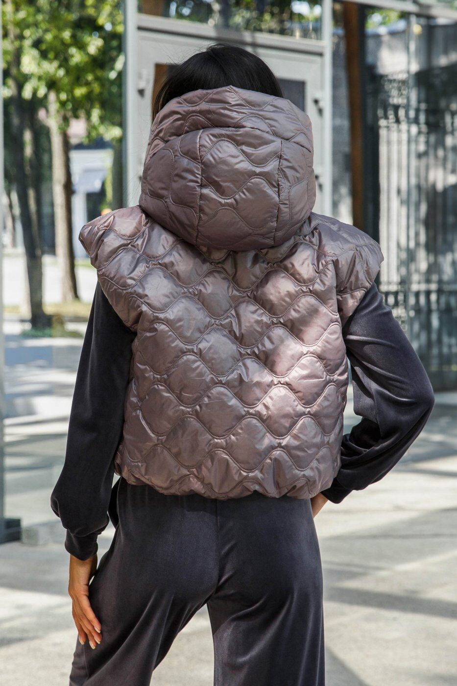 Тканина: стьобана плащівка на синтепоні синтепон (100 г/м2), підклад - жакардова тканина Склад: 100% полиэстер, 100% нейлон Колір: бежевий, чорника, чорний Розмір: S-M, L-XL (розміри спарені) Параметри моделі на фото: Зріст: 170 см, ОГ: 86 см, ОТ: 64 см, ОС: 93 см. На фото на моделі представлена модель розмір S (42/44). Комплектація: жилетка Фактичні виміри виробу: ОГ: S-M-114; L-XL-124 ОТ (по низу жилета, резинка) : S-M-114/130; L-XL-118/139 Довжина виробу по спинці: S-M-53; L-XL-55   Силует: прямий, owersize Рукав: - Застібка: на блискавку Комір (горловина): стійка, капюшон Кишені: лісточка Декоративні елементи: резинка по низу та по проймах   Модна укорочена жилетка на блискавці еластичним елементом на поясі, коміром-стійкою, та об’ємним капюшоном. У моделі передбачені кишені. Особливості: в ролі утеплювача виступає – синтепон (100 г/м2), підклад - нейлон. Неперевершена модель на осінь та на весну, прекрасно підійде і під брюки і під костюм.     Увага! ПОЛІГРАФІЯ НЕ ЗАВЖДИ ПРАВИЛЬНО ПЕРЕДАЄ ВІДТІНОК ТКАНИНИ. Передача кольору на моніторі та телефоні може відрізнятися відтінками з кольором тканини.