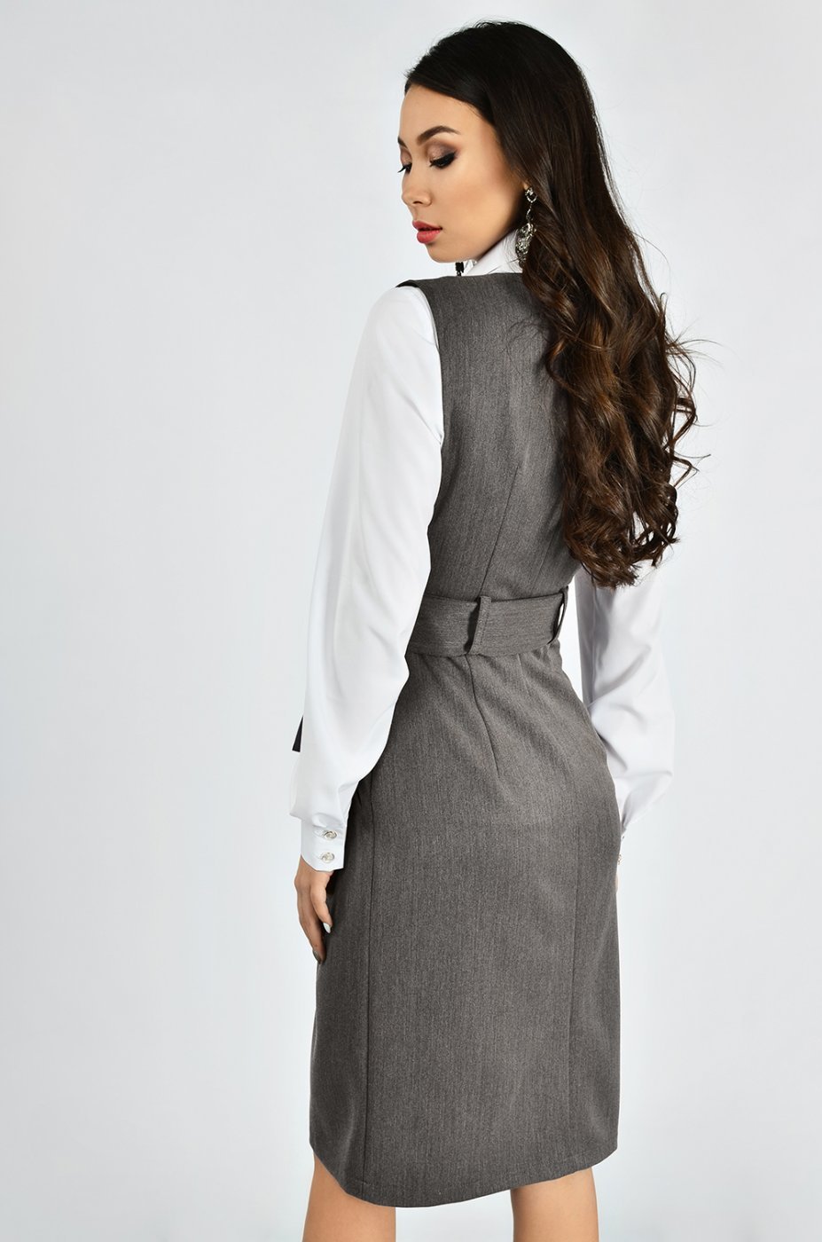 Офисный сарафан из костюмной полушерстянной ткани, который также отлично подойдёт для школьниц и студенток. Продуманное до мелочей дизайнерами «Lipar», это изделие прекрасно дополнит любую блузу, которую Вы также с лёгкостью можете приобрести в нашем интернет-магазине. Прямой приталенный сарафан, отрезной по линии талии. В пояс платья вшиты шлёвки, в которые протянут широкий тканевый поясок, завязывающийся на бант. Вы также можете заменить его на любой другой ремень из Вашего гардеробного арсенала. Верх сарафана имеет глубокий вырез. Юбка выполнена в стиле «карандаш» с небольшим разрезом по центру полочки для удобства при ходьбе. Потайная молния в боковом шве юбки позволит при эксплуатации легко одеть и снять сарафан. По переду полочки расположены два функциональных кармана.