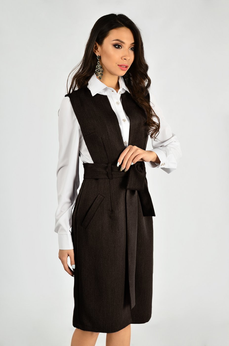 Офисный сарафан из костюмной полушерстянной ткани, который также отлично подойдёт для школьниц и студенток. Продуманное до мелочей дизайнерами «Lipar», это изделие прекрасно дополнит любую блузу, которую Вы также с лёгкостью можете приобрести в нашем интернет-магазине. Прямой приталенный сарафан, отрезной по линии талии. В пояс платья вшиты шлёвки, в которые протянут широкий тканевый поясок, завязывающийся на бант. Вы также можете заменить его на любой другой ремень из Вашего гардеробного арсенала. Верх сарафана имеет глубокий вырез. Юбка выполнена в стиле «карандаш» с небольшим разрезом по центру полочки для удобства при ходьбе. Потайная молния в боковом шве юбки позволит при эксплуатации легко одеть и снять сарафан. По переду полочки расположены два функциональных кармана.