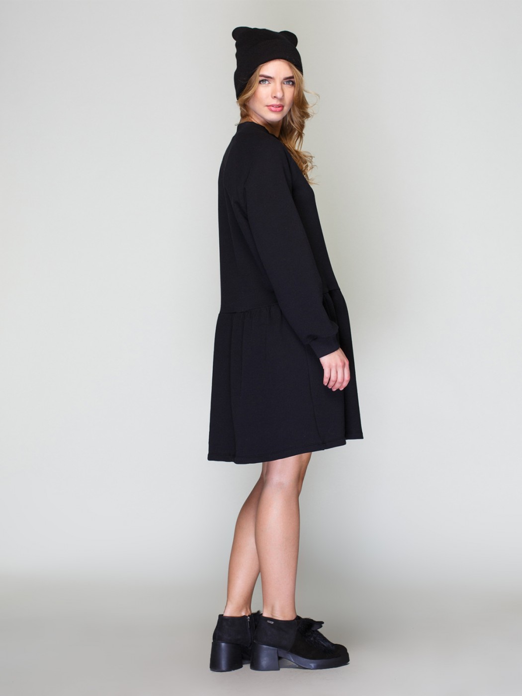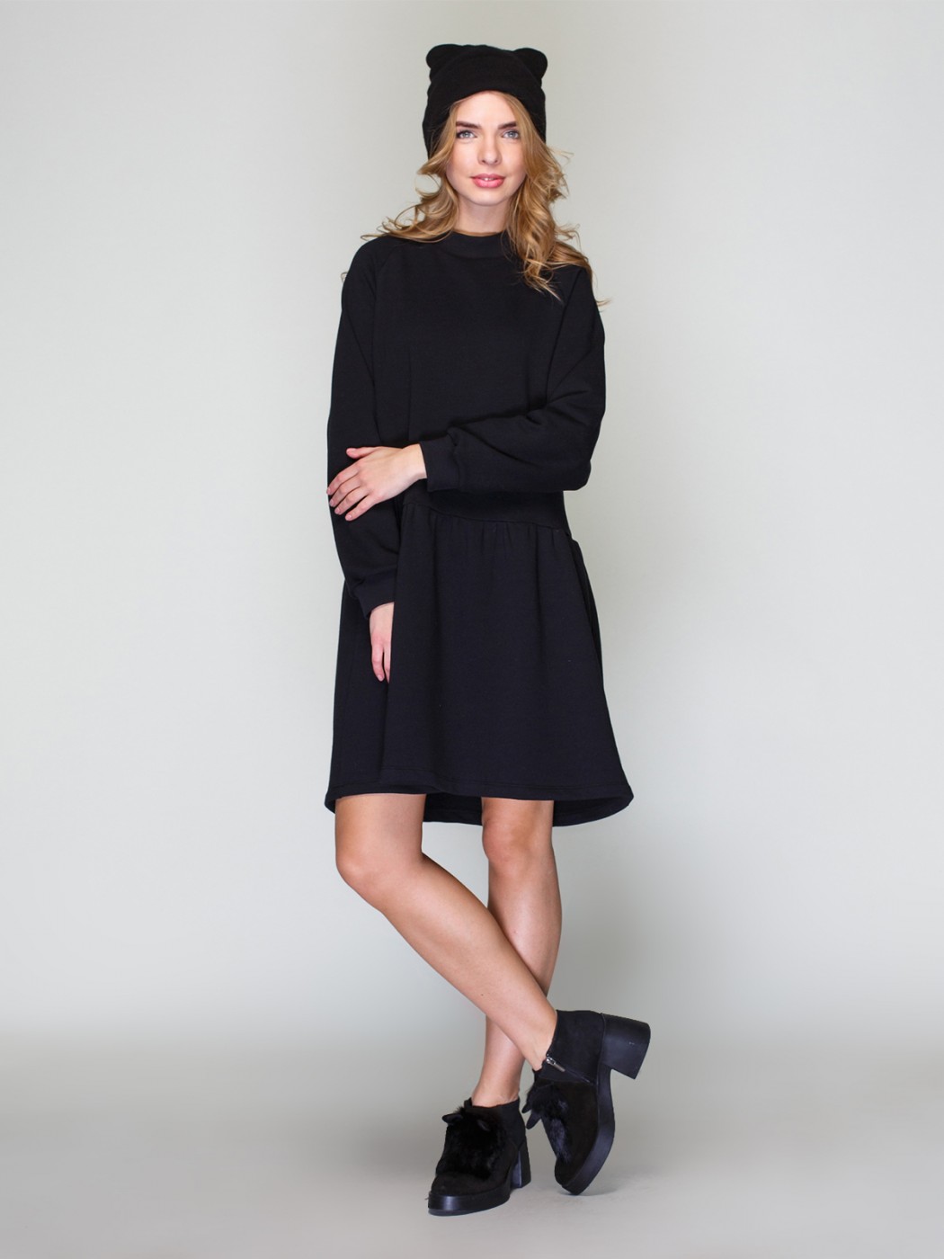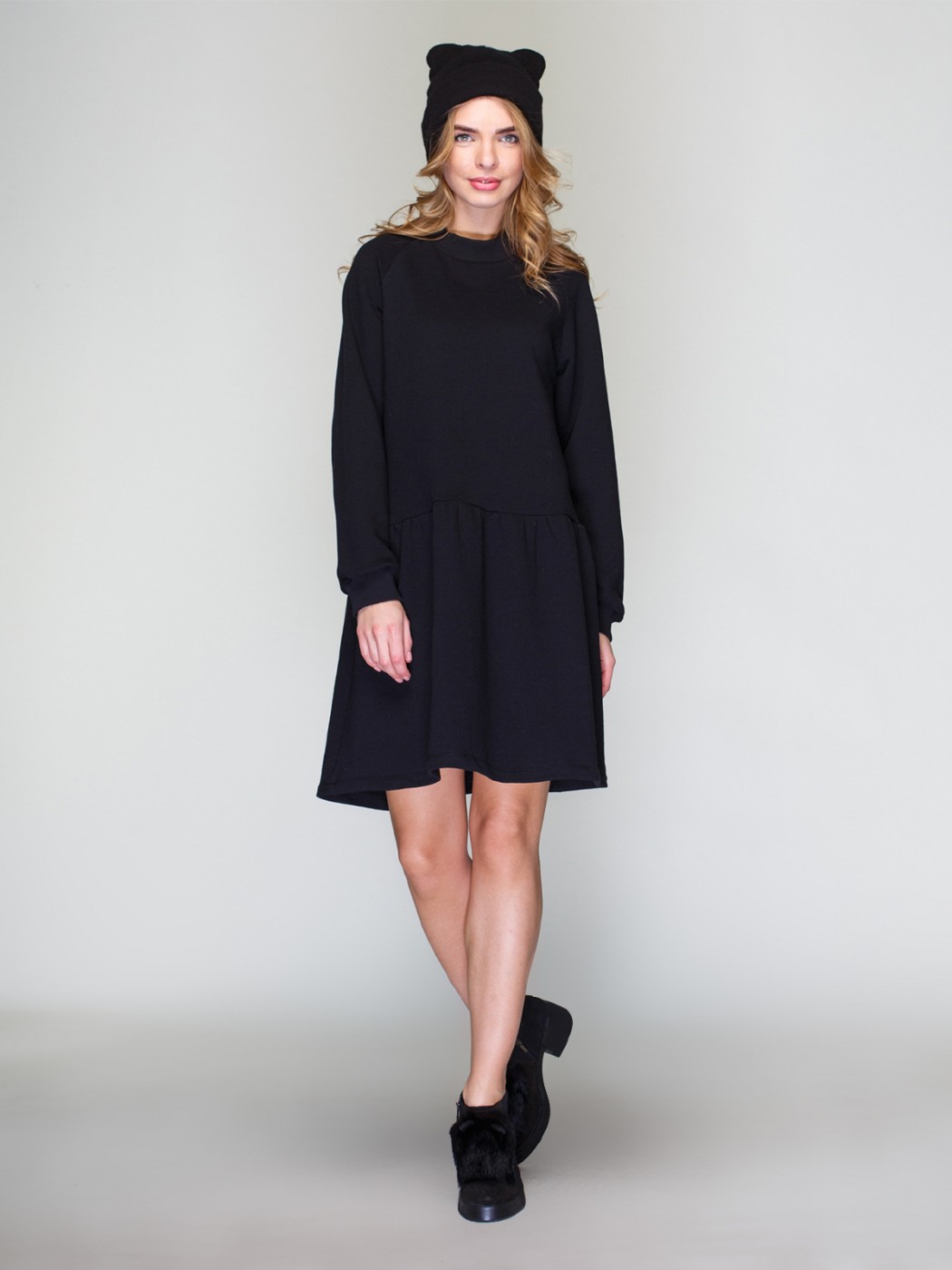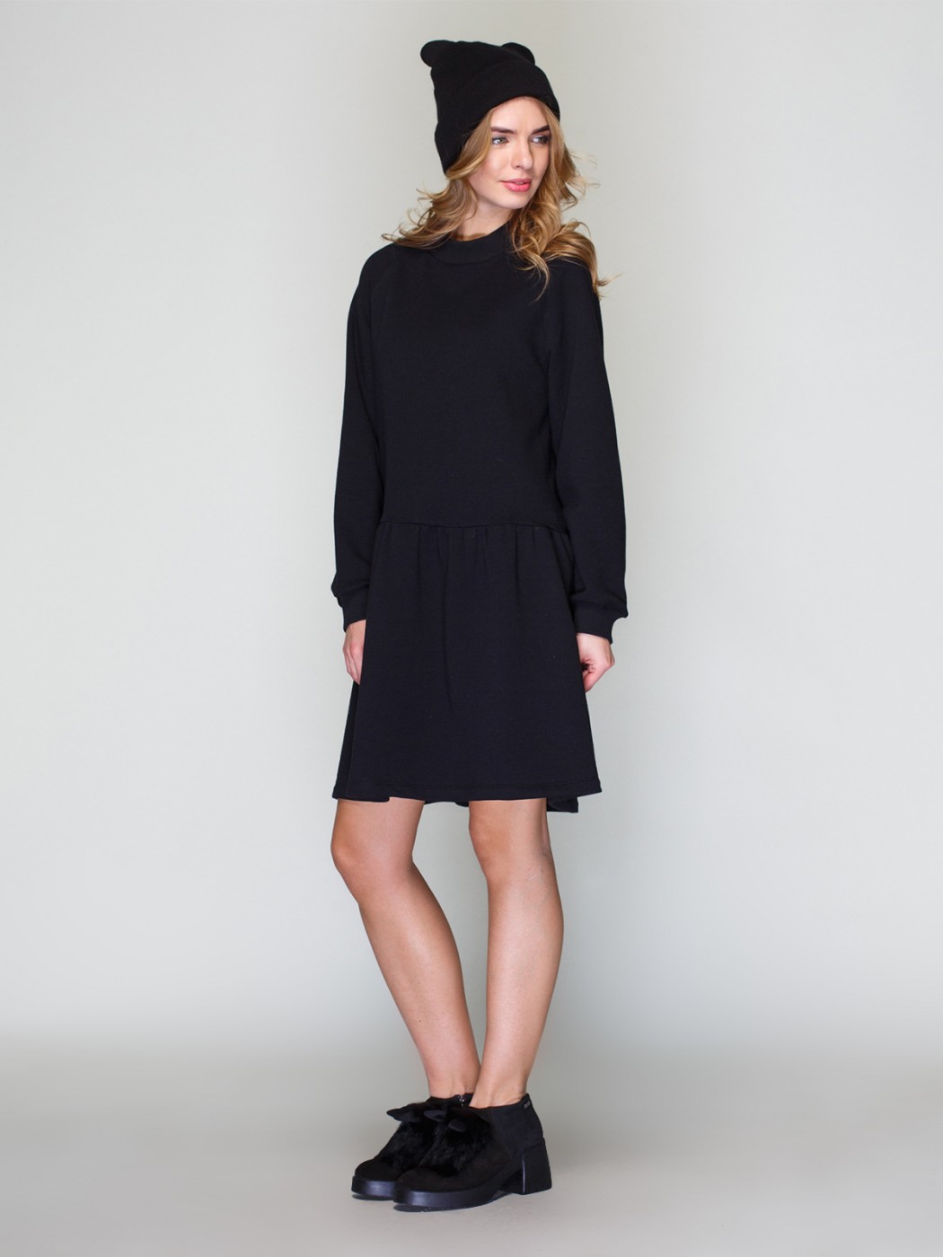 Короткое платье свободного силуэта с длинным рукавом на эластичной манжете и круглой горловиной, выполненное из мягкой ткани.