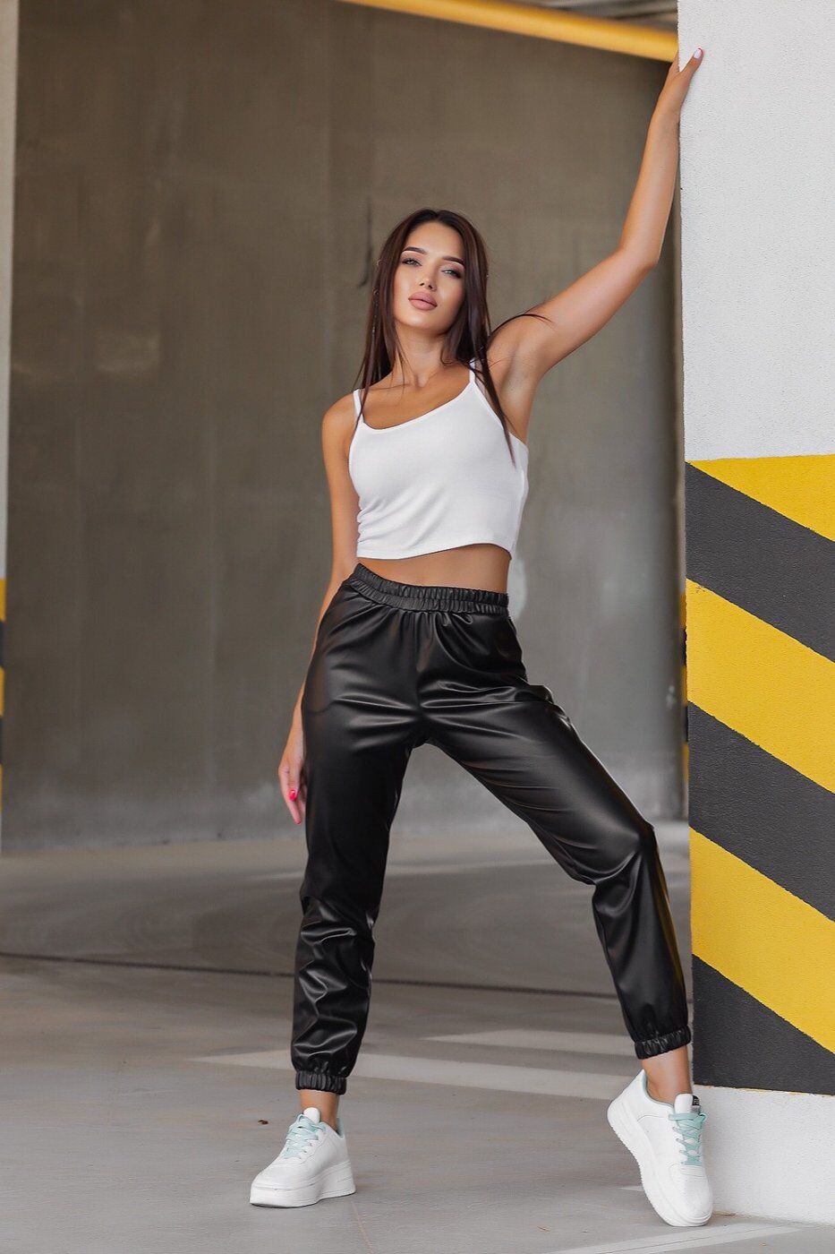 Трендовые джоггеры из турецкой эко-кожи (слегка эластичная). Пояс на резинке, брючины внизу тоже на резинке. По бокам карманы-хулиганы.