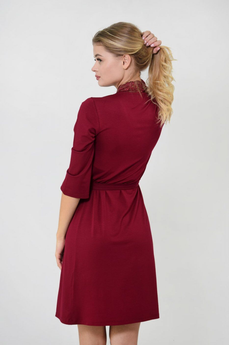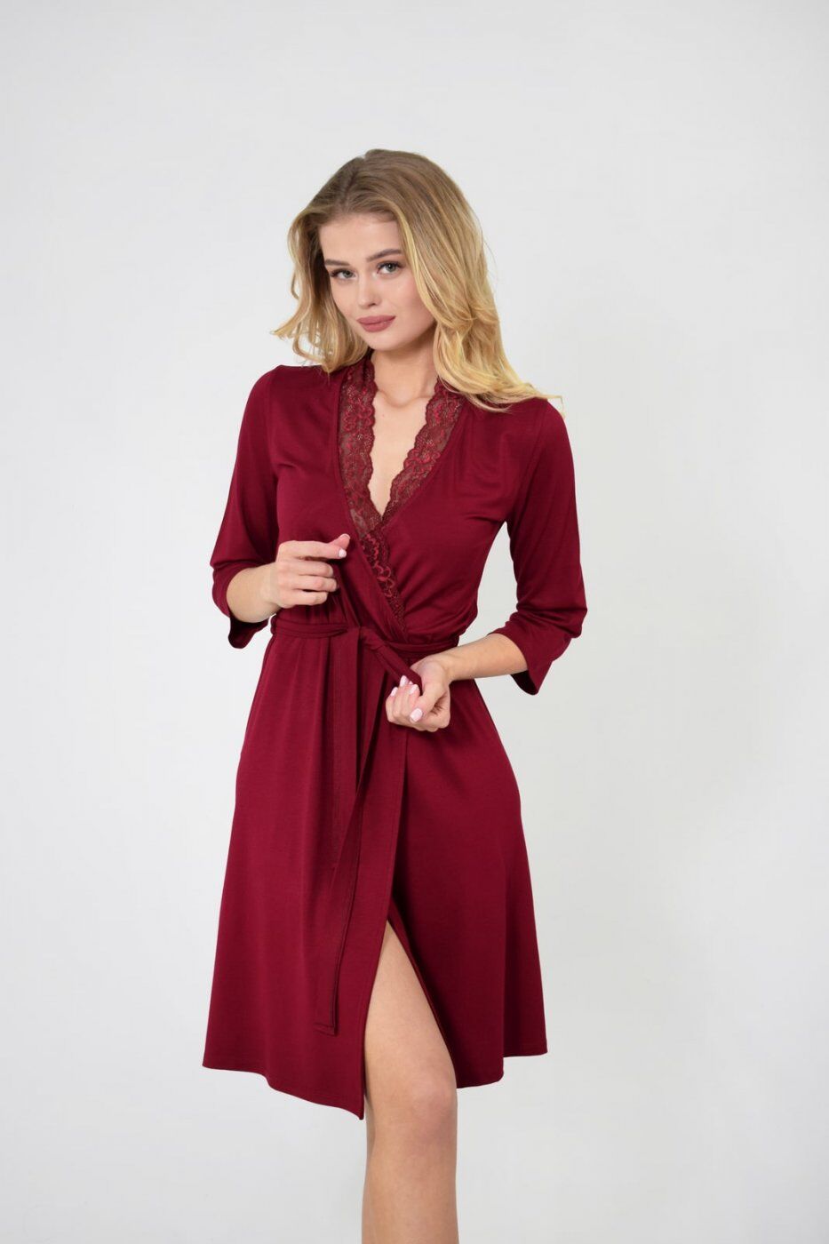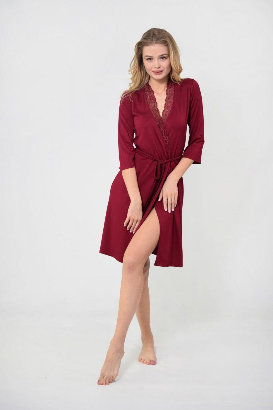 Роскошный домашний халат с отделкой кружева в зоне воротника.