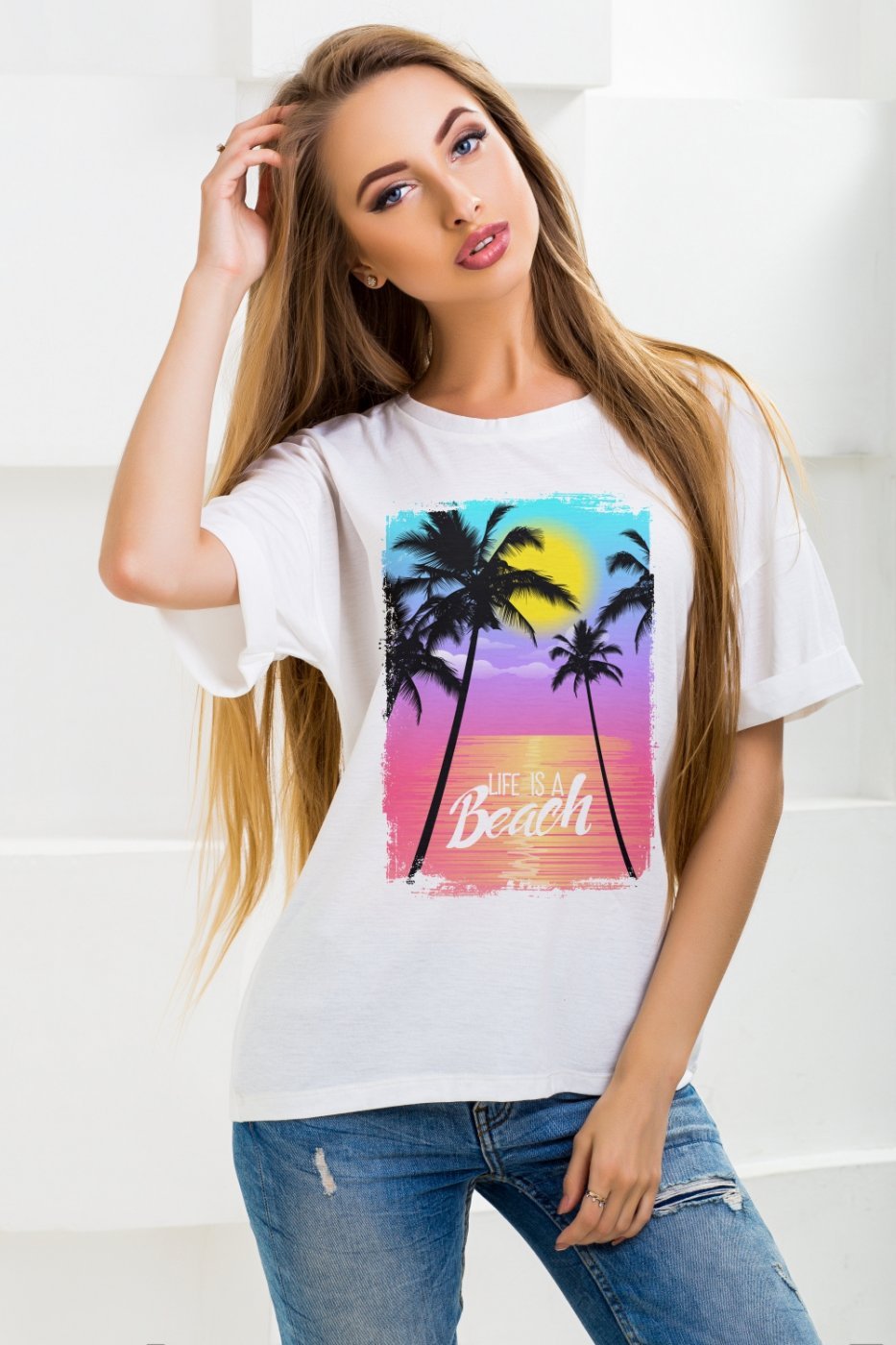 Свободная женская футболка, в стиле оверсайз. Модель с округлым вырезом горловины. Декорирована принтом. Отличный выбор для повседневного городского стиля.