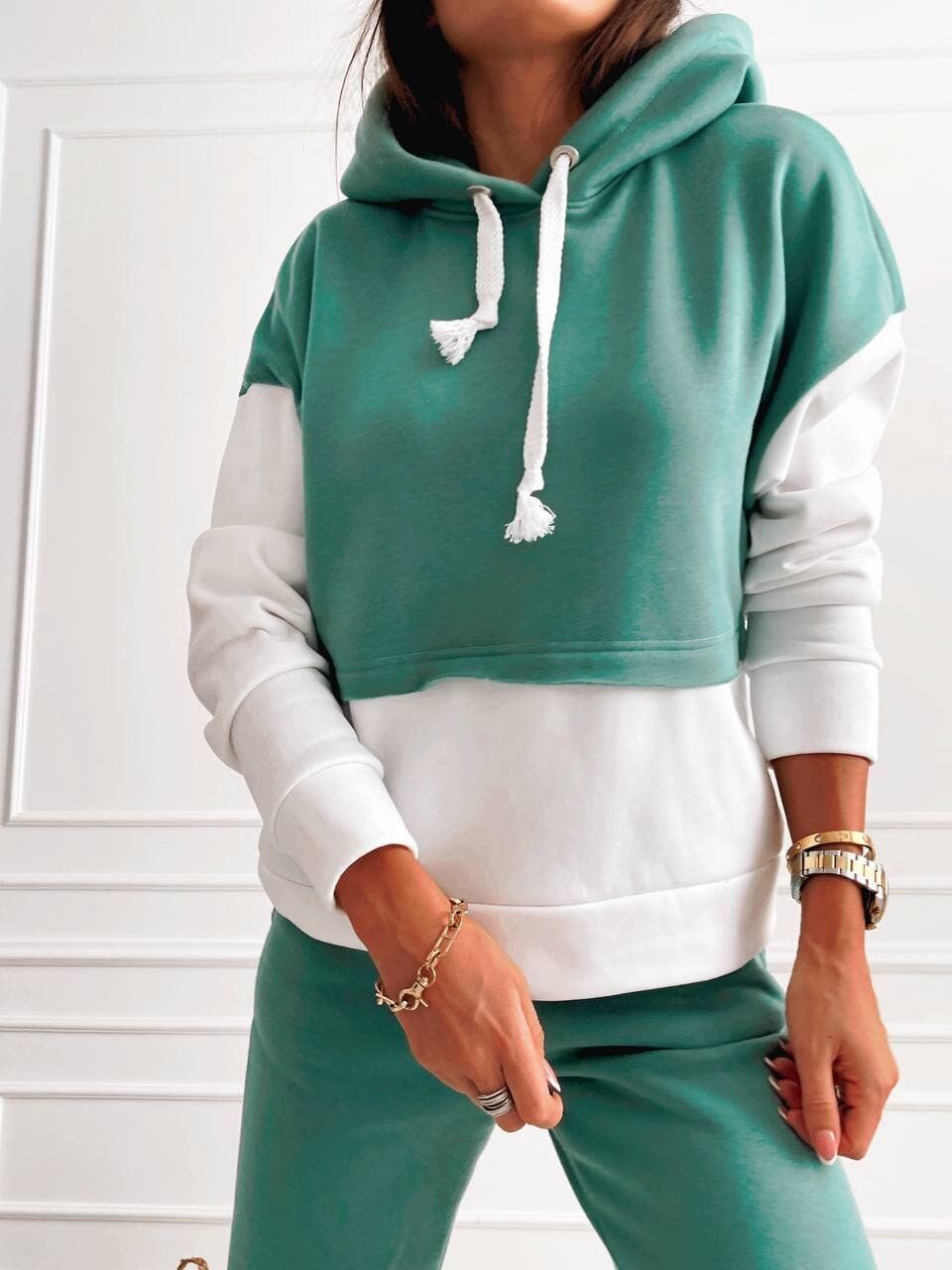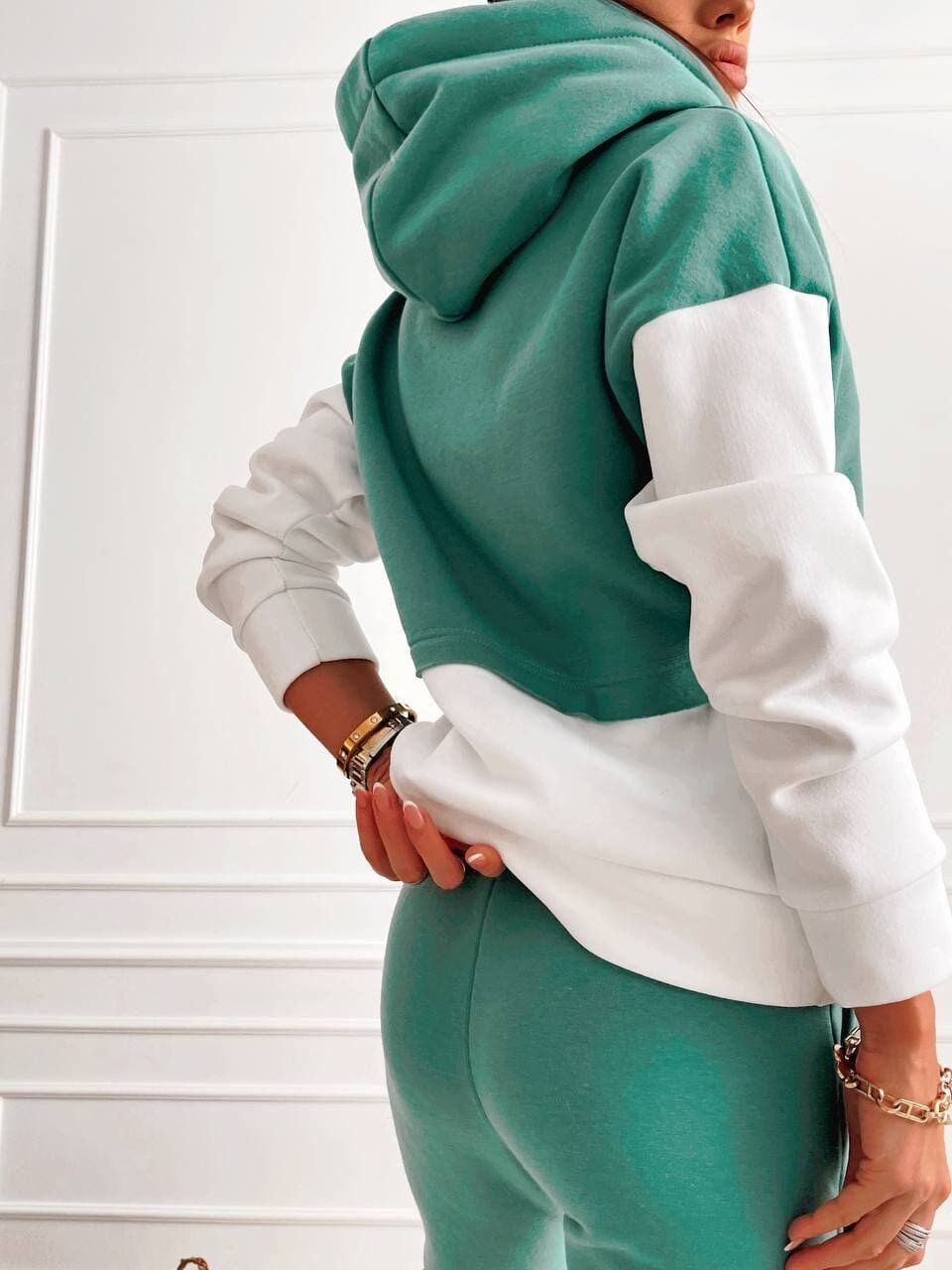 2-х цветный спортивный костюм из утепленного трикотажа. Штаны с манжетами на резинке, толстовка с капюшоном.