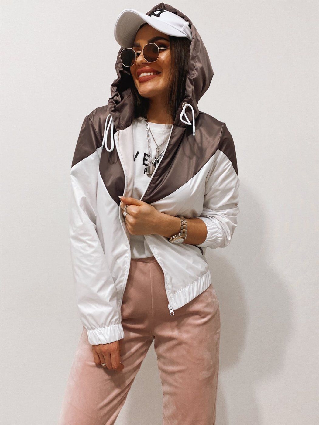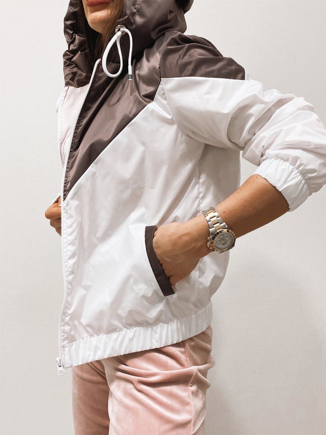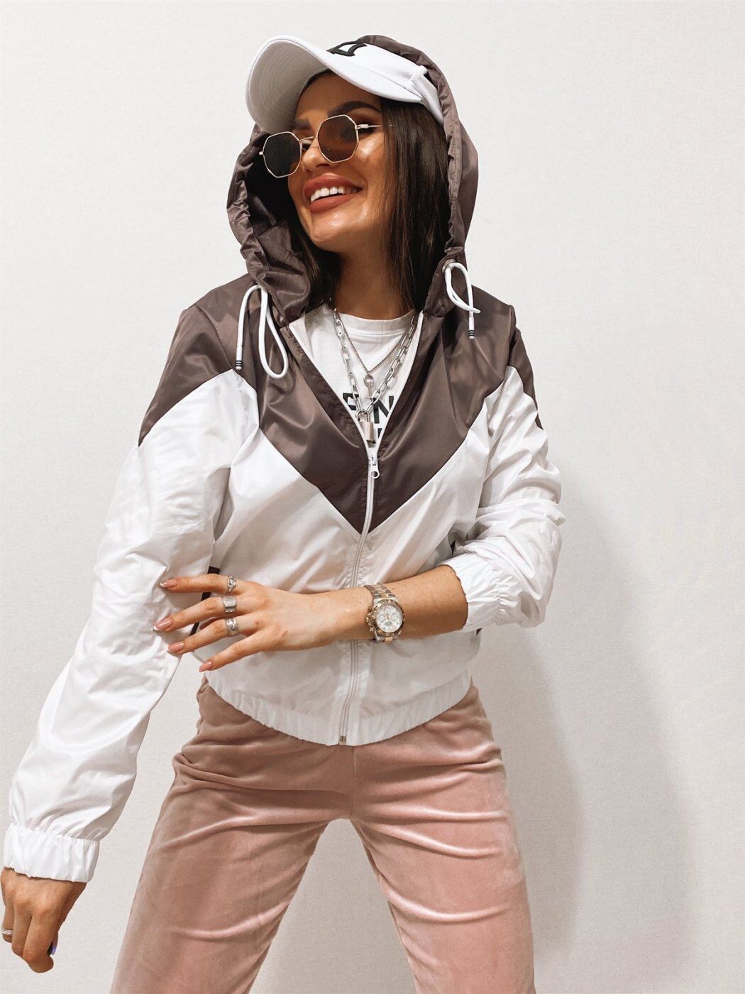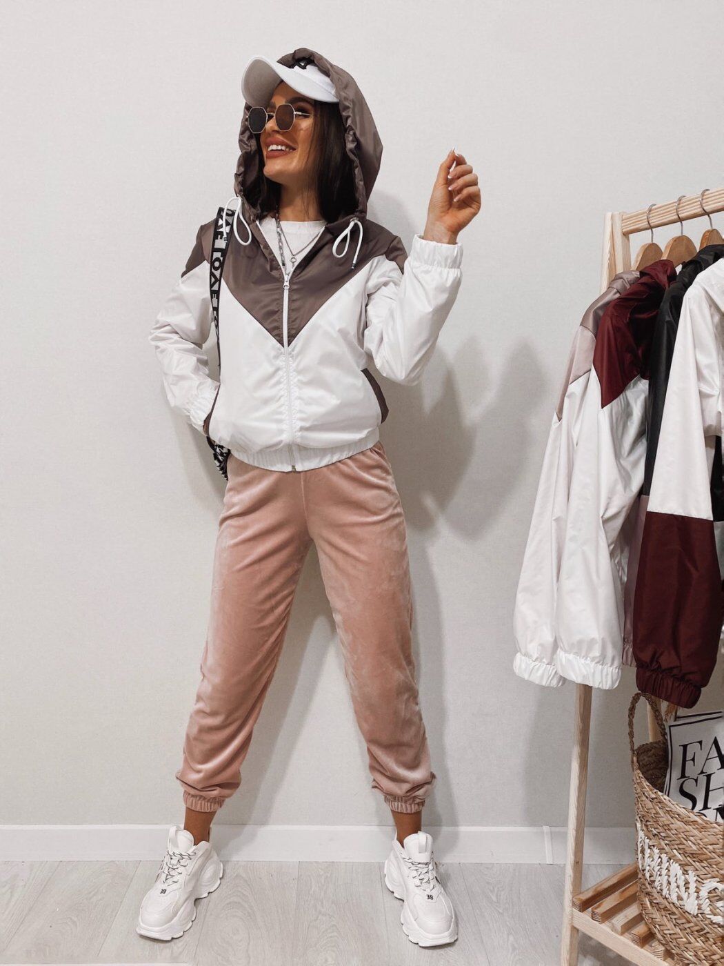 Стильный женский прогулочный костюм с яркими цветными вставками на груди.