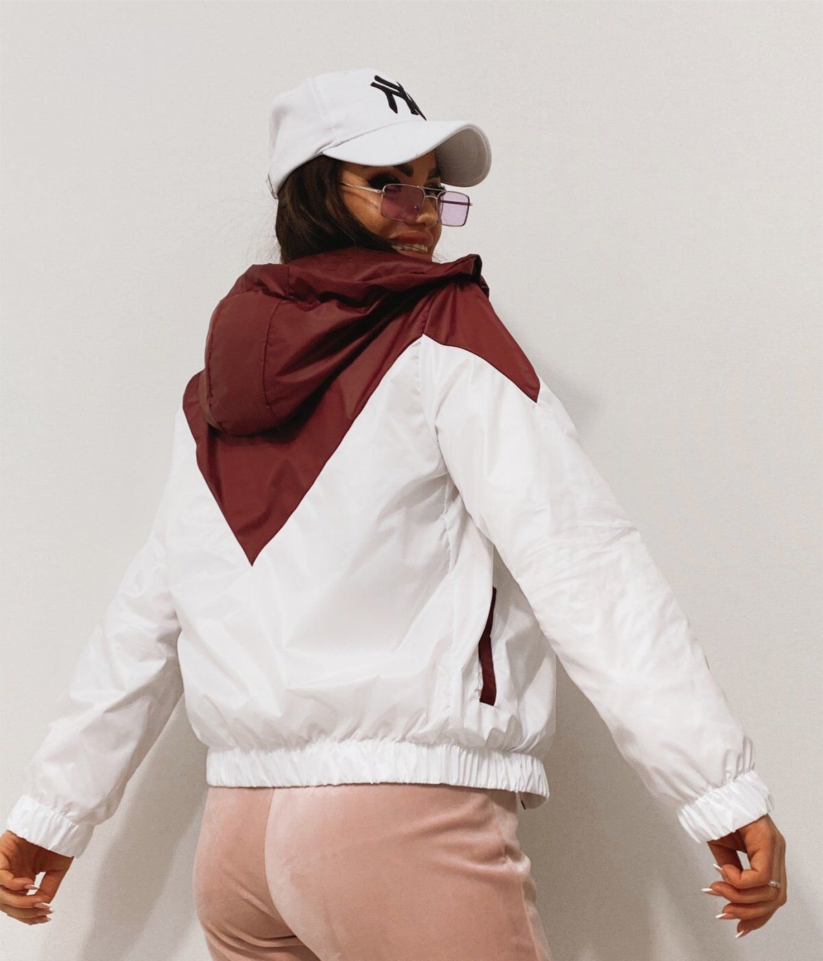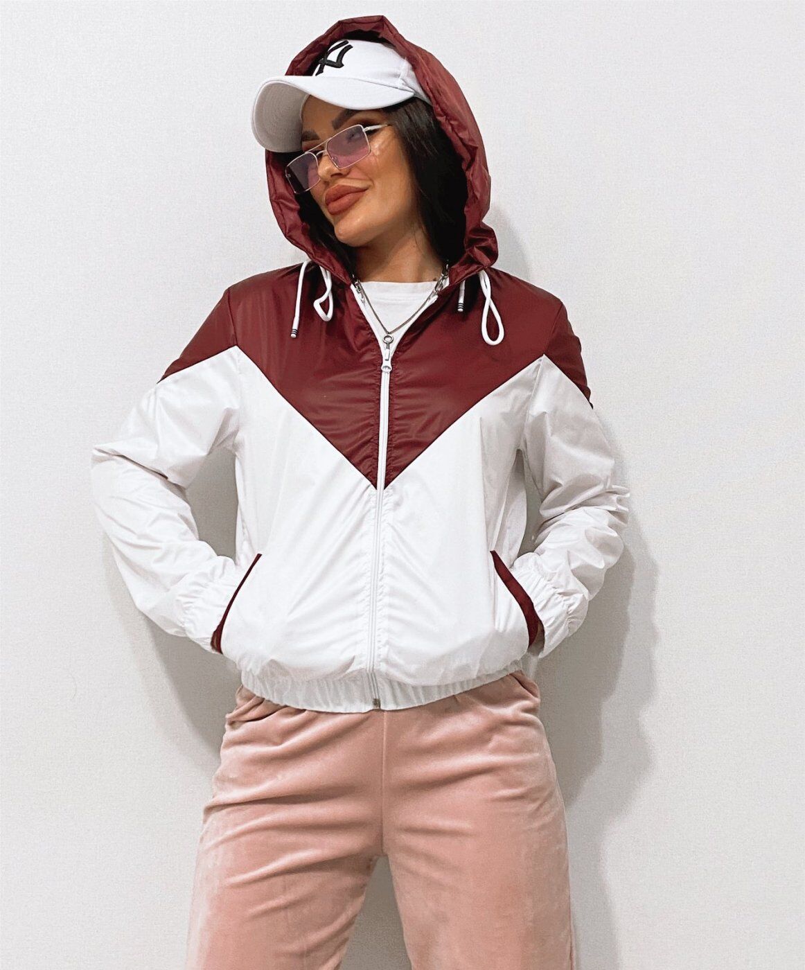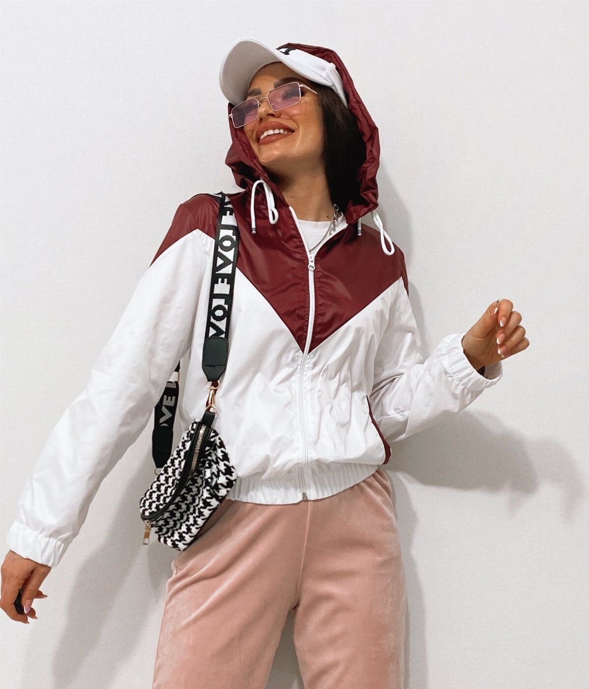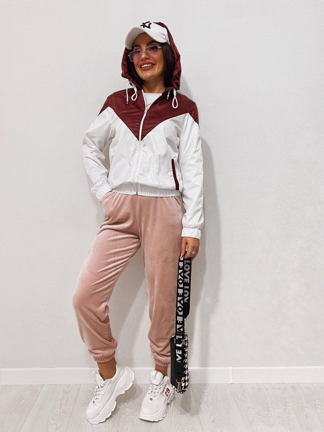 Стильный женский прогулочный костюм с яркими цветными вставками на груди.